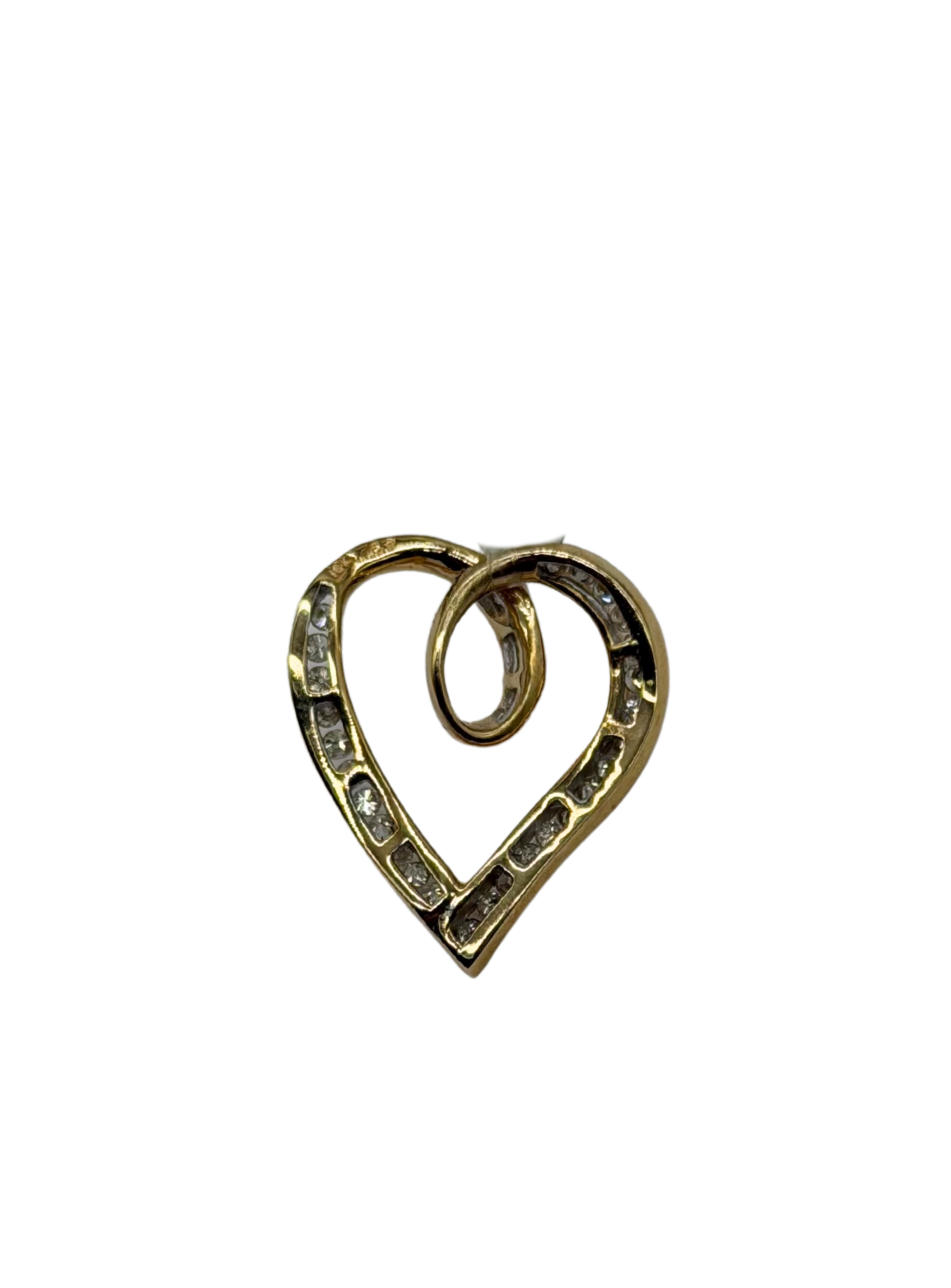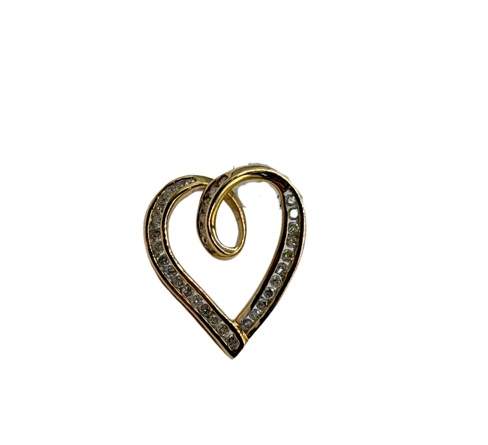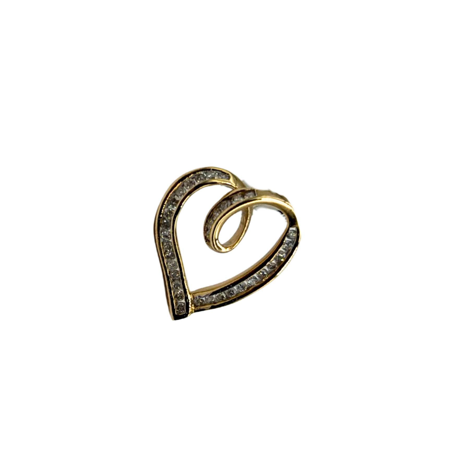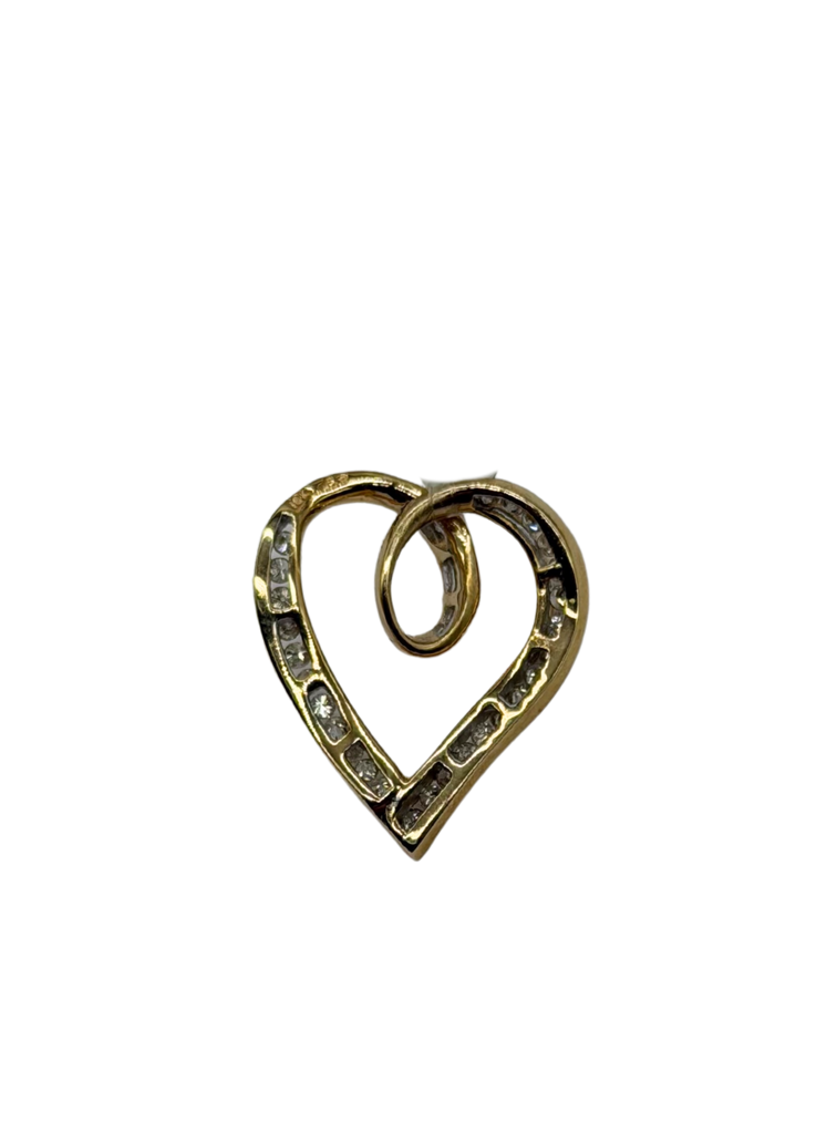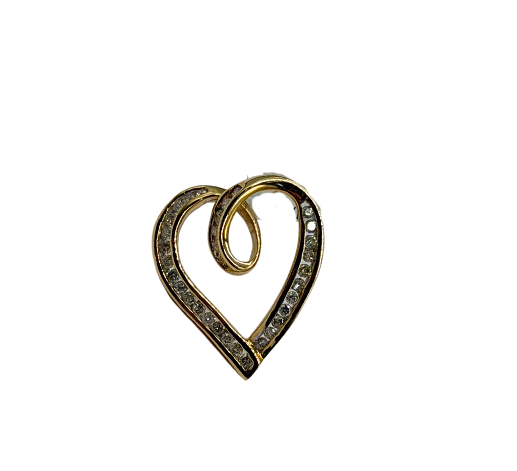 A timeless symbol of love and elegance, this 10k yellow gold heart pendant features a graceful open-heart silhouette wrapped in a flowing swirl design. Each channel-set diamond is securely nestled along the outer curve, adding a soft, sparkling trail of light that catches beautifully from every angle. Lightweight yet refined, this piece is perfect for everyday wear or as a meaningful gift for someone special.