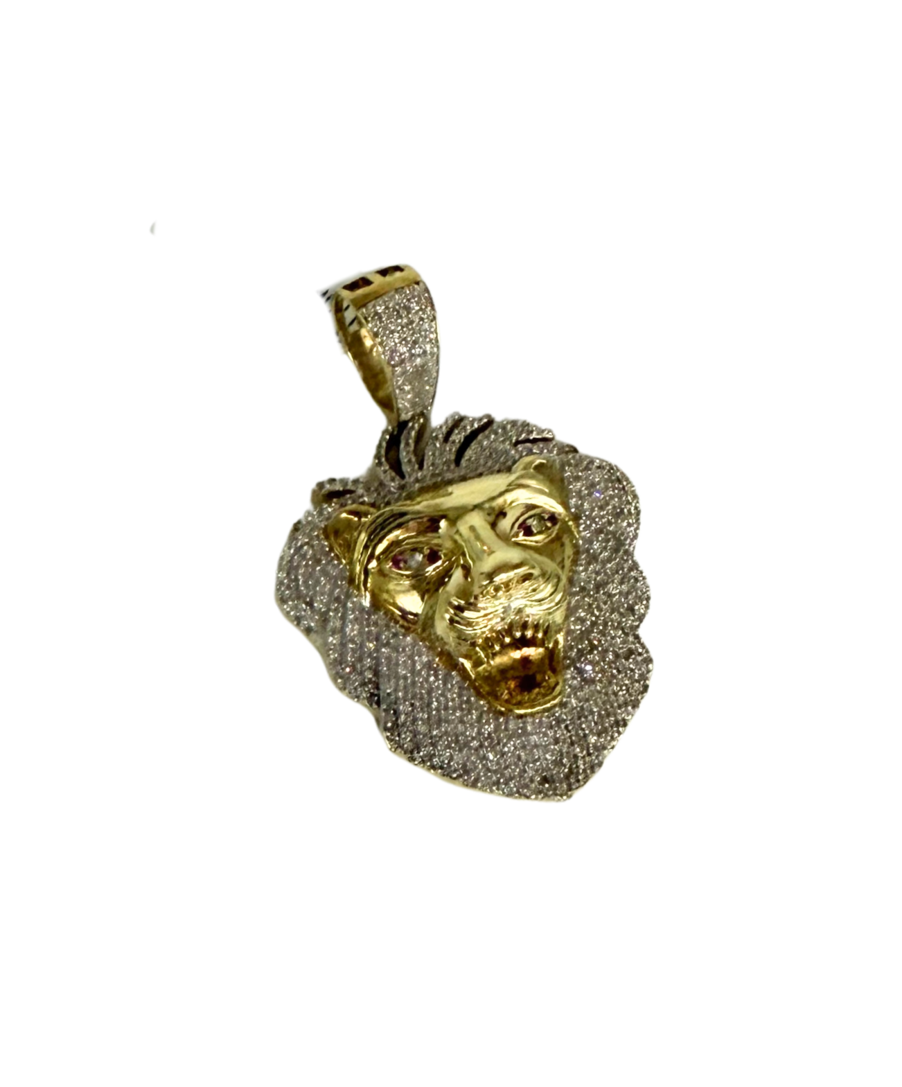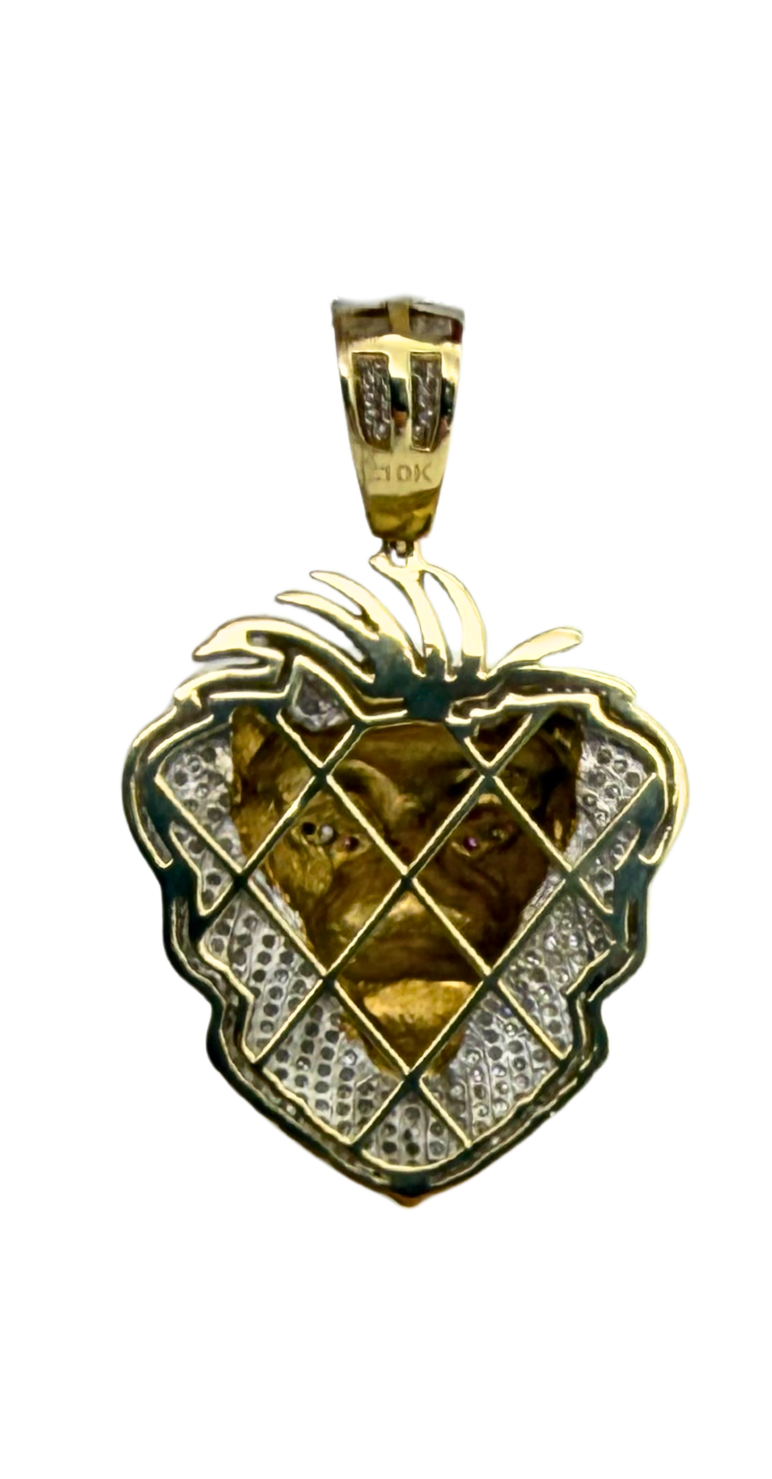 This bold and powerful 10k yellow gold lion head pendant is an eye-catching statement piece featuring approximately 2 carats total weight of brilliant diamonds. The lion’s mane is fully encrusted with sparkling diamonds, creating incredible brilliance and contrast against the polished yellow gold face. Ruby gemstone eyes add a striking pop of color and lifelike intensity, enhancing the fierce and regal appearance.