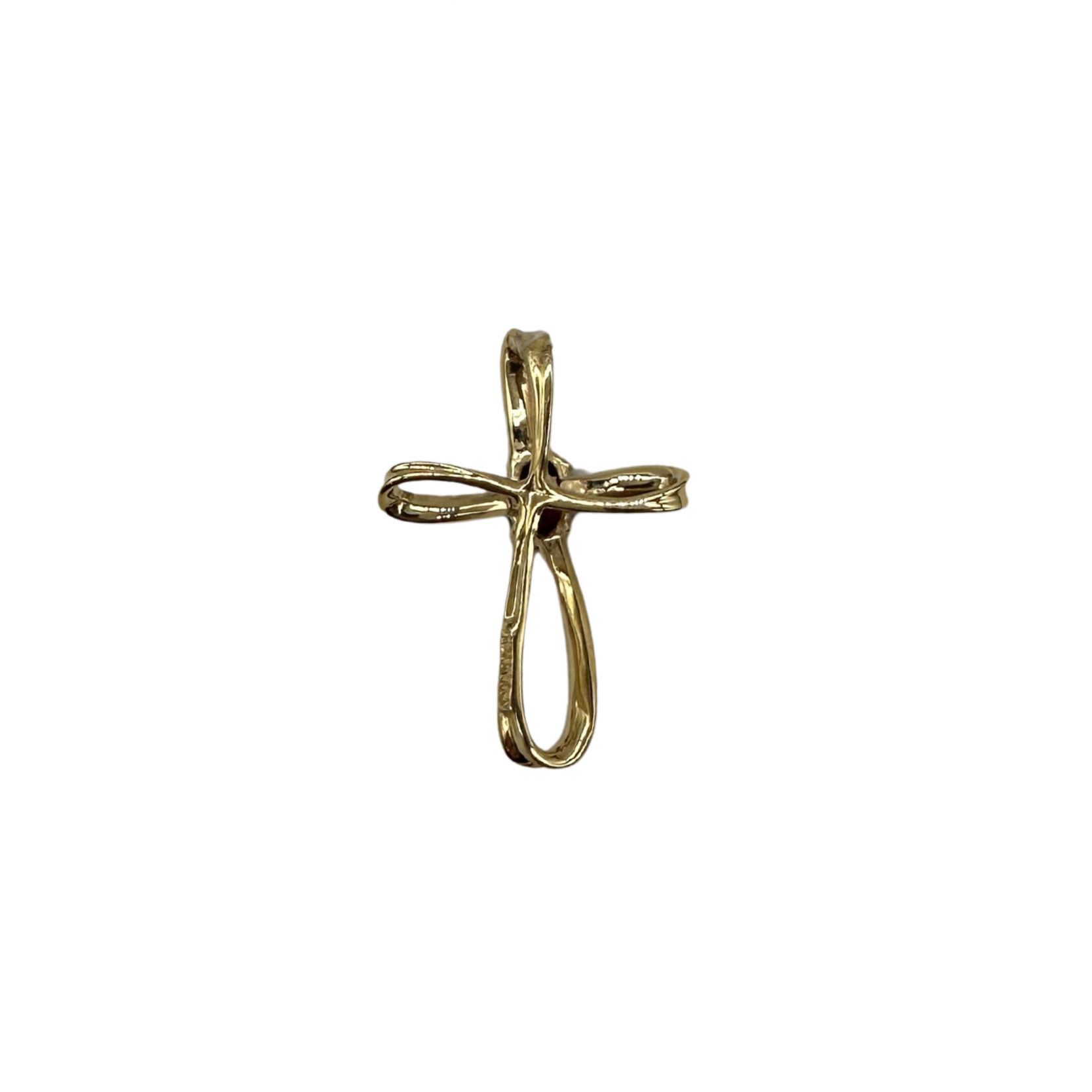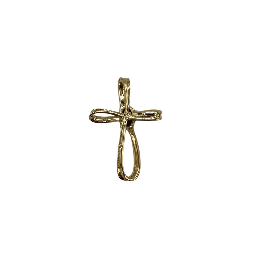 Graceful and symbolic, this cross pendant features a flowing ribbon-style design crafted from polished 10K yellow gold. At its center rests an oval-cut rubellite gemstone, radiating deep pinkish-red brilliance that adds warmth and meaning to the piece. The open, sculpted lines of the cross give it a modern yet timeless elegance—perfect for daily wear or special occasions.