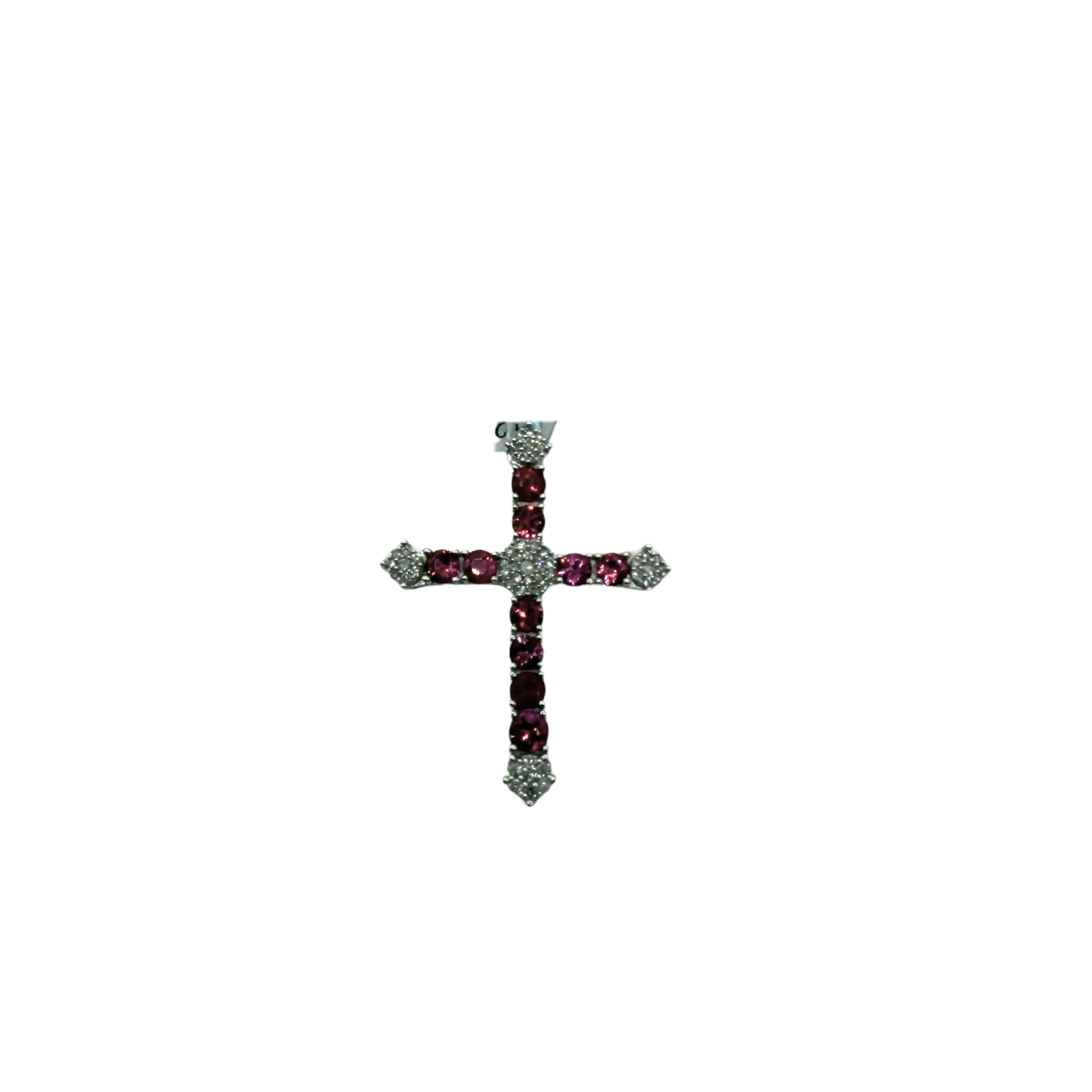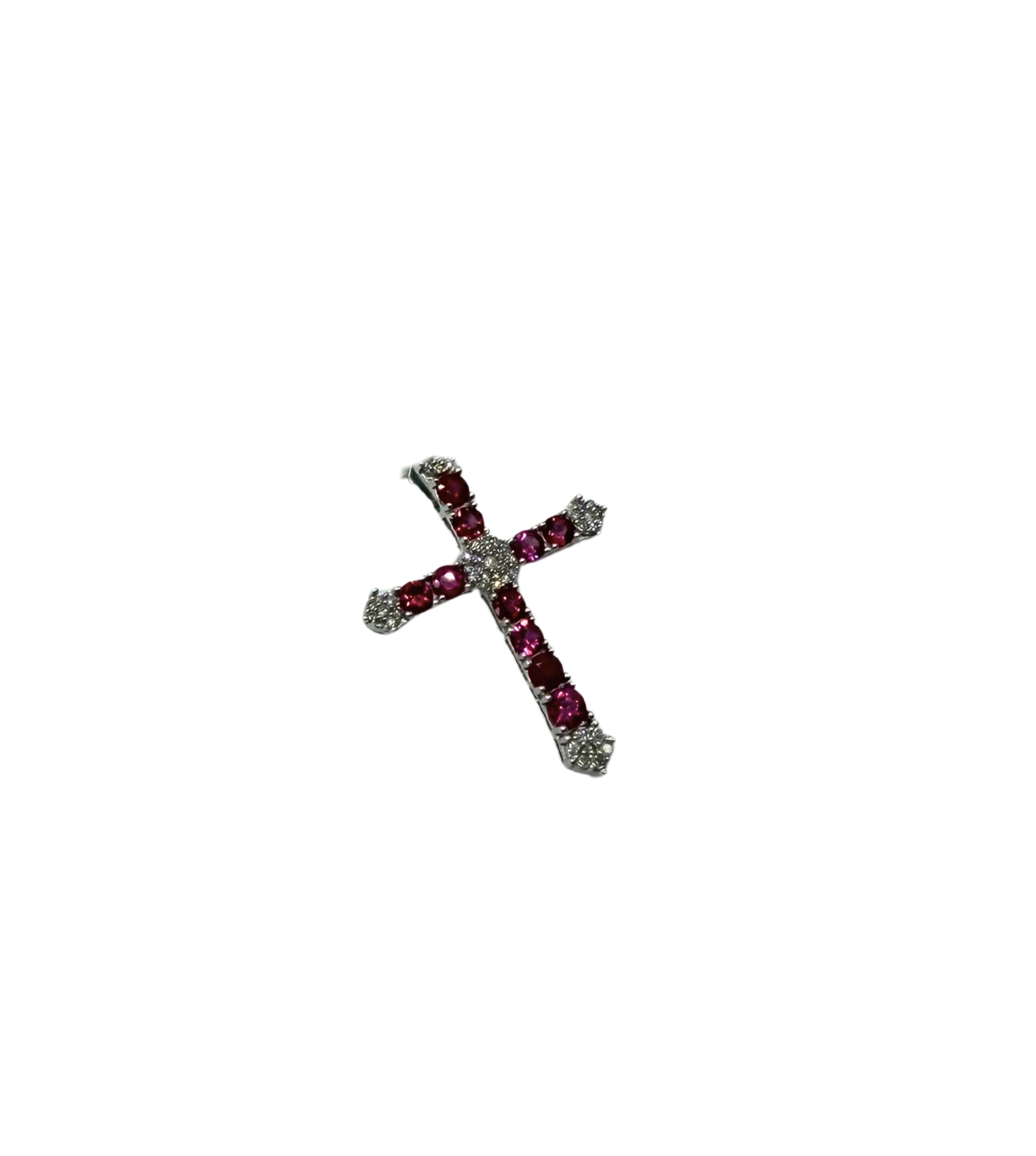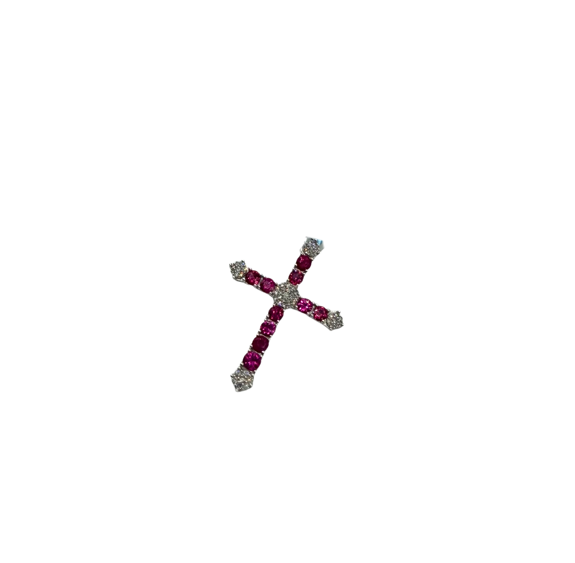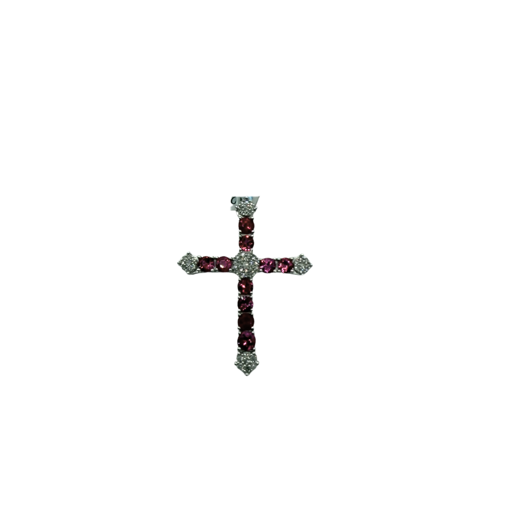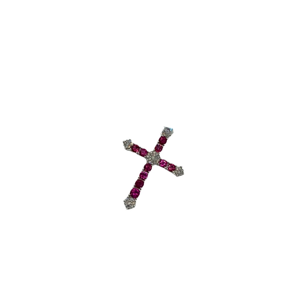 This striking 14k white gold cross blends deep ruby tones with bright diamond accents for a pendant that stands out with bold elegance. Each arm of the cross features bead-set rubies in rich shades of red, anchored by shimmering diamond clusters at the ends and at the center. The white gold setting adds a cool contrast, allowing the gemstones to take center stage with radiant color and sparkle.