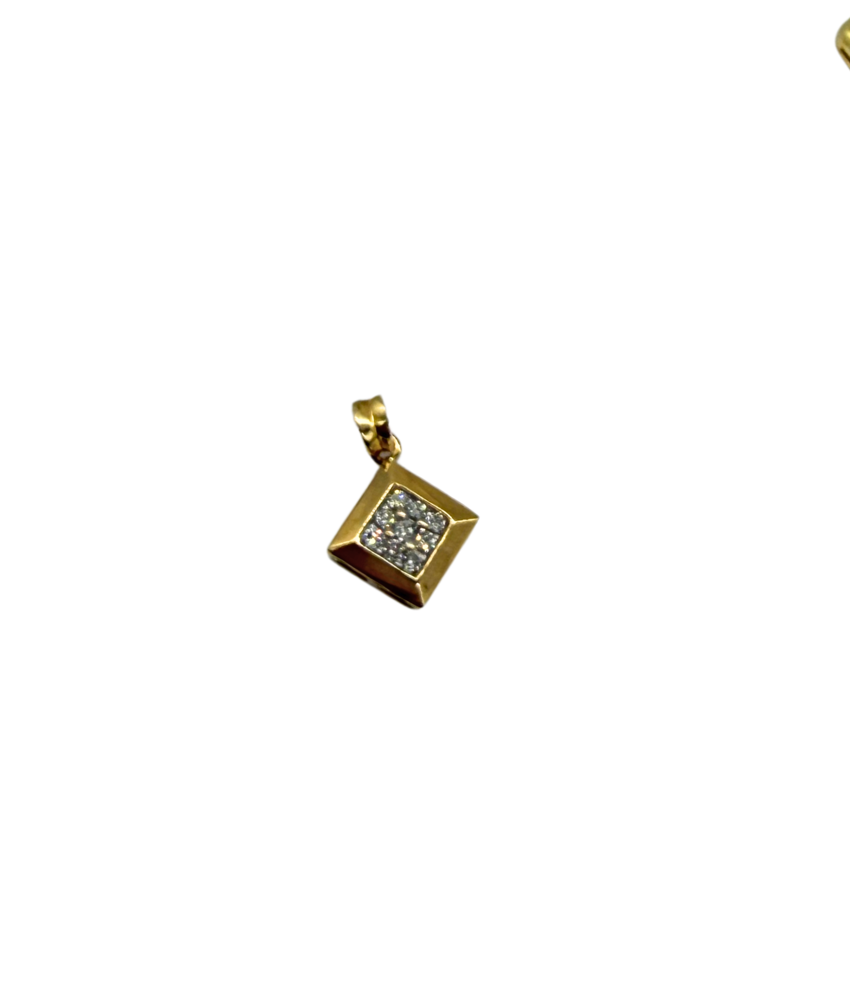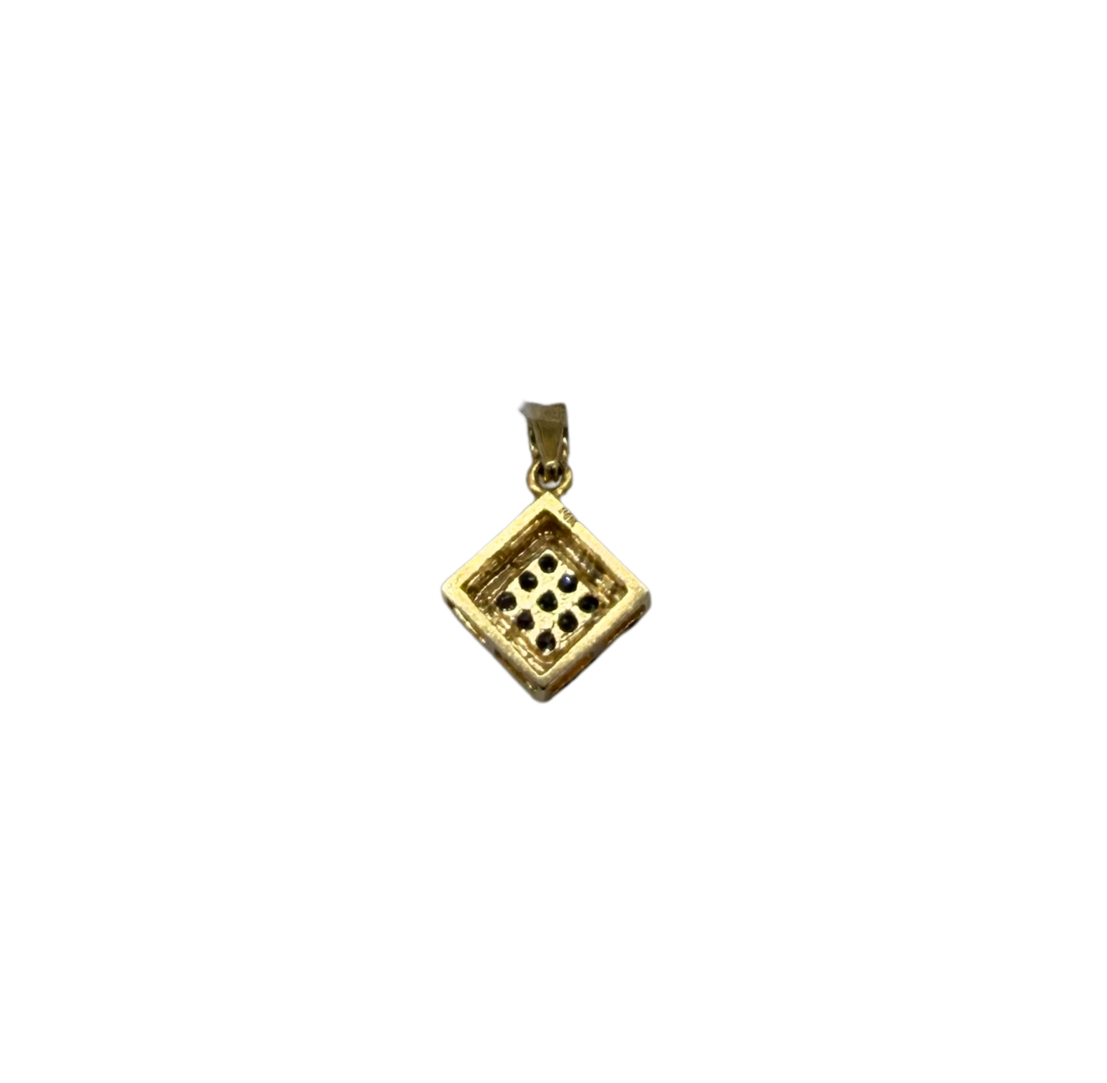 This striking rhombus-shaped pendant is crafted in solid 14k yellow gold and features a cluster of sparkling round diamonds totaling approximately 1/4 carat. The geometric design offers a modern, clean-lined look while the diamond center adds just the right amount of brilliance and depth.