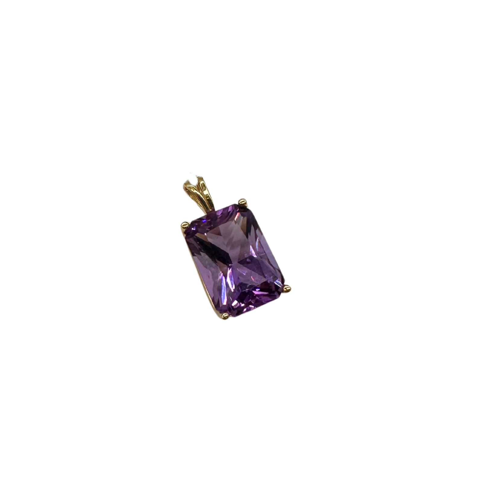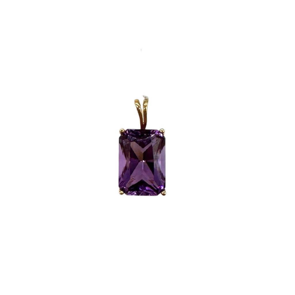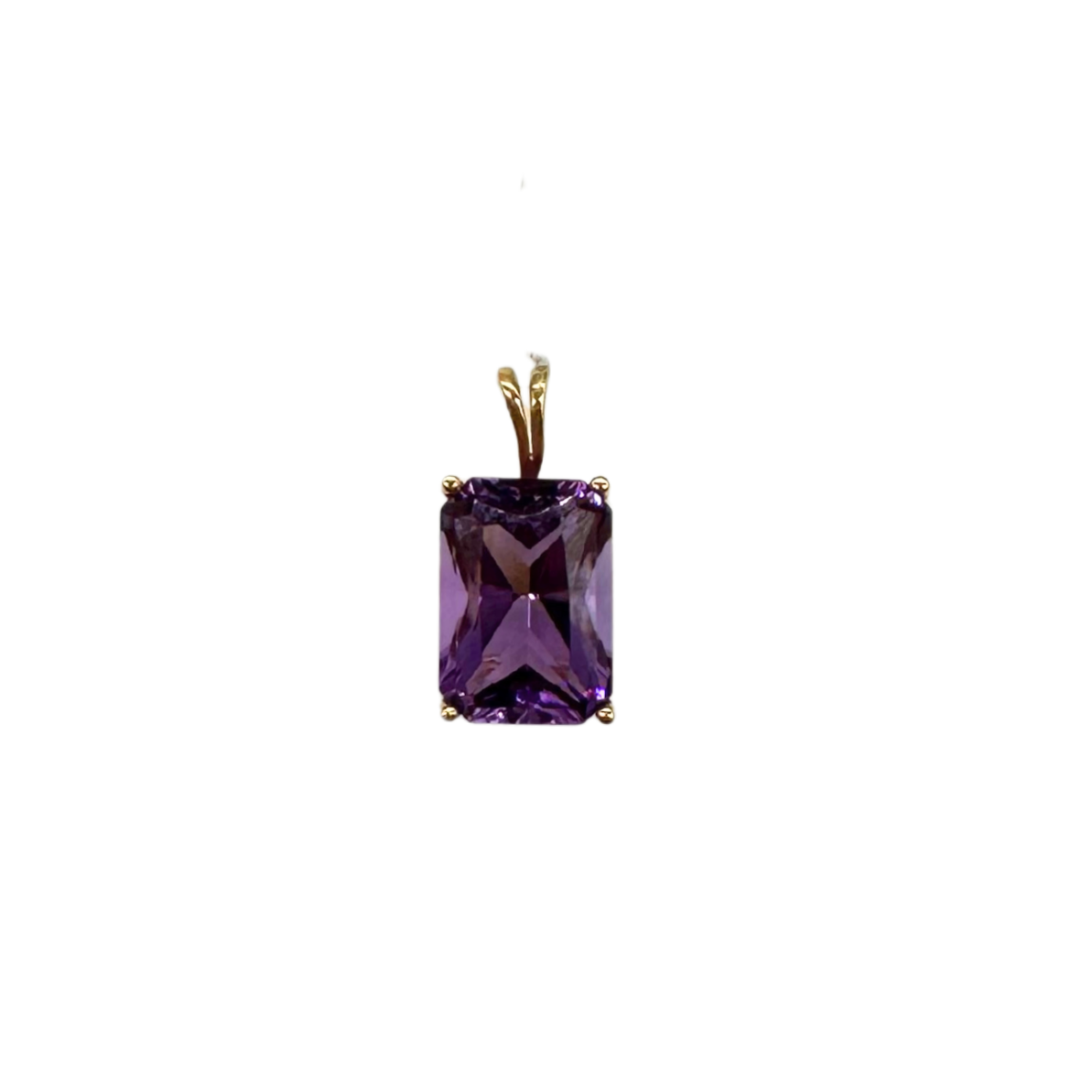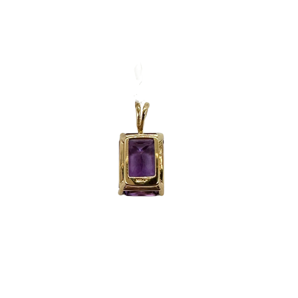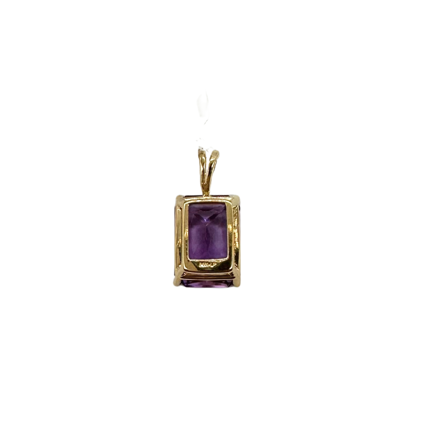 Classic sophistication meets vibrant color in this striking amethyst pendant. The radiant-cut gemstone is set in a 14K yellow gold open basket setting, allowing maximum light to pass through for enhanced brilliance. The four-prong mount ensures security while maintaining an elegant, airy design. Perfect as a standalone statement piece or paired with matching earrings for a timeless set.