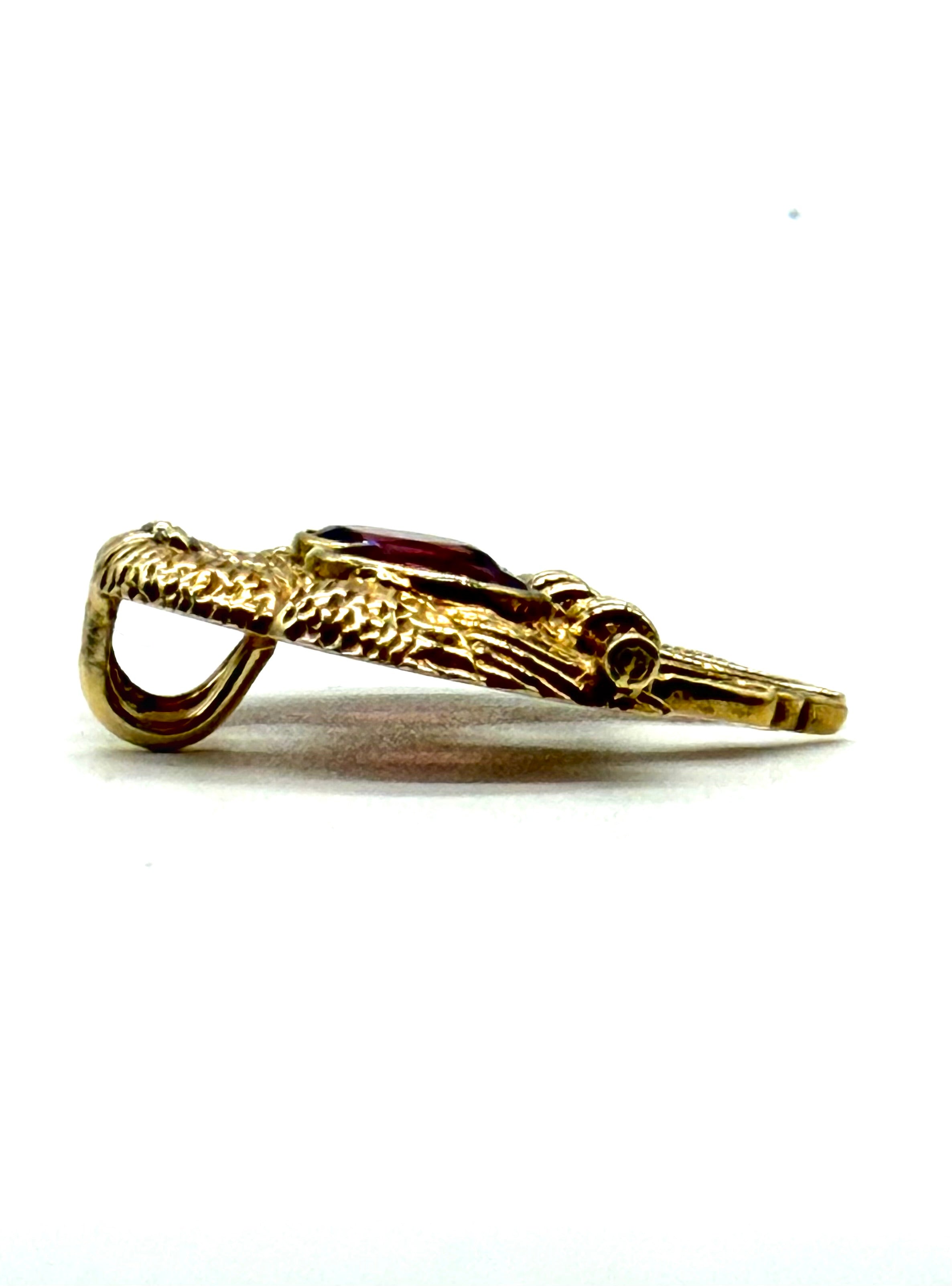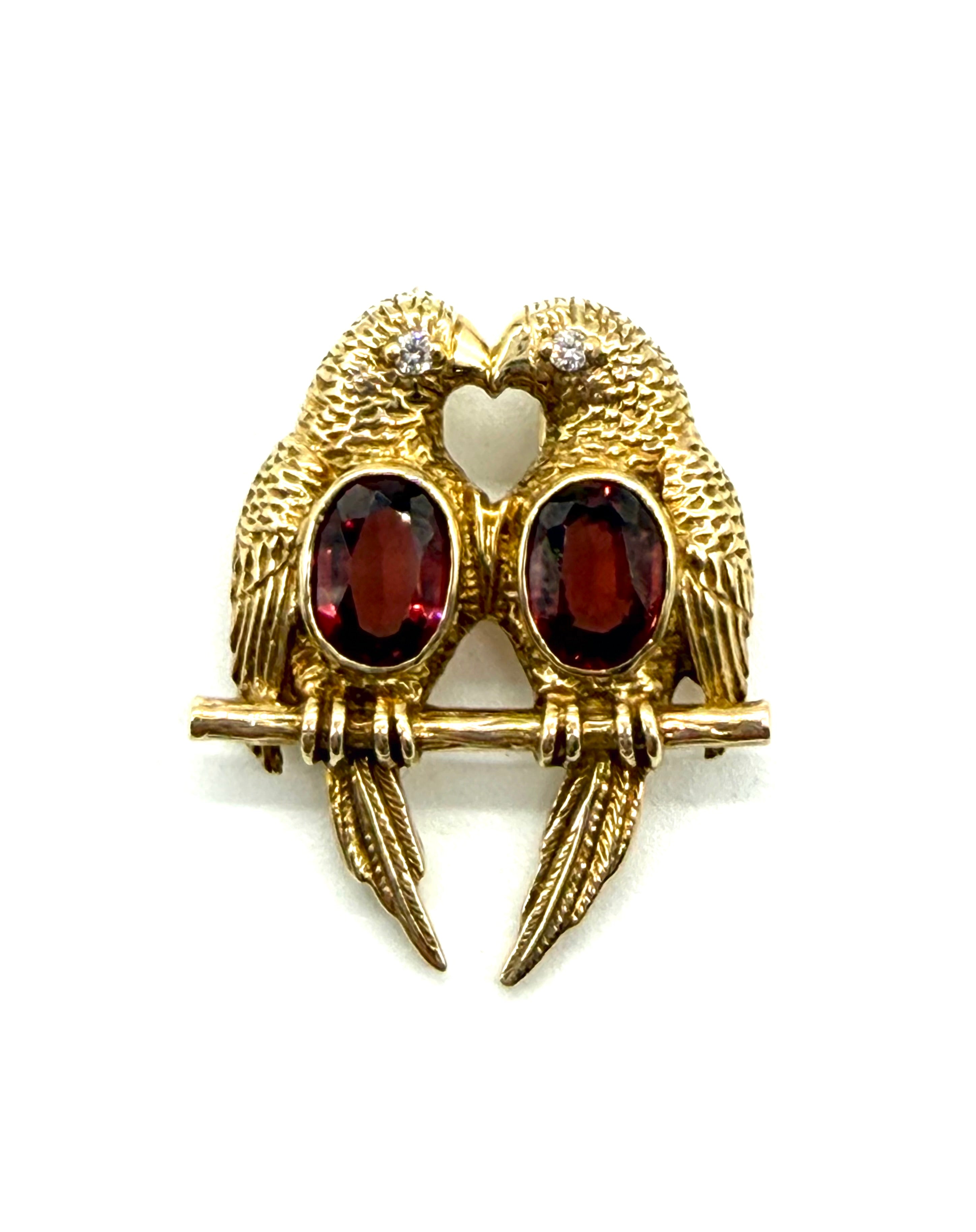 This charming pendant, crafted by Franklin Mint, features a pair of lovebirds. It’s made of 14K yellow gold and adorned with oval-cut garnets and small accent diamonds. The lovebirds are intricately detailed with textured feathers and are perched on a stand. Their beaks elegantly form a heart shape, adding to the pendant’s romantic appeal.