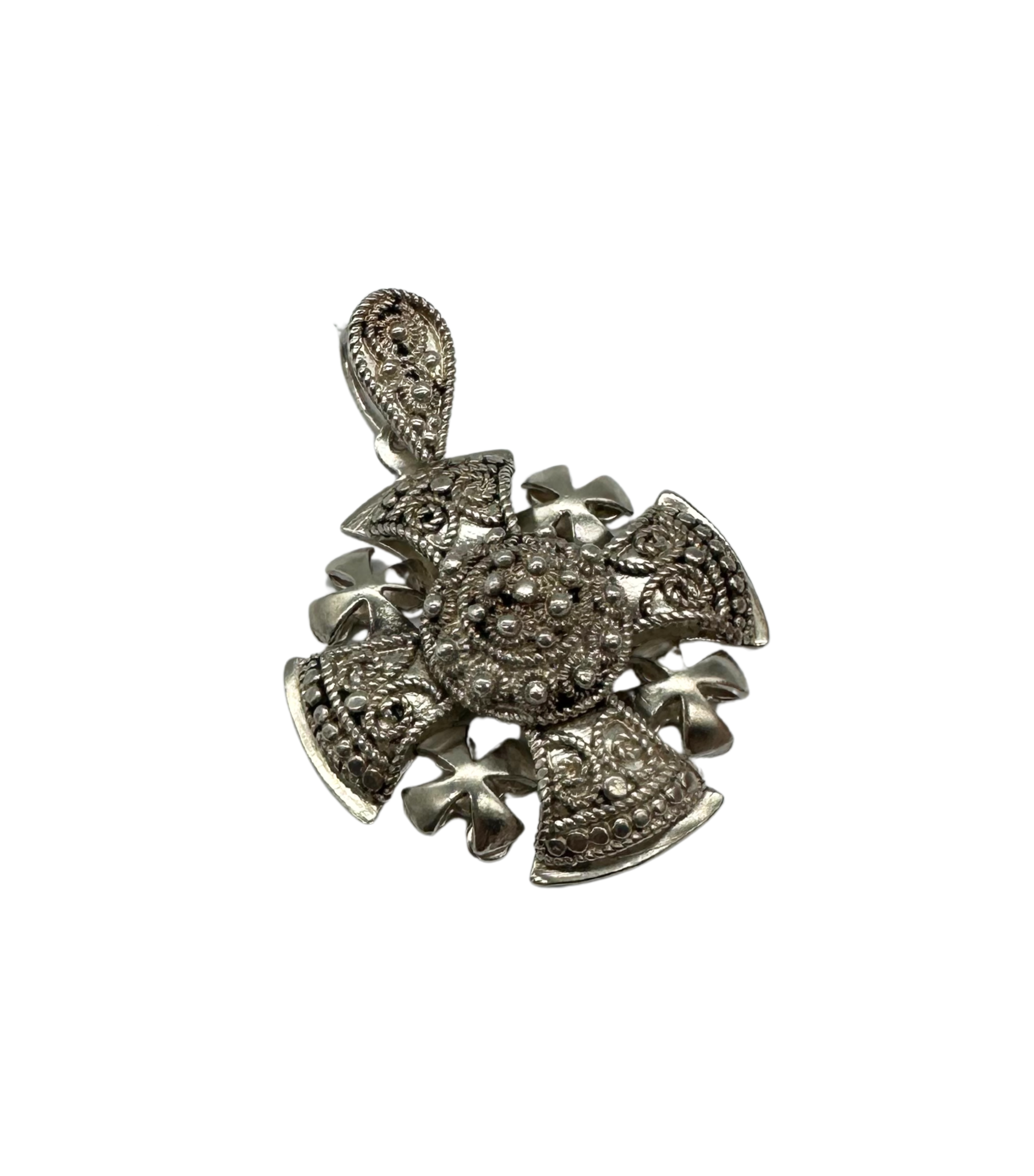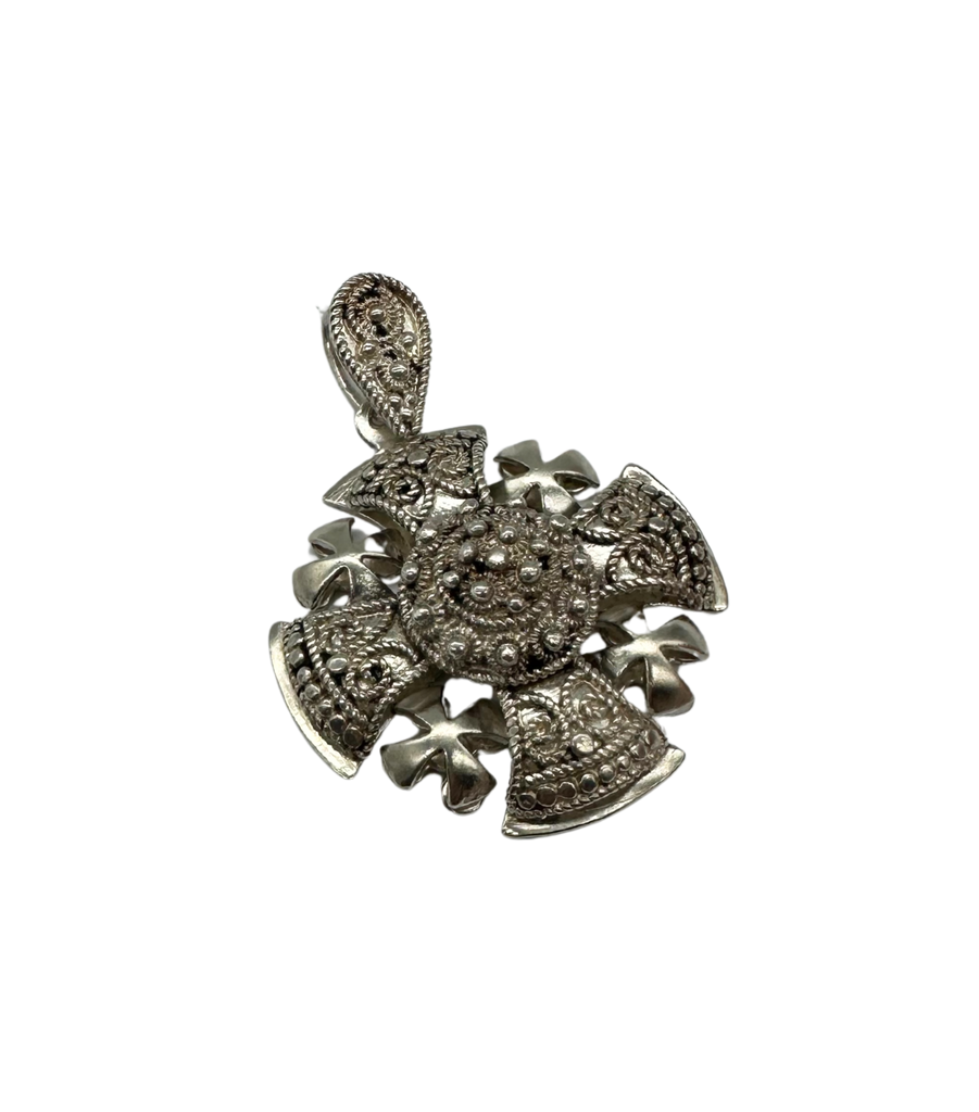 This intricately detailed Jerusalem Cross pendant is crafted in .935 silver and showcases stunning filigree accents across its bold, symmetrical design. Weighing 18.8 grams, the piece features a prominent central dome surrounded by raised textured arms and smaller crosses nestled between each point.