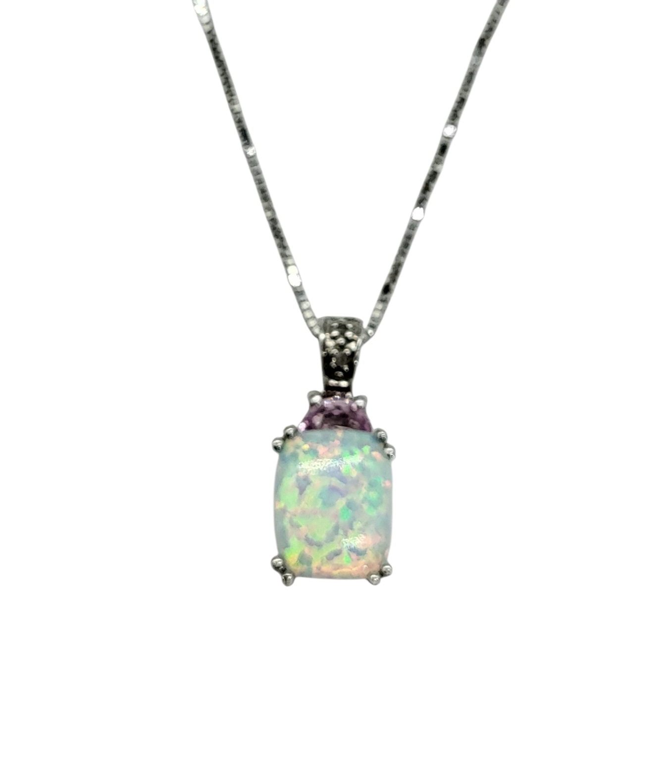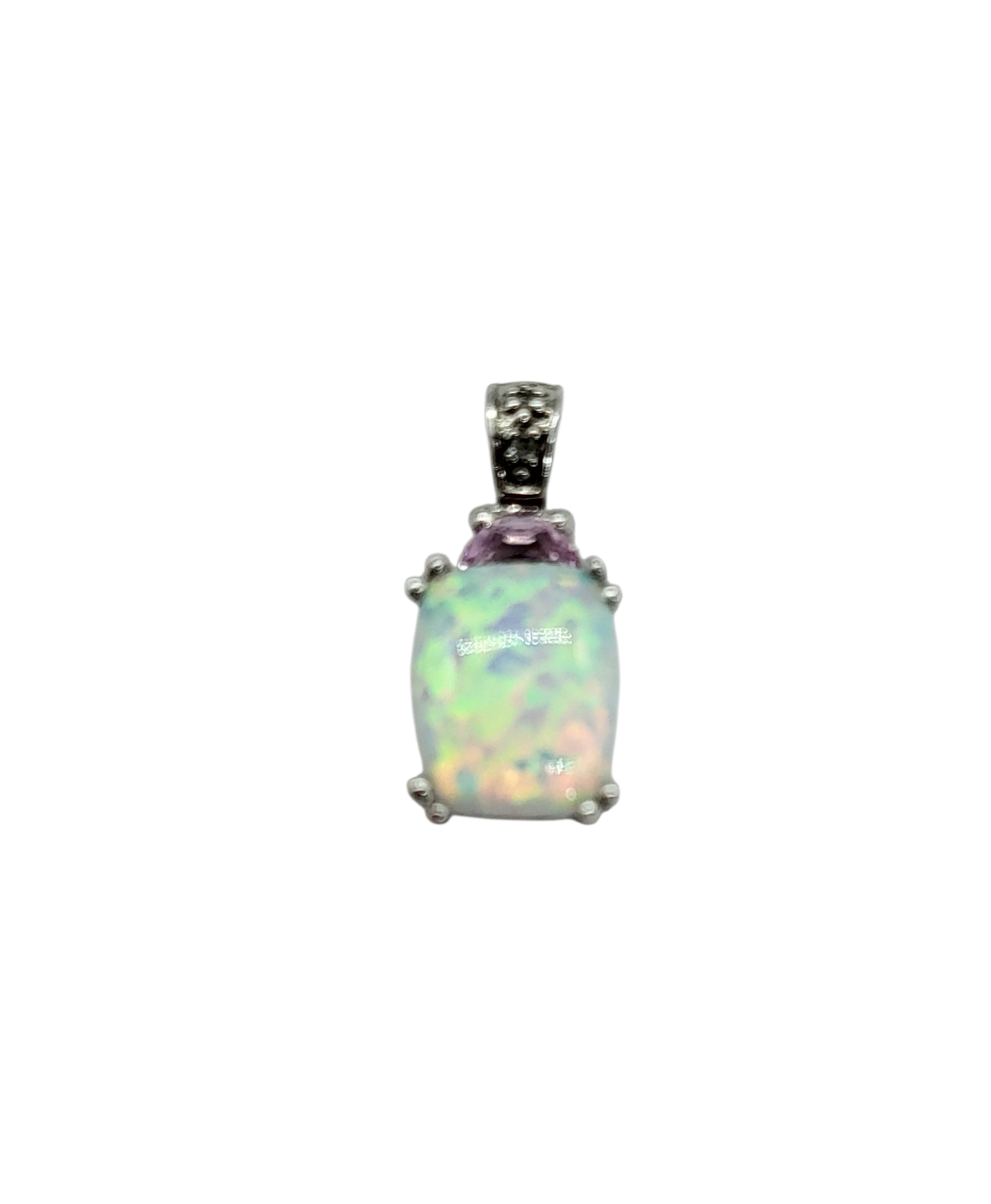 Enhance your jewelry collection with our stunning Opal Pendant in 10 Karat White Gold. This rectangular pendant features iridescent colors that will catch everyone's attention, accented with sparkling diamond chips. Made from high-quality 10 karat white gold, this pendant is the perfect addition to any outfit for a touch of elegance. Chain sold separately