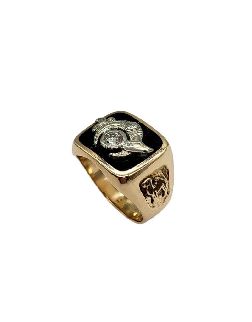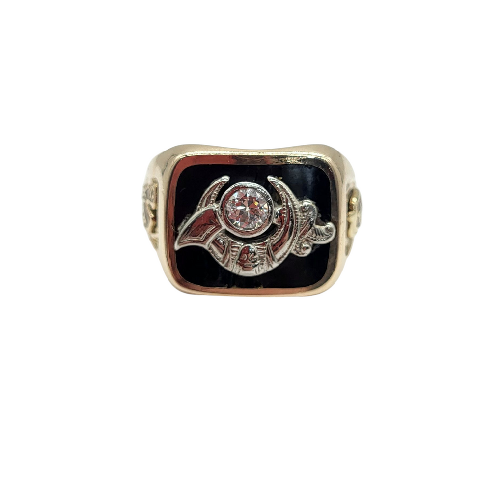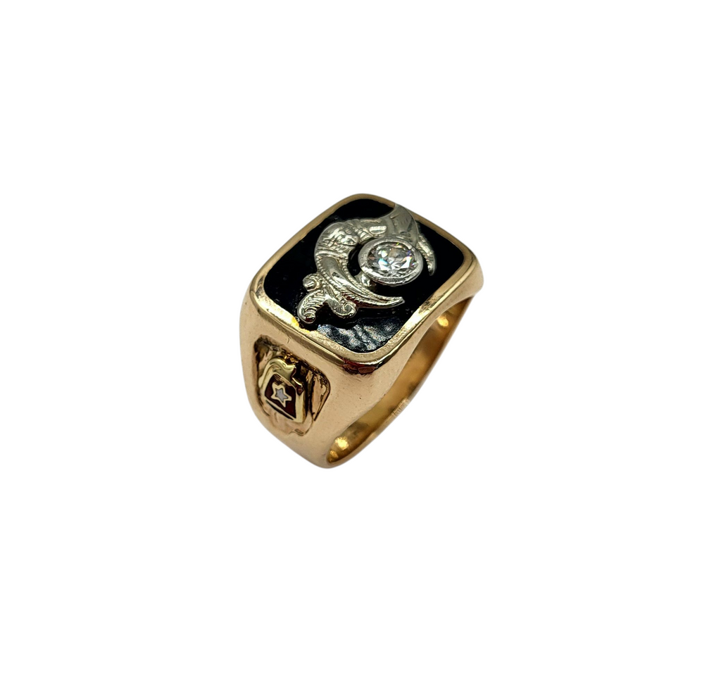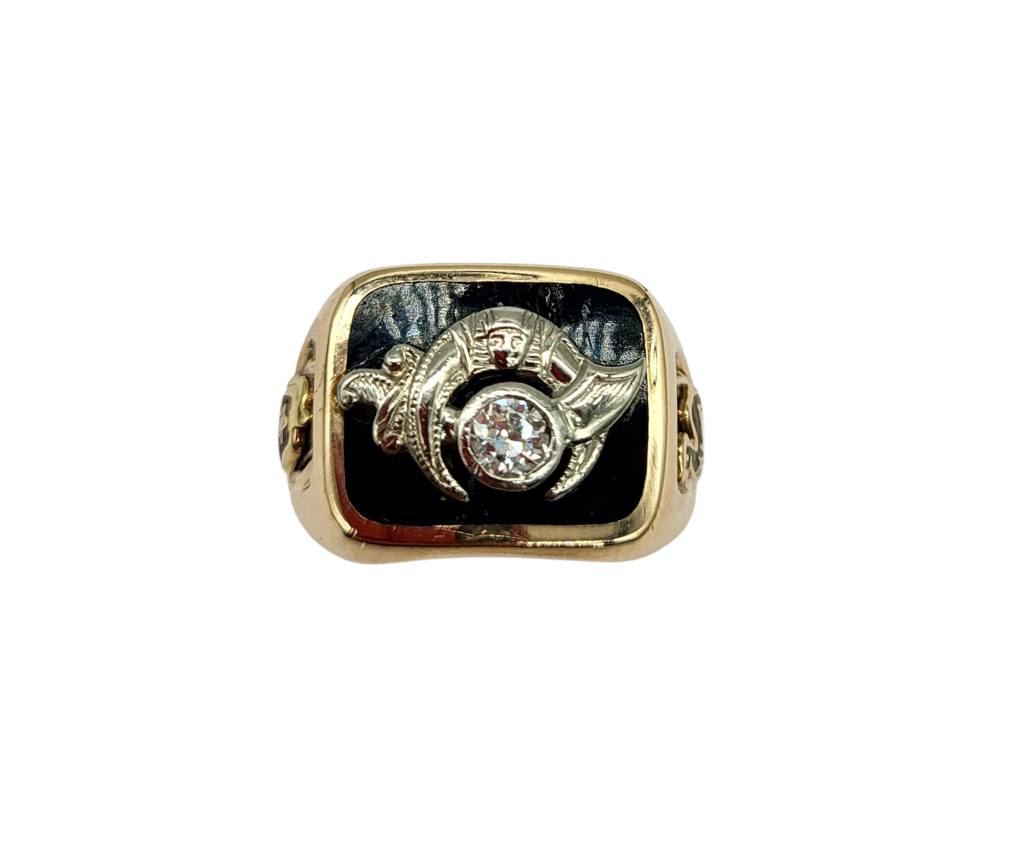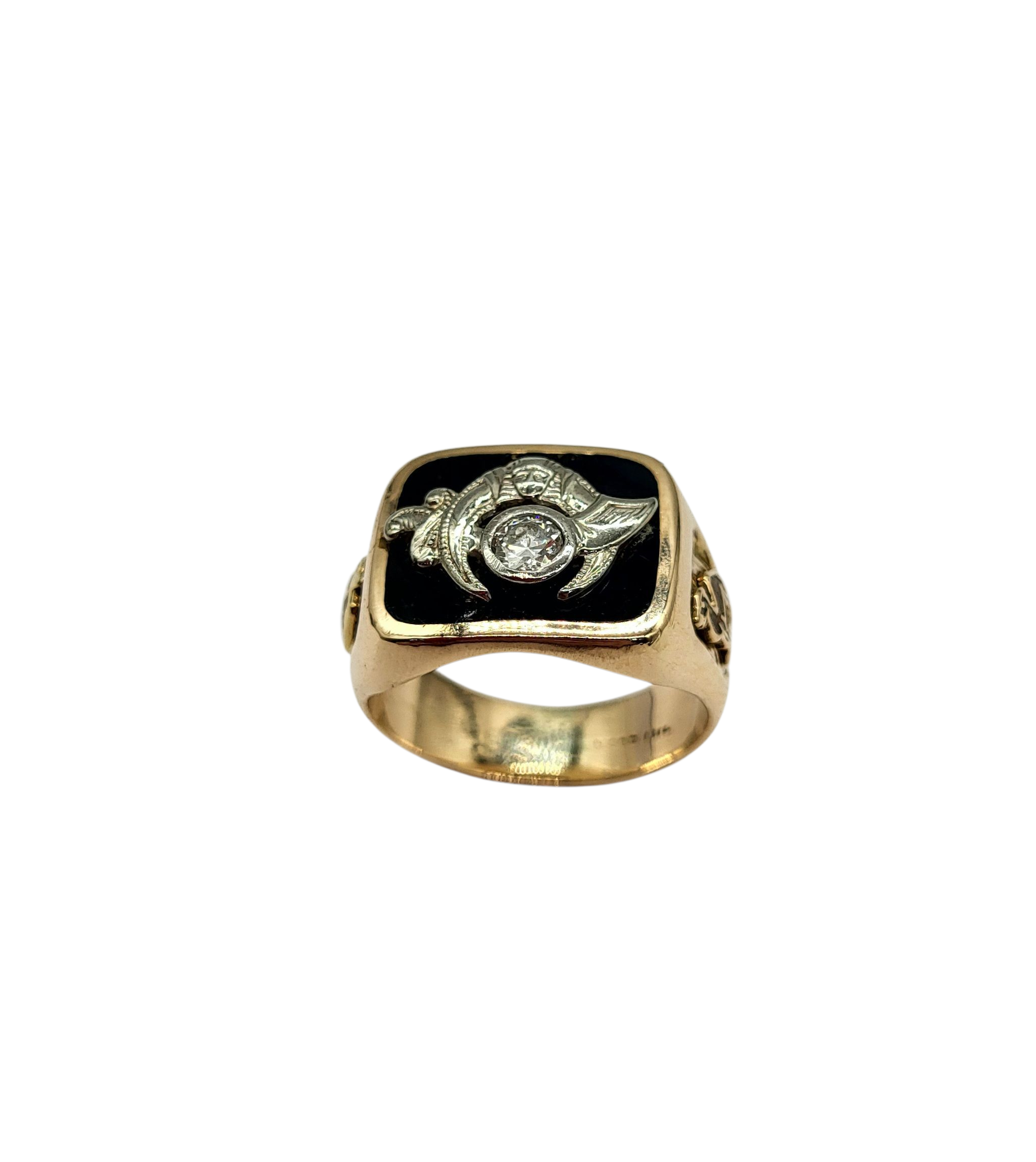 Expertly crafted with sleek black onyx and a 25 point total weight round bezel set diamond, this Shriners men's ring in 10 karat yellow gold is a timeless and sophisticated choice. Show your support for the Shriners organization with this elegant and meaningful piece.