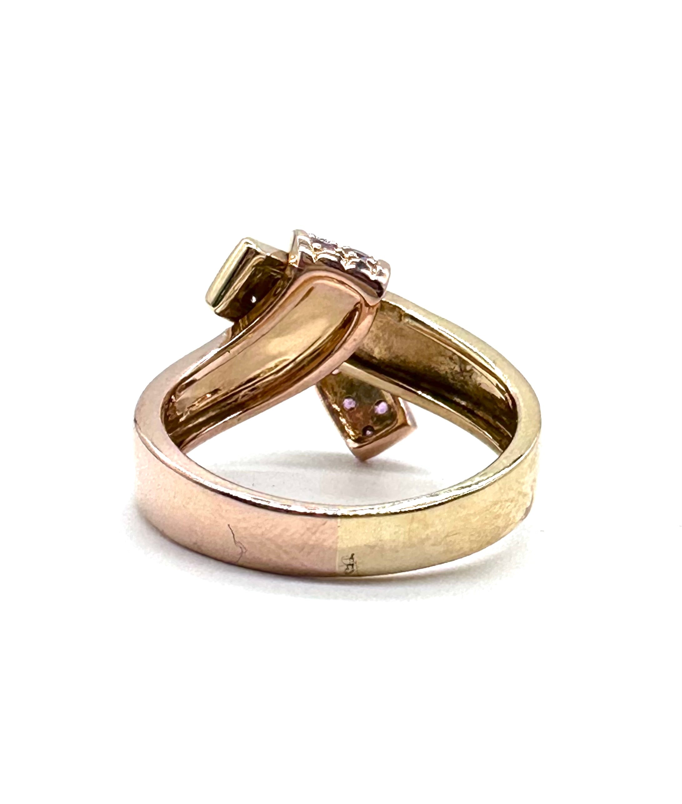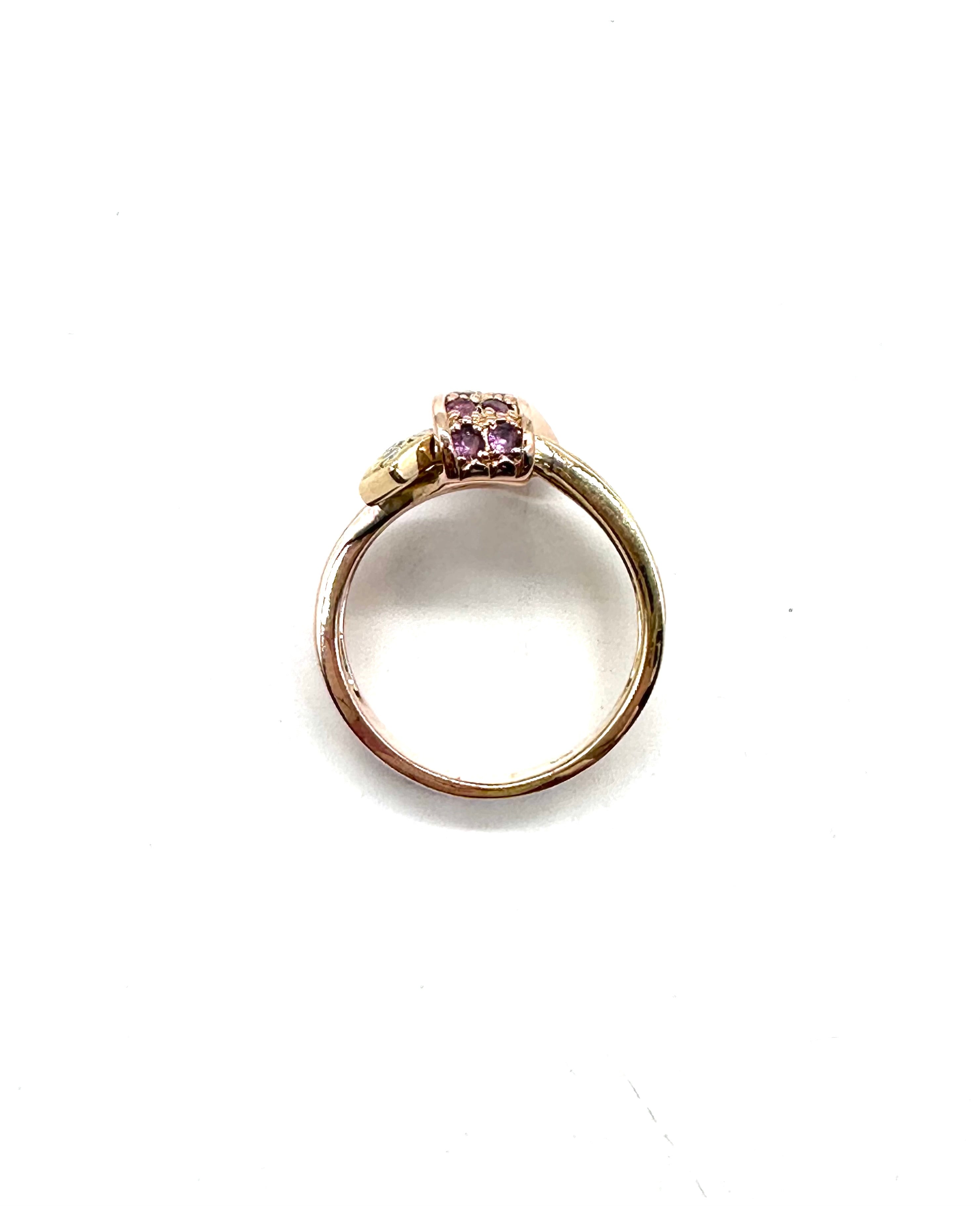 This whimsical Ruby and diamond crossover ring is set in 18 karat yellow and rose gold with diamond chips.