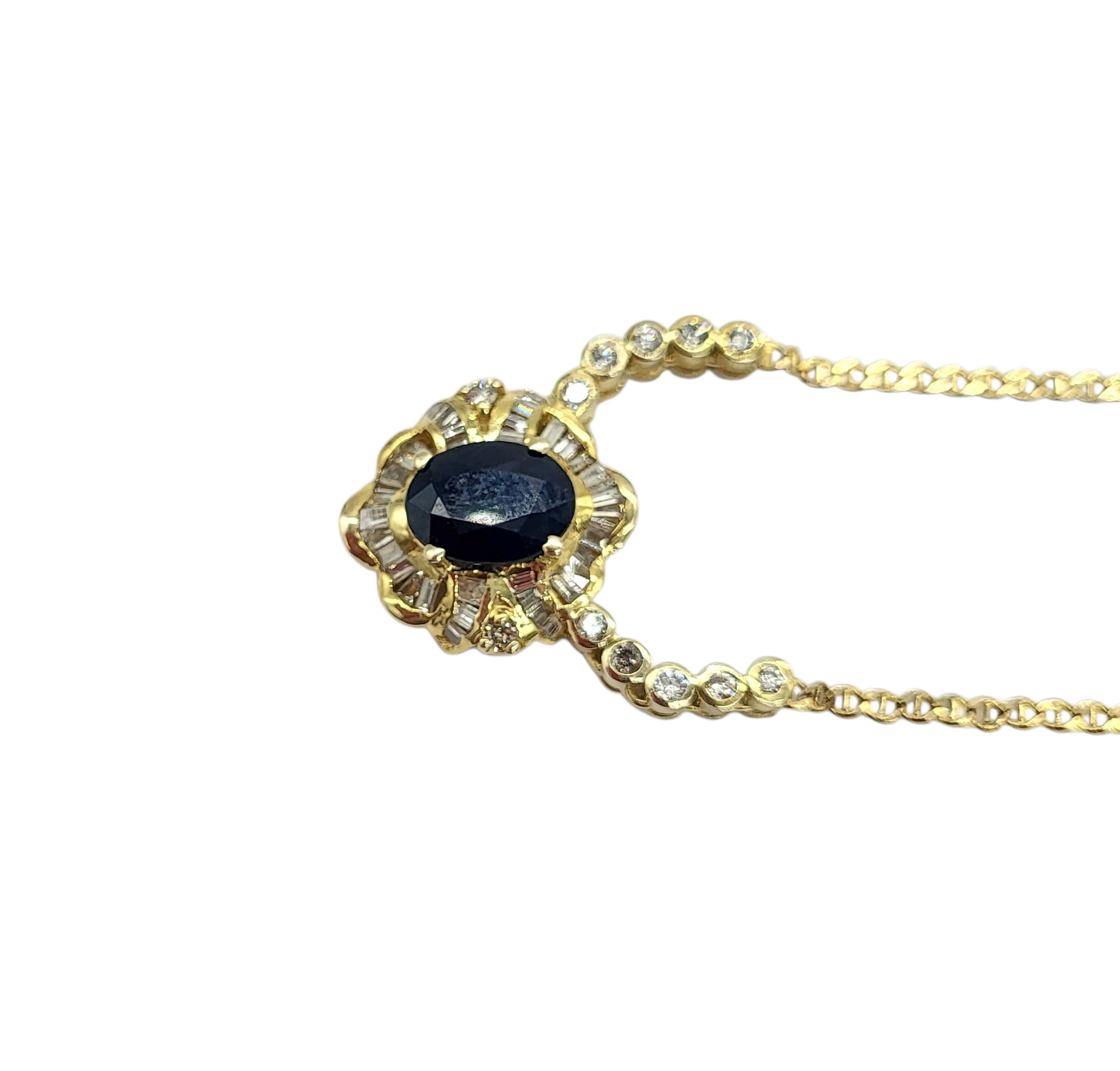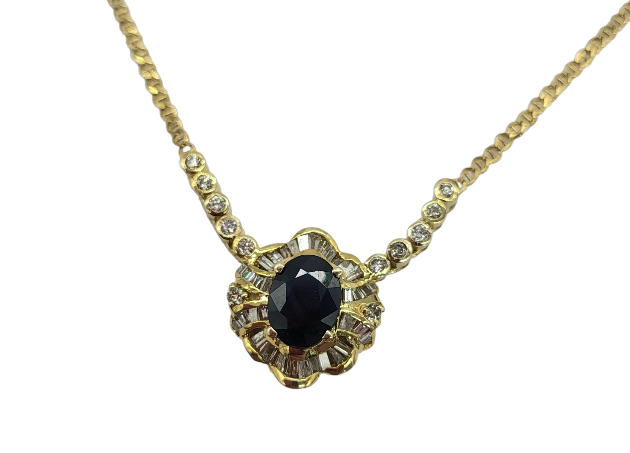 The Sapphire and Diamond Pendant Stationary Necklace features an oval sapphire encircled by baguette diamonds, complemented by ten bezel-set diamonds along a 14 karat yellow gold chain. This design harmonizes elegance and durability, making it suitable for various occasions. Coordinating earrings and ring are also available for a complete set. Item numbers 510769 and 510770