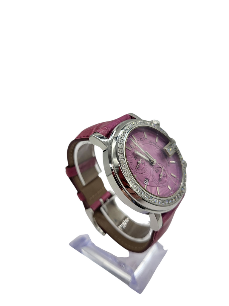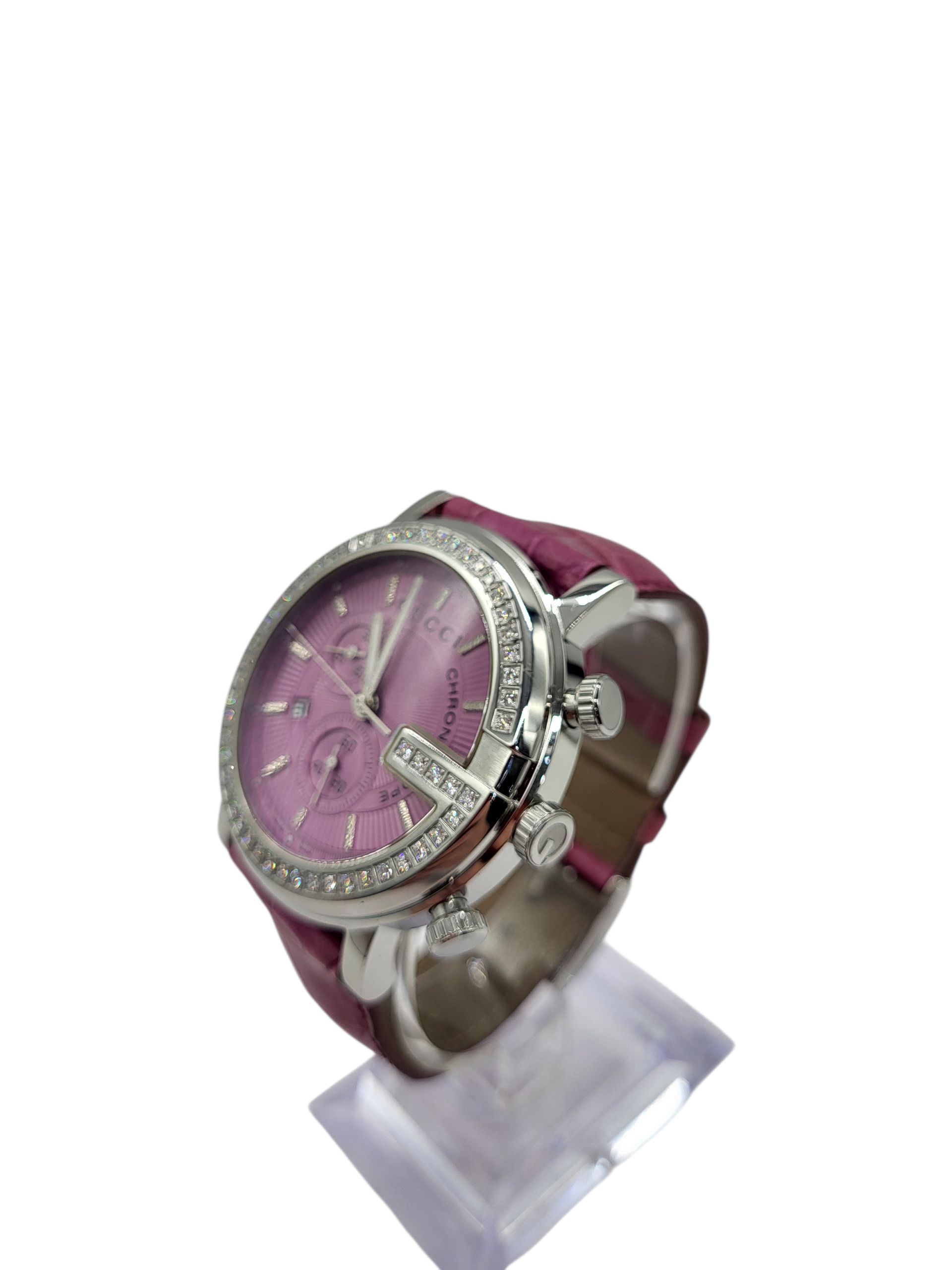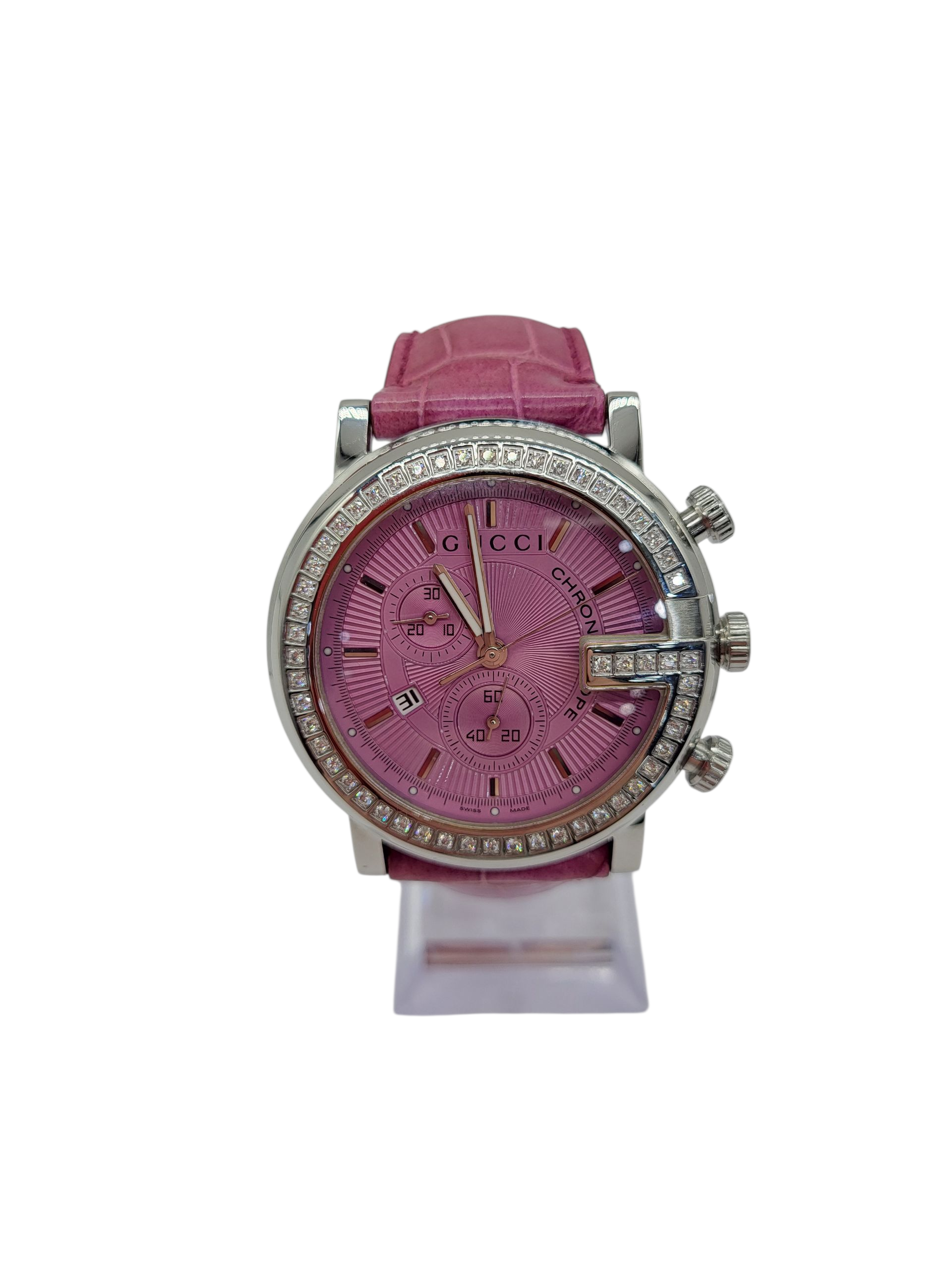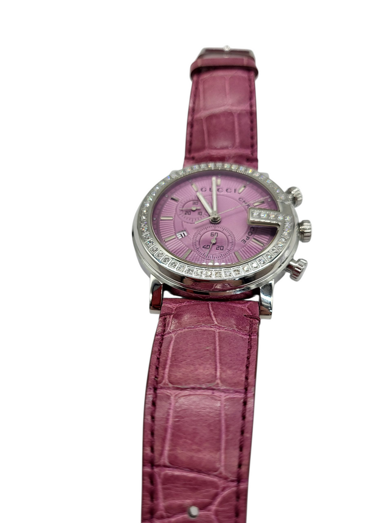 "Add a pop of luxury to your wardrobe with the Designer Watch by Gucci. This stunning timepiece features a stainless steel casing, pink dial, and diamond bezel for a touch of glamour. The pink leather crocodile look band adds a stylish and unique touch to your everyday look."