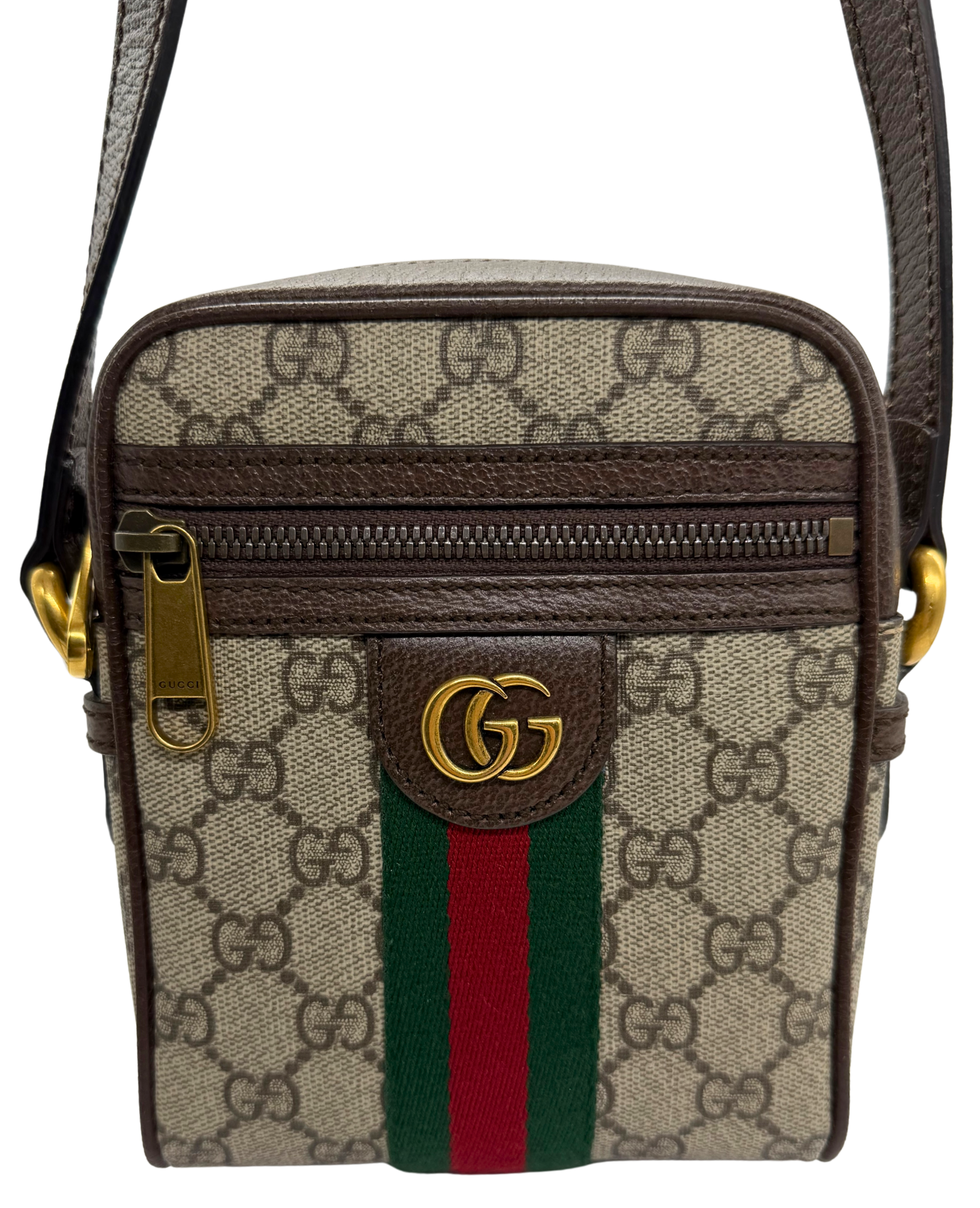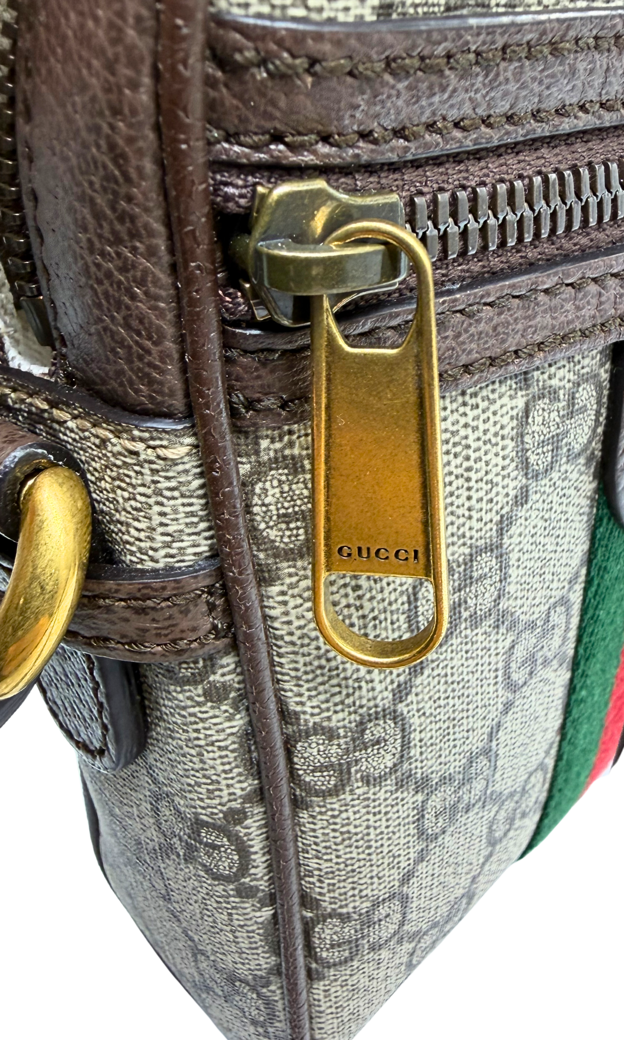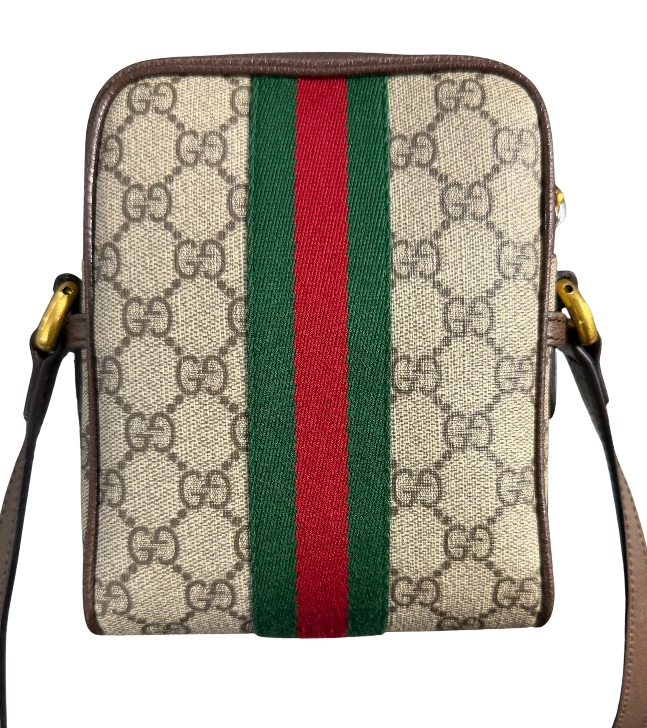 Step into iconic luxury with this Gucci GG Supreme shoulder bag, featuring the classic beige/ebony monogram canvas paired with rich brown leather trim. The bold green-and-red Web stripe adds that unmistakable Gucci signature, while the front zip pocket and polished gold-tone hardware complete the timeless design.