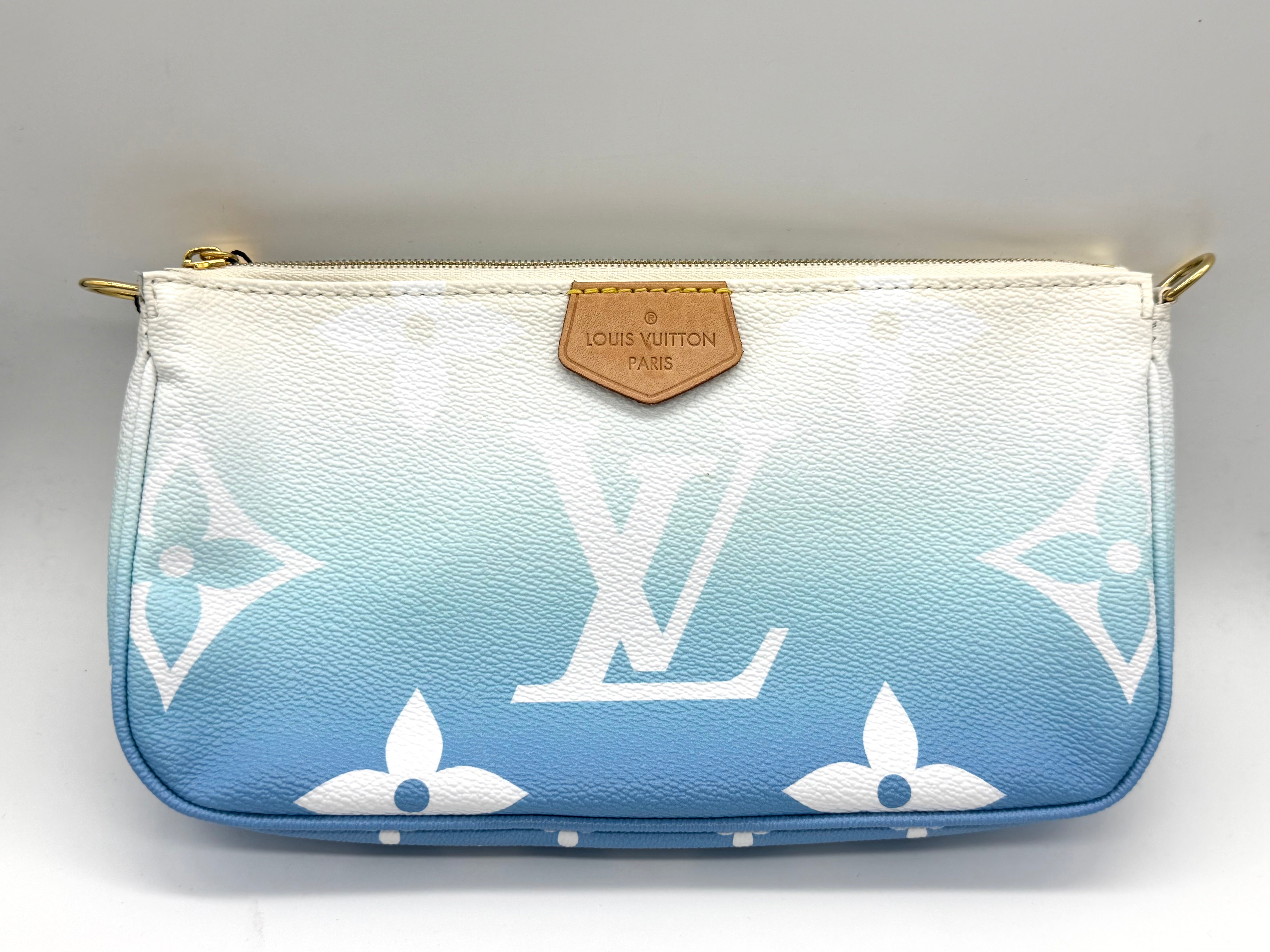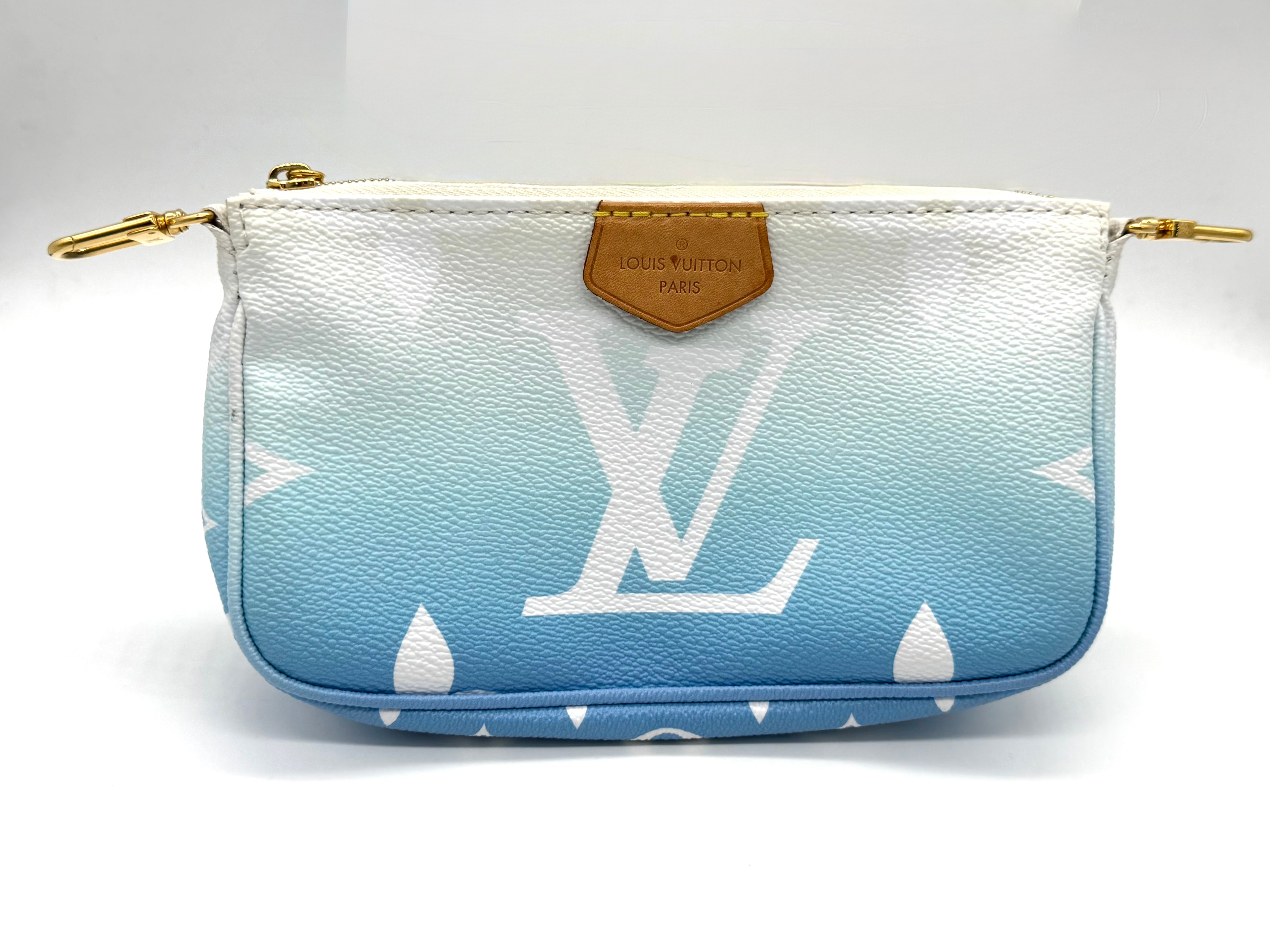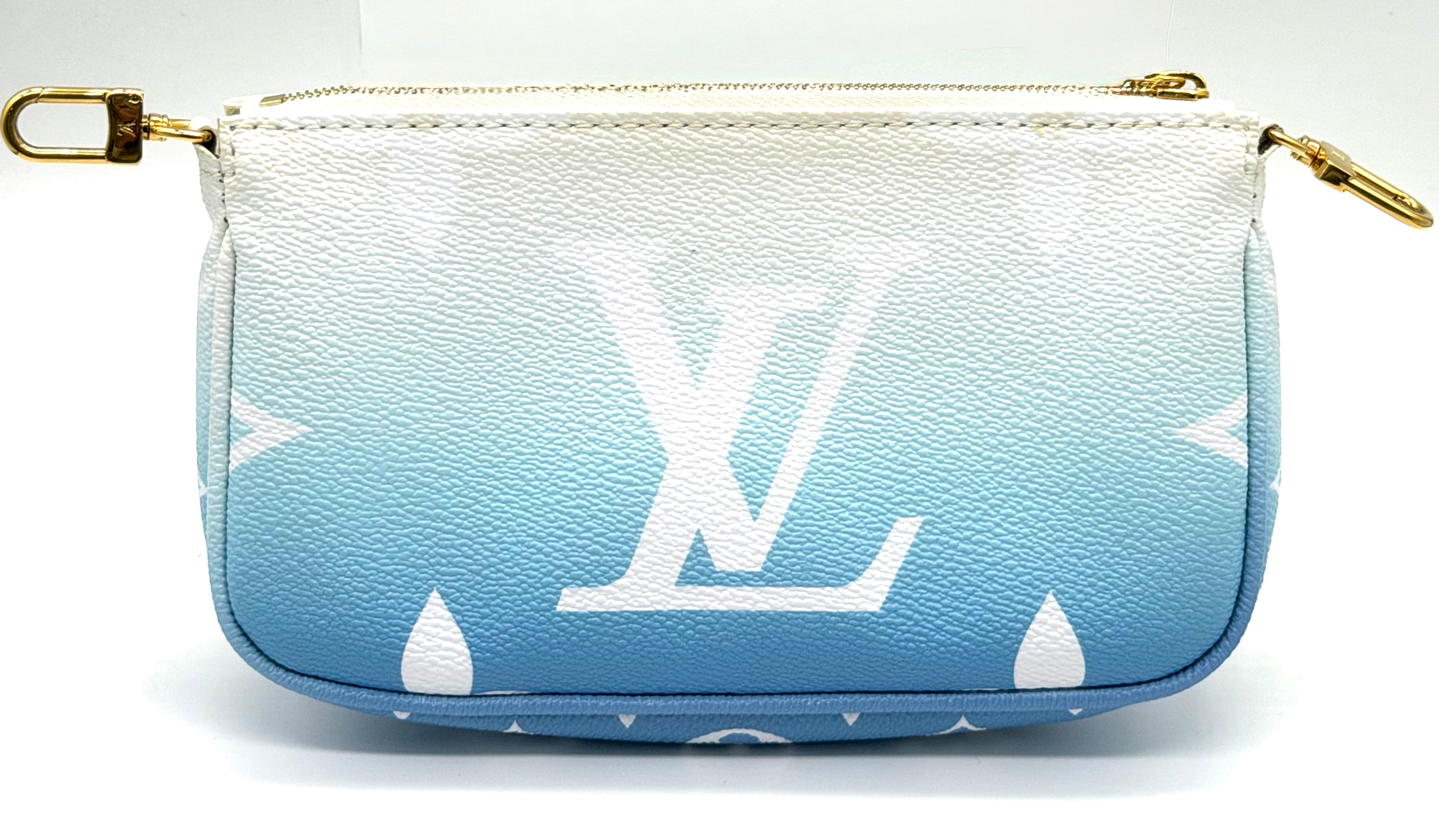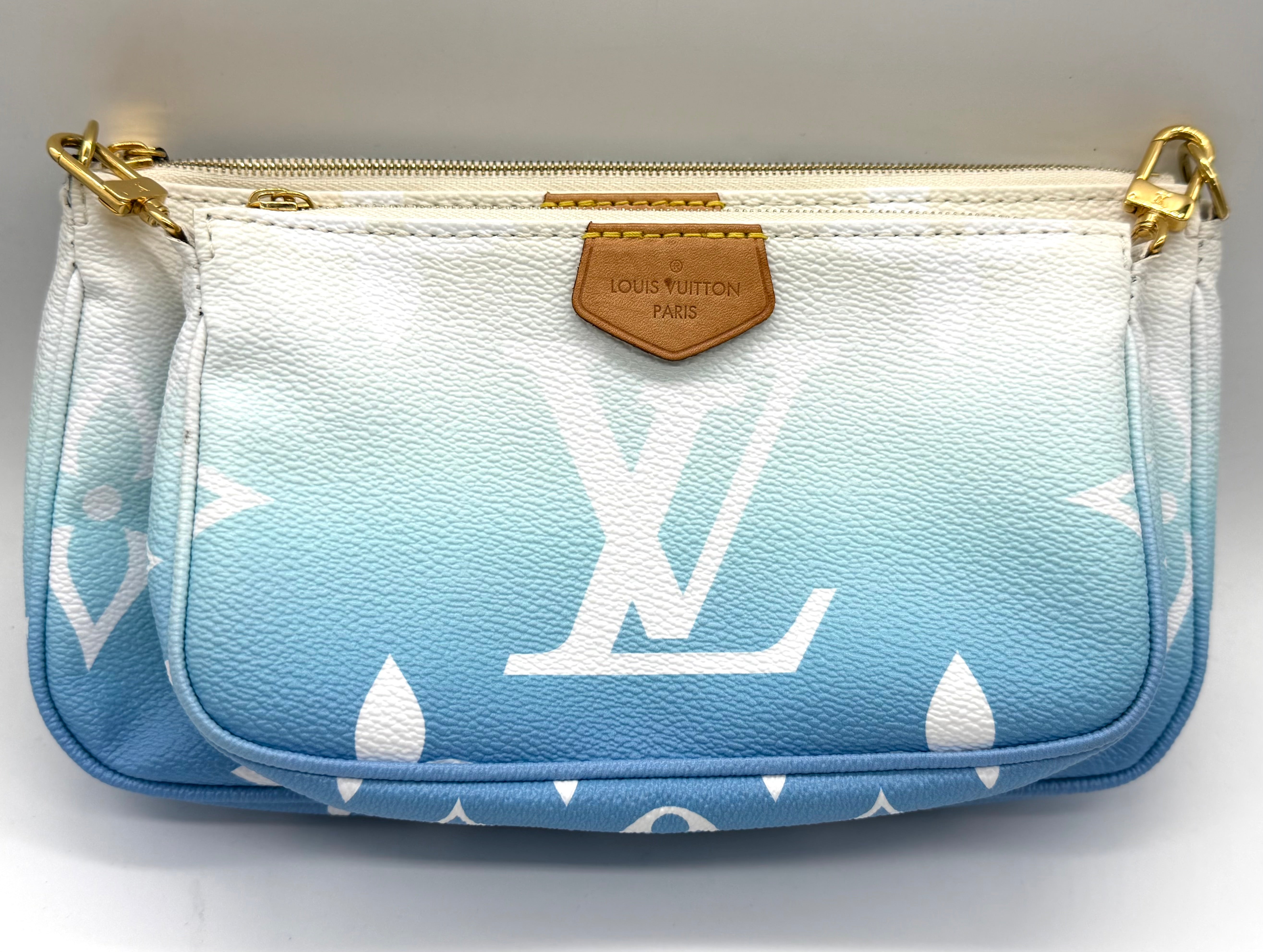 Louis Vuitton Multi Pochette Accessories from the By the Pool collection, crafted in vibrant Lagoon blue. Monogram Tiles canvas with natural cowhide trim and gold-tone hardware. This versatile set includes two zippered pouches (one rectangular pouch and one round pochette that clip together, plus a removable adjustable textile strap—perfect for carrying a phone, keys, wallet, and small essentials.