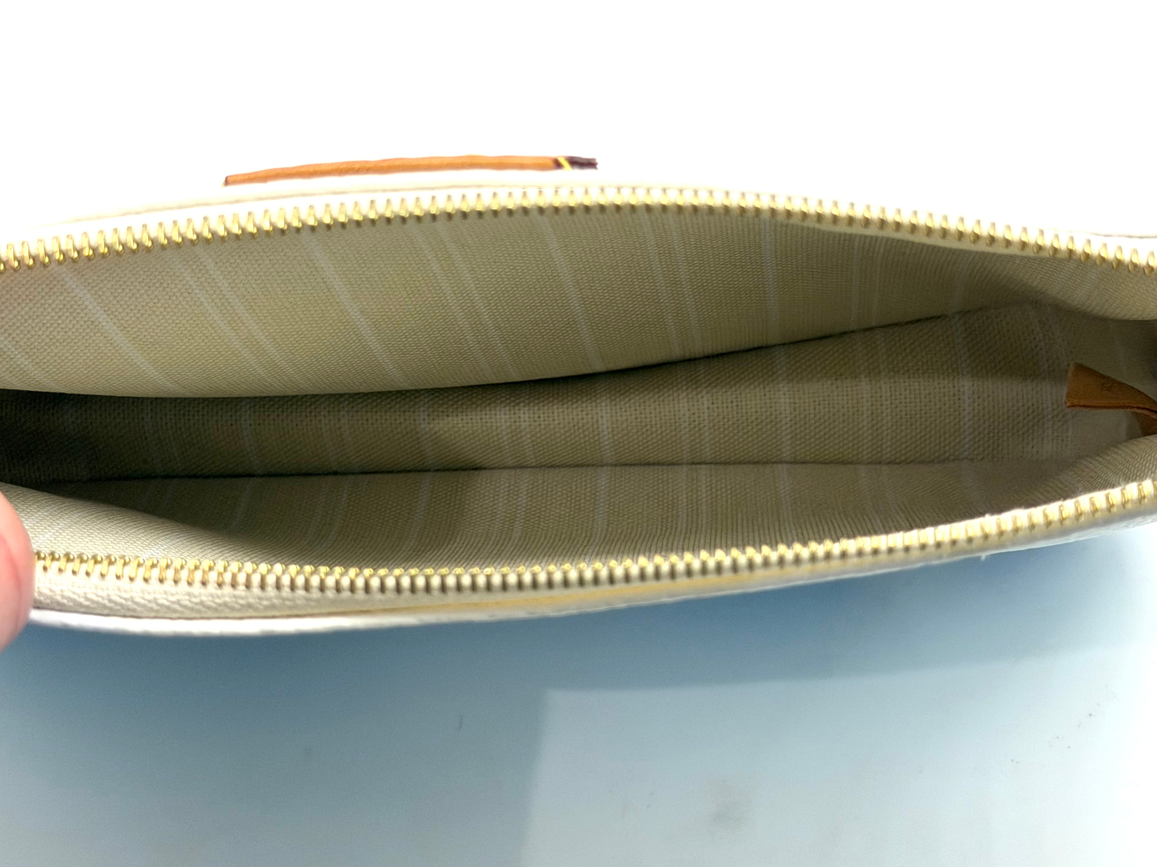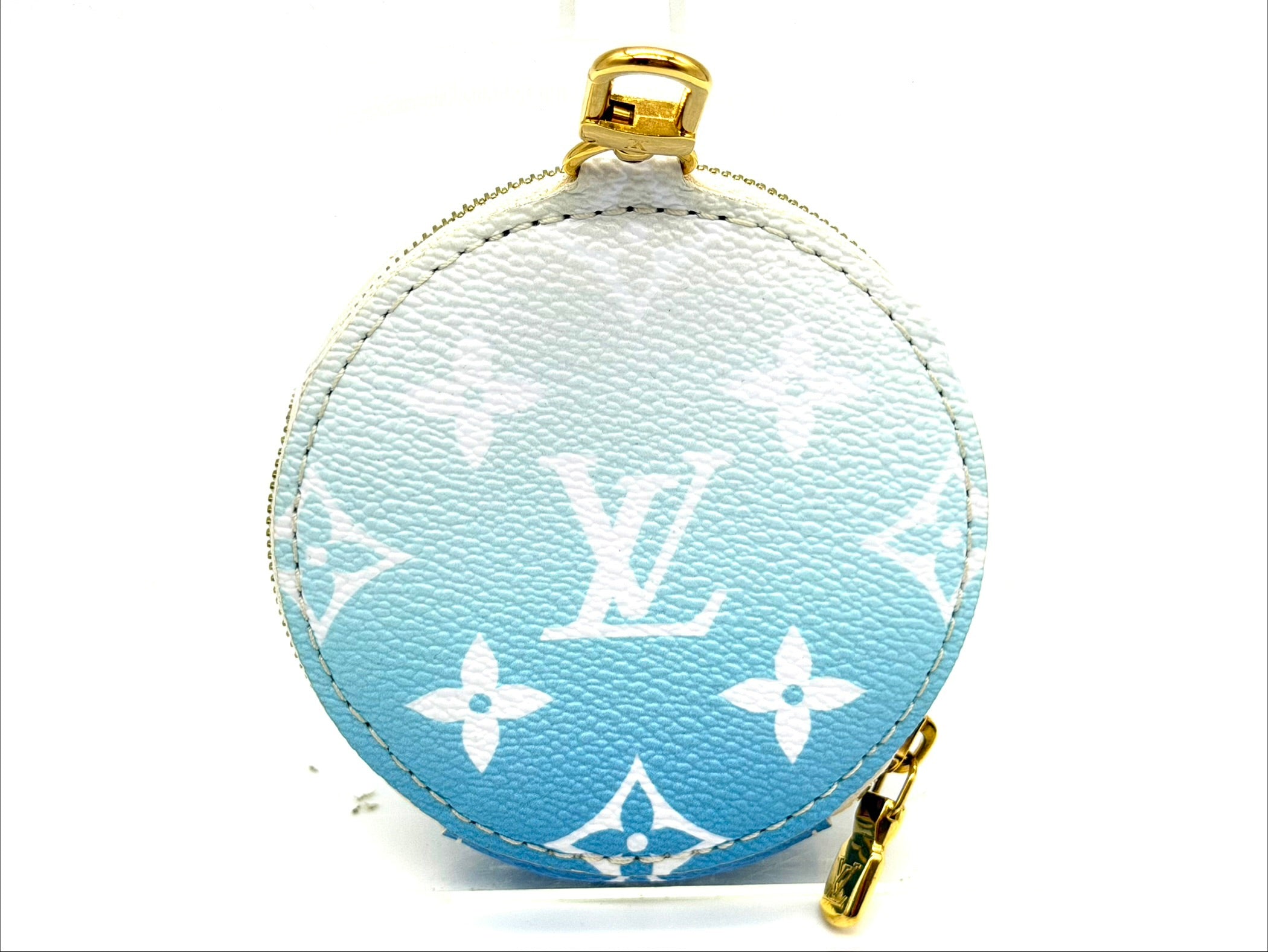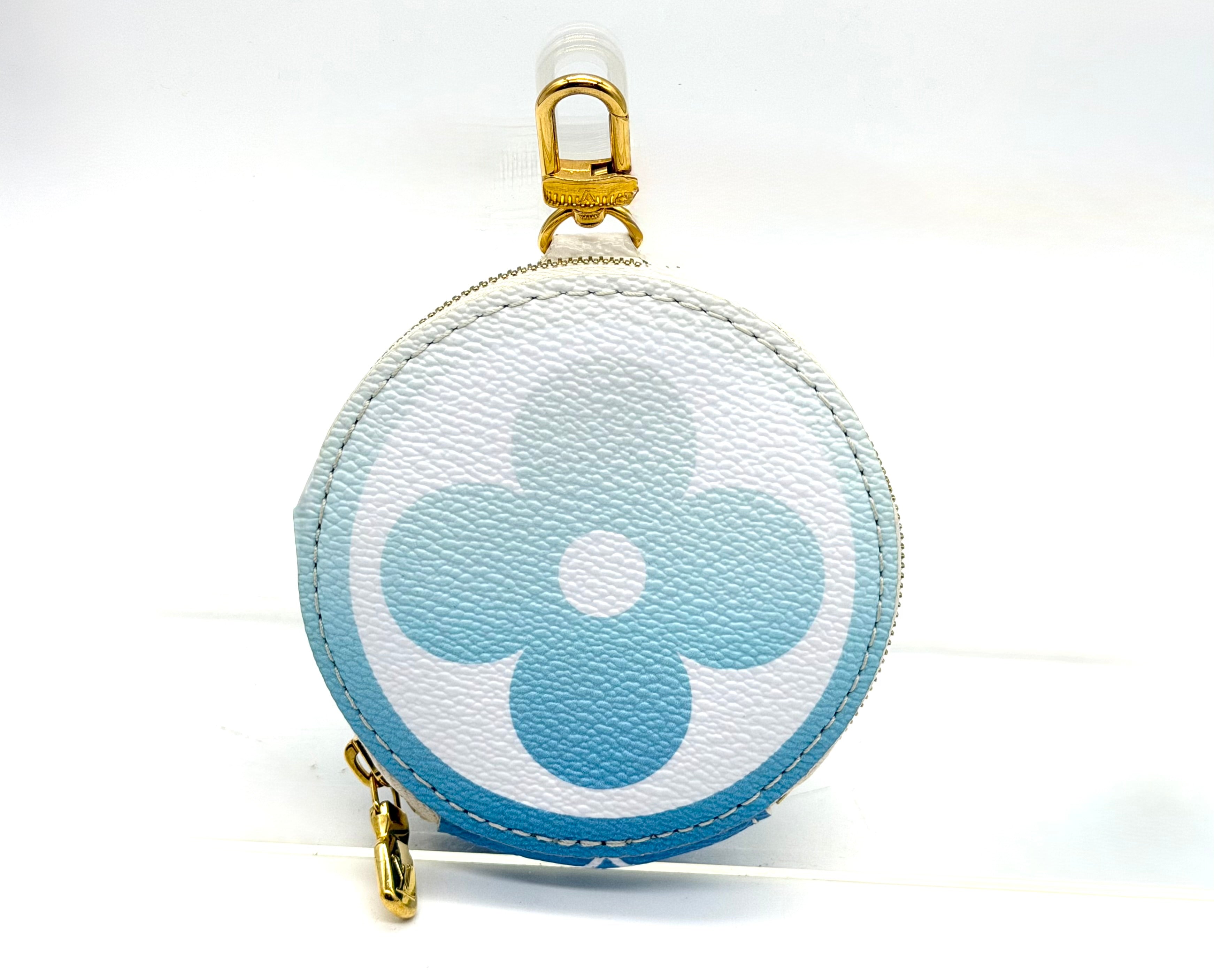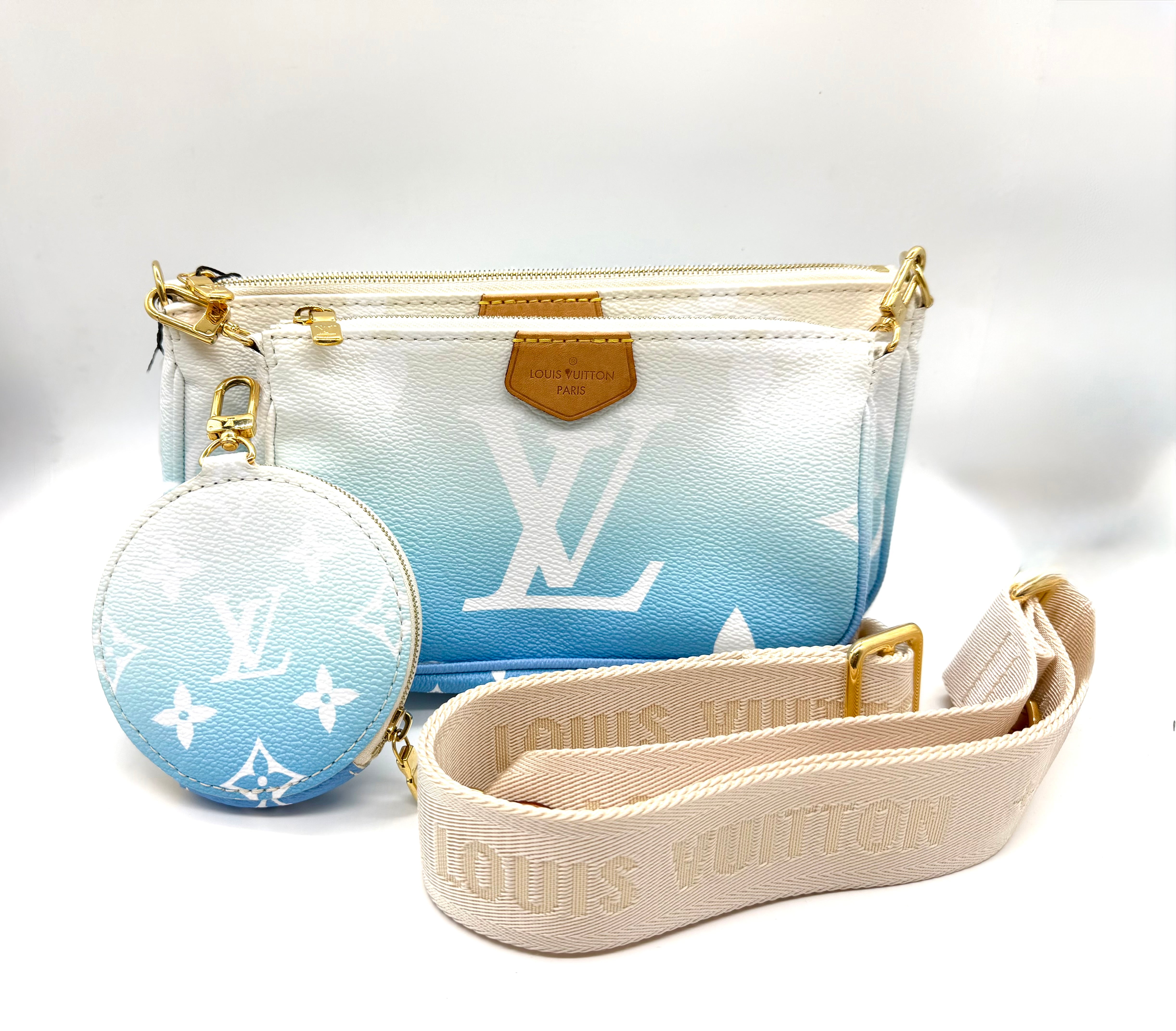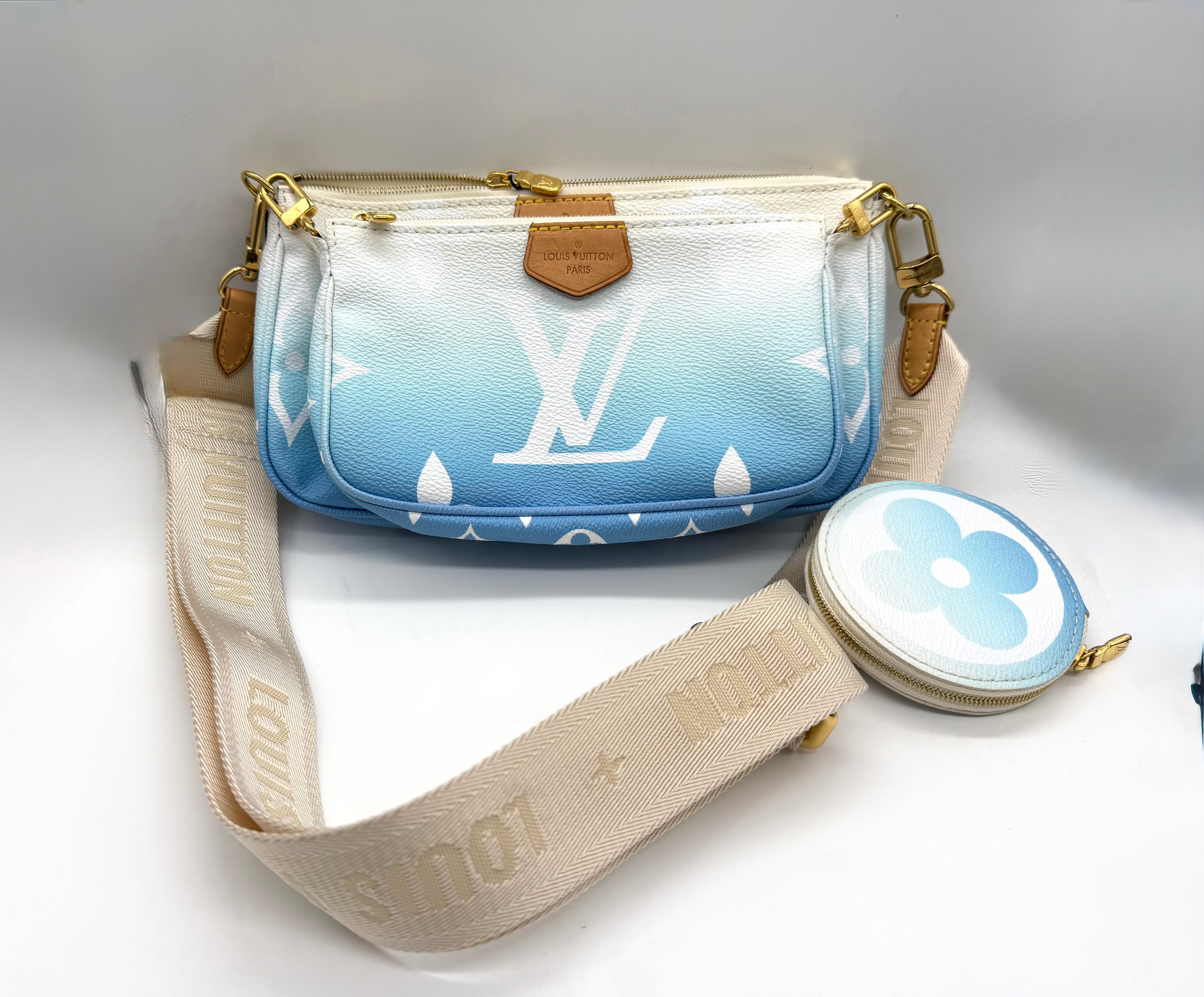 Louis Vuitton Multi Pochette Accessories from the By the Pool collection, crafted in vibrant Lagoon blue. Monogram Tiles canvas with natural cowhide trim and gold-tone hardware. This versatile set includes two zippered pouches (one rectangular pouch and one round pochette that clip together, plus a removable adjustable textile strap—perfect for carrying a phone, keys, wallet, and small essentials.