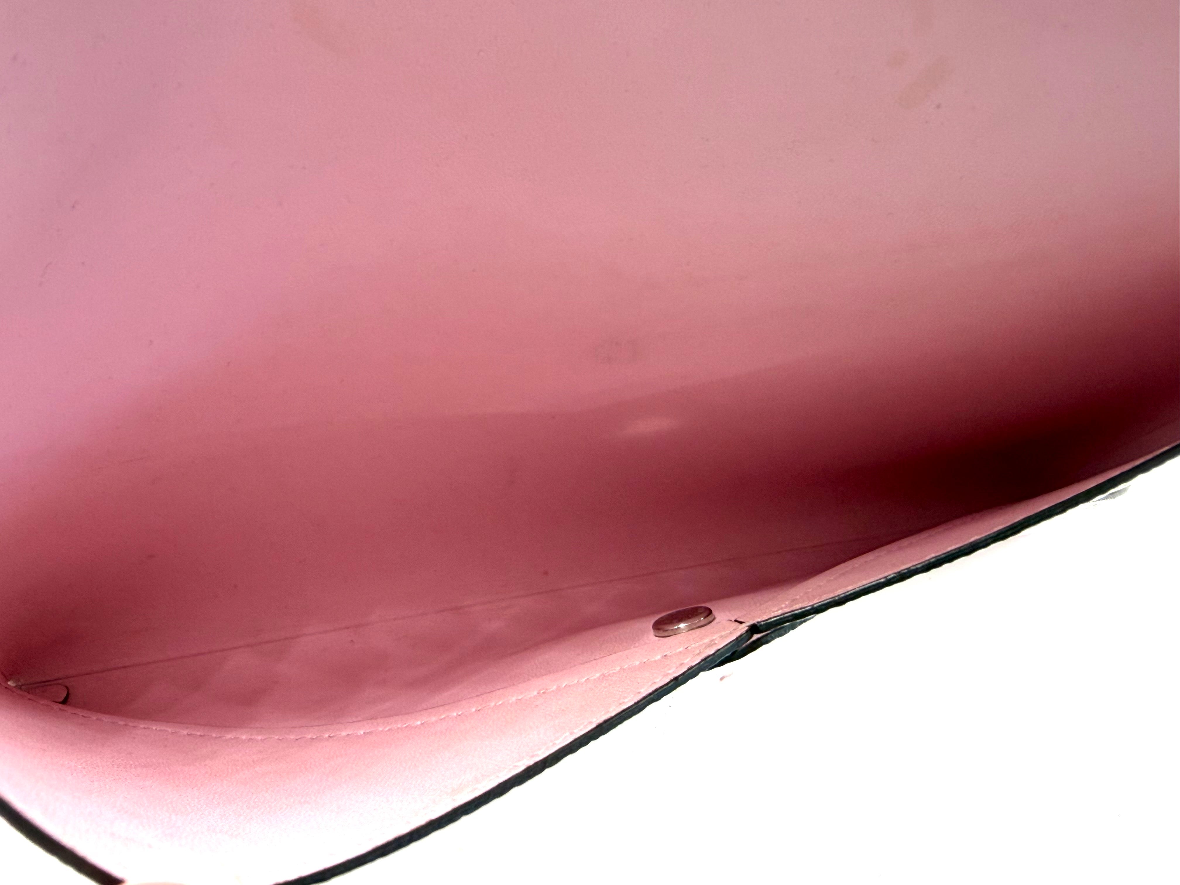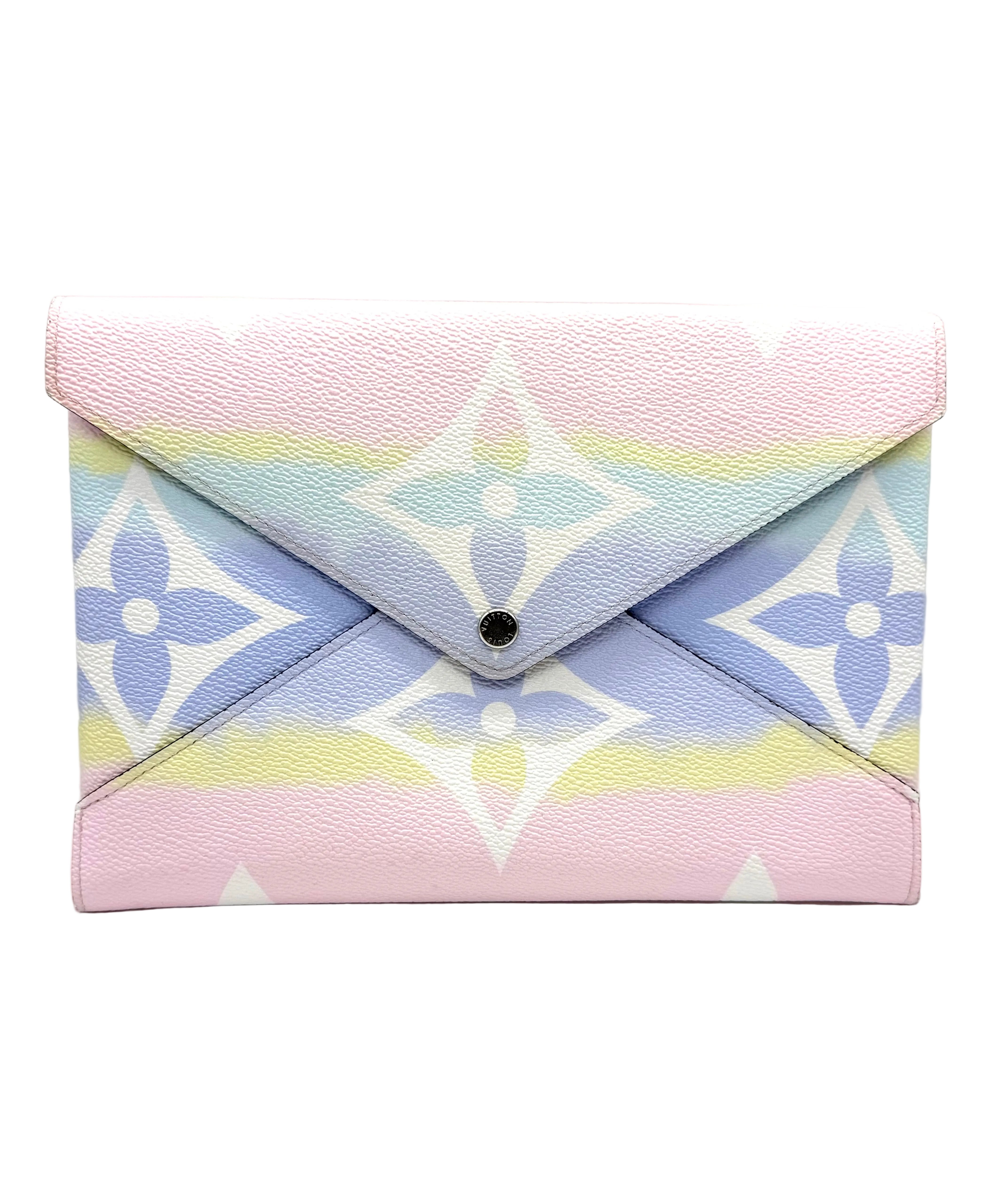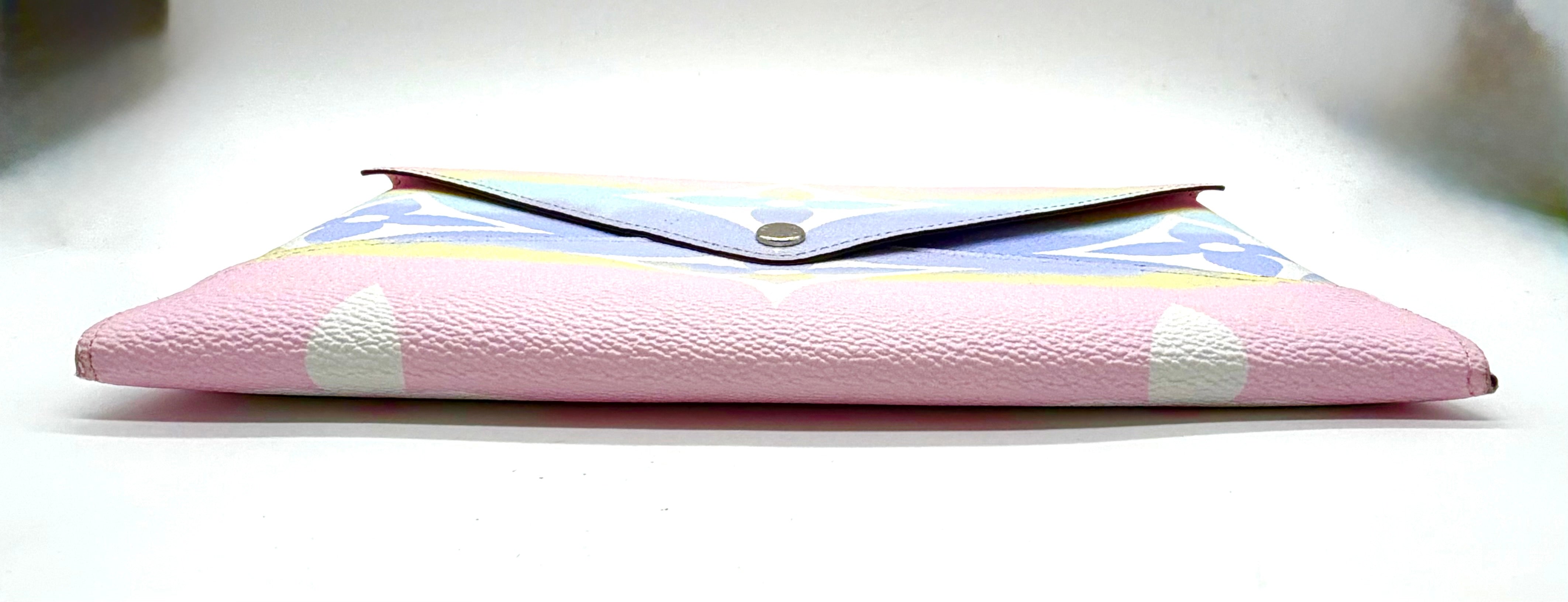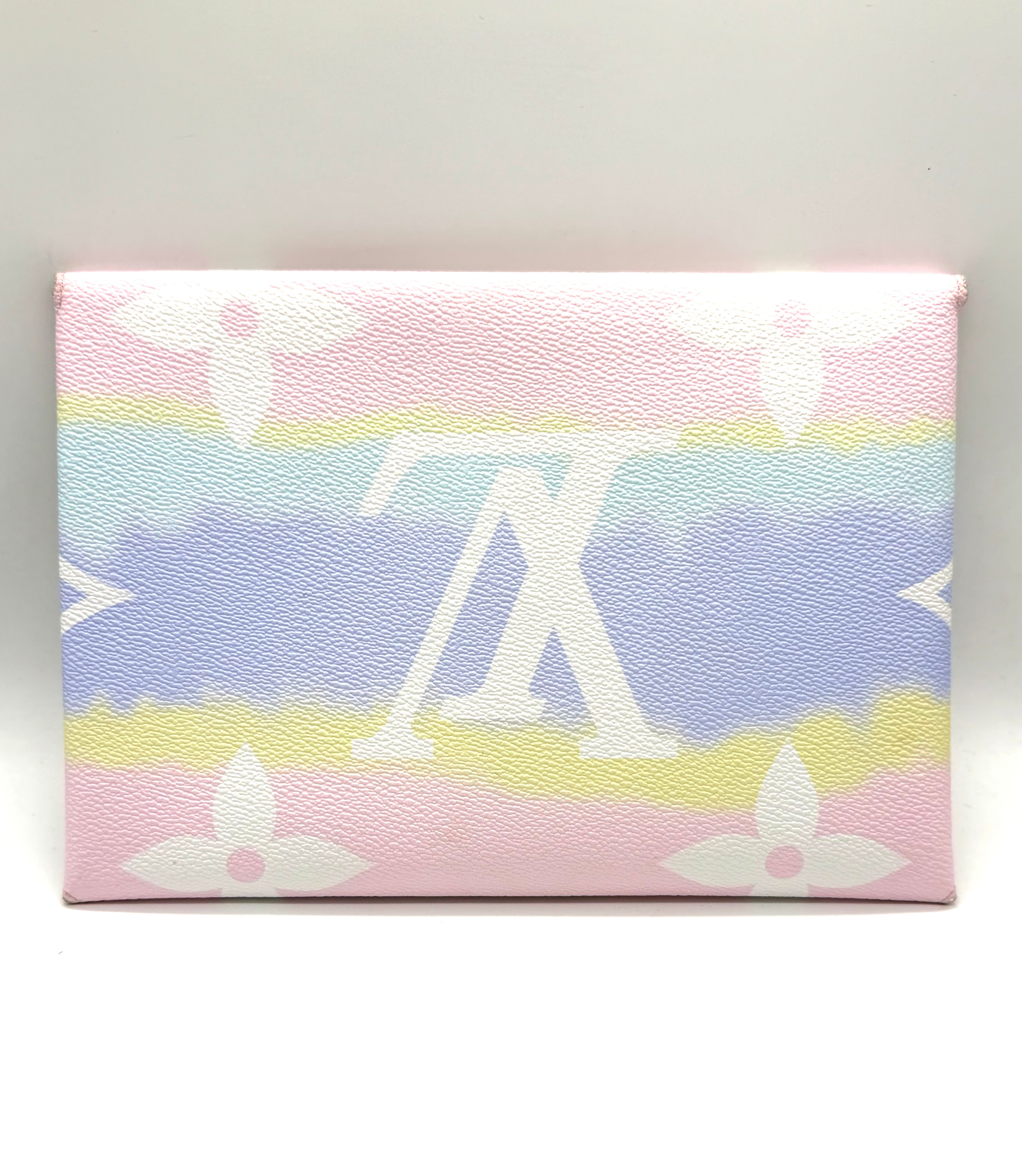LOUIS VUITTON Monogram Escale Large Kirigami Pochette in Pastel. This chic pastel pouch is crafted of classic Louis Vuitton monogram on toile canvas in multicolor. The pouch features a silver button snap and opens to a pink leather interior.