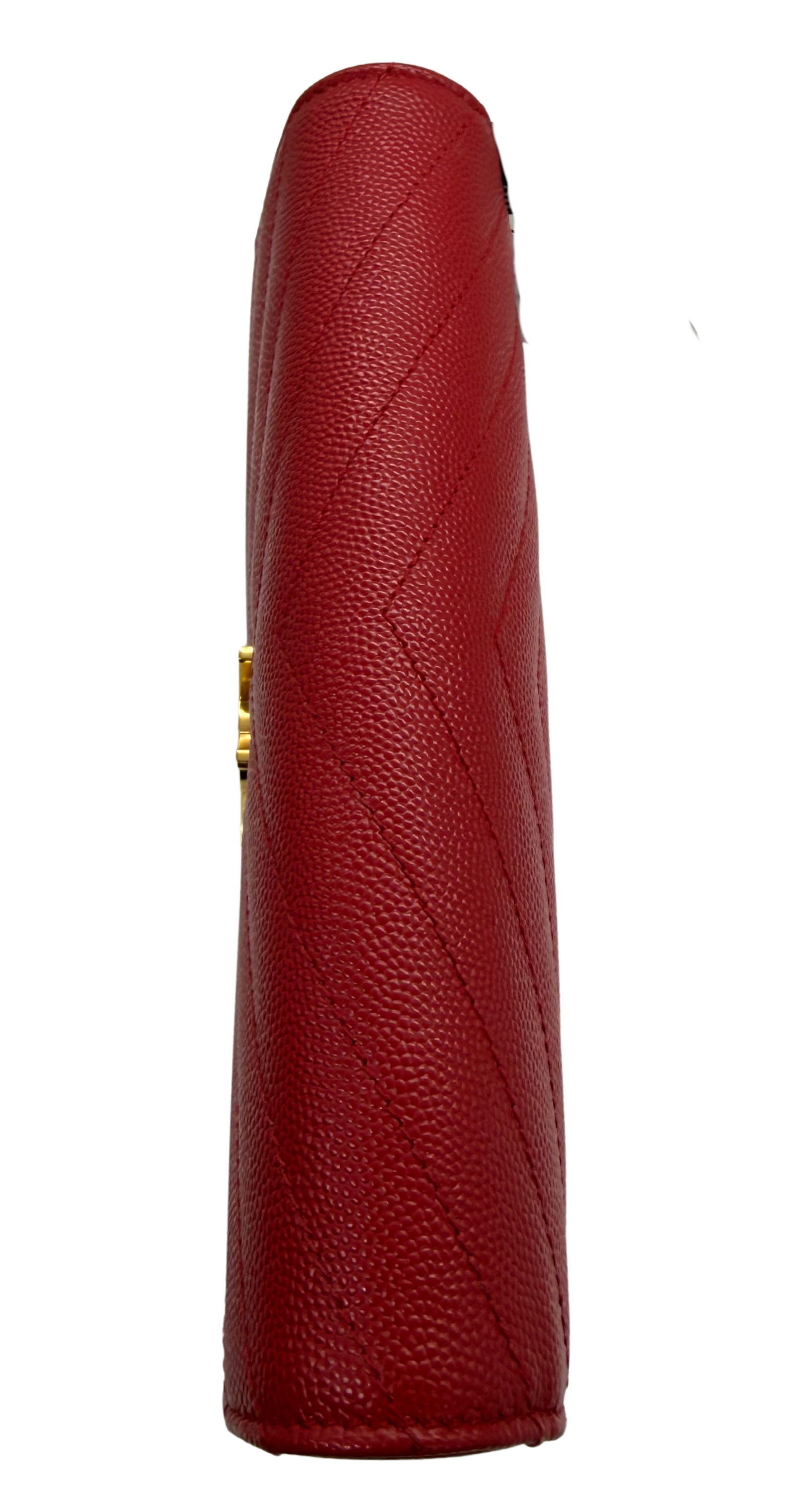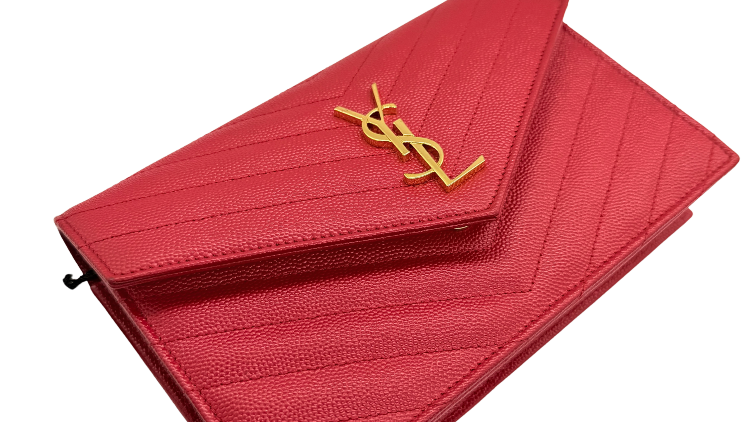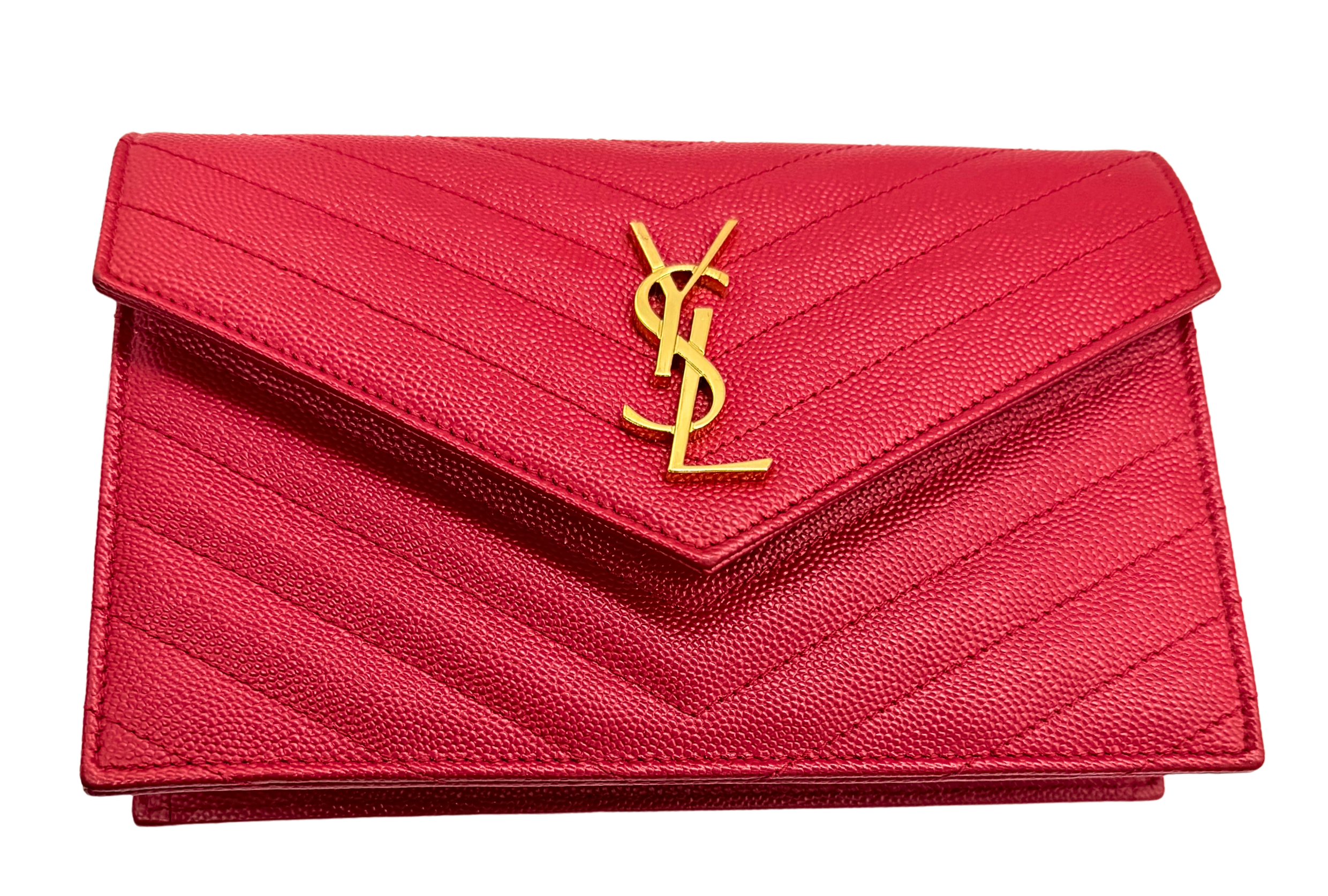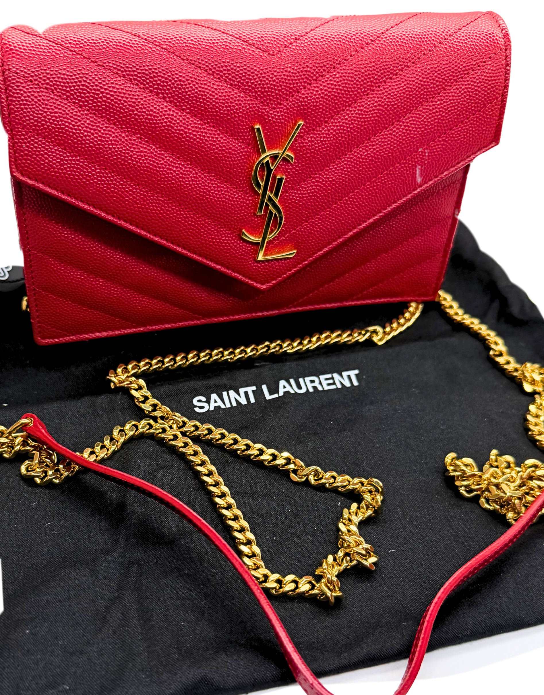 Saint Laurent Grain de Poudre Matelassé Envelope Wallet on Chain – Red with Gold Hardware