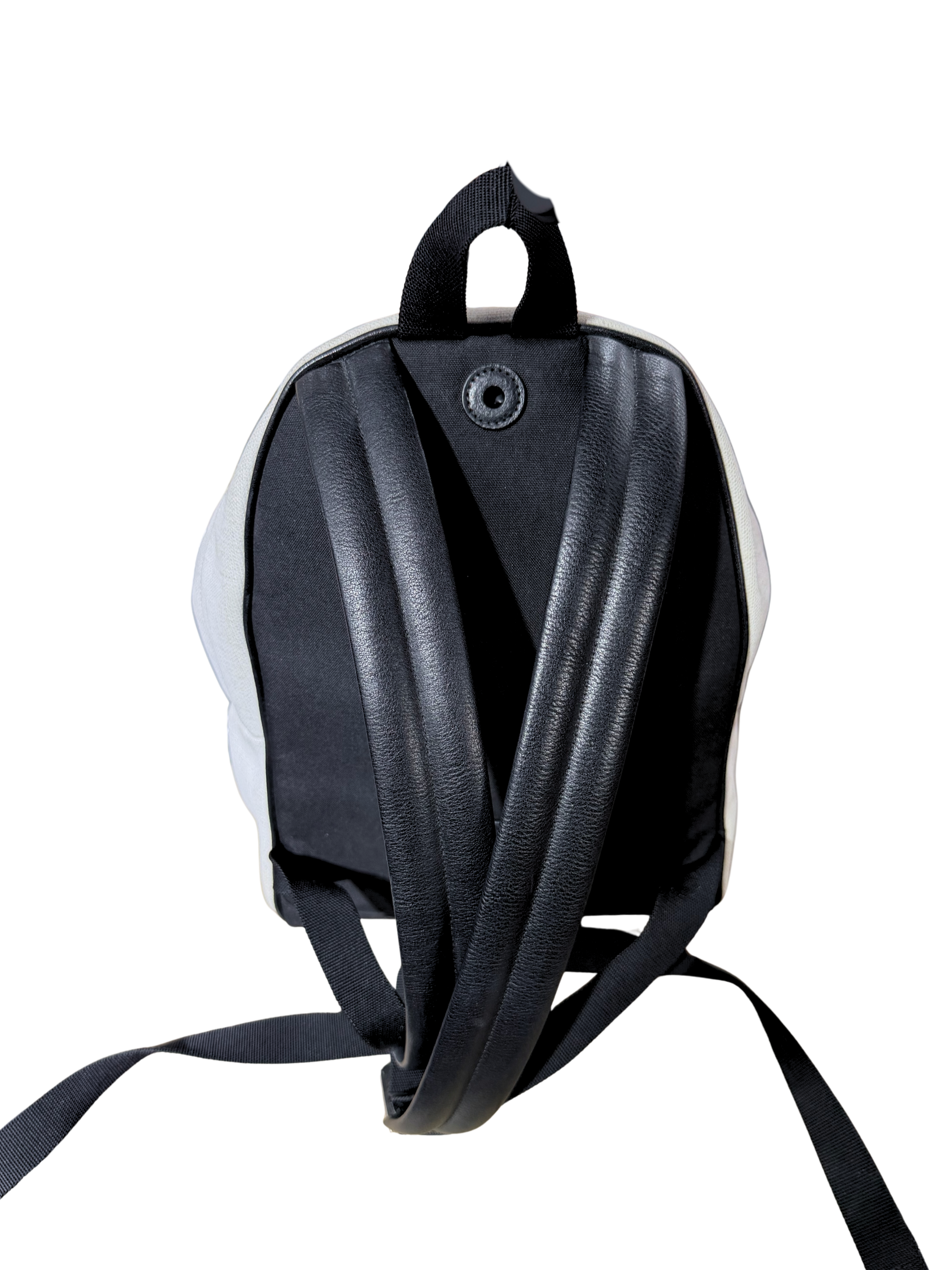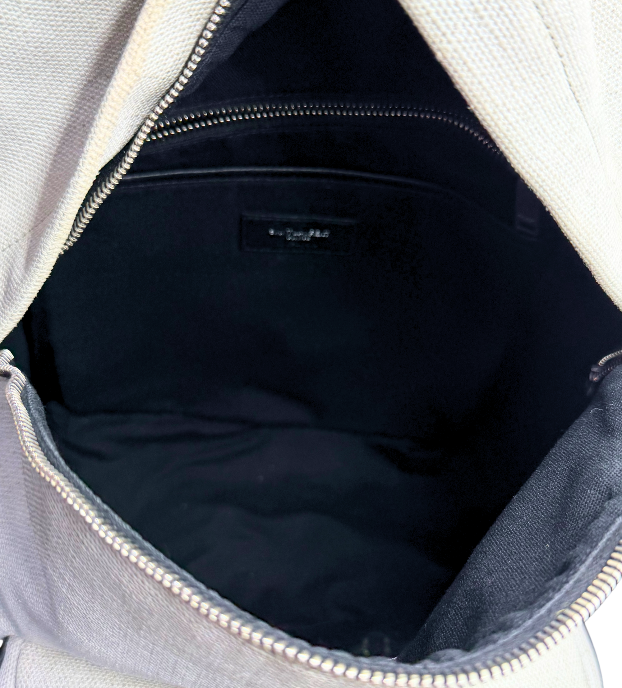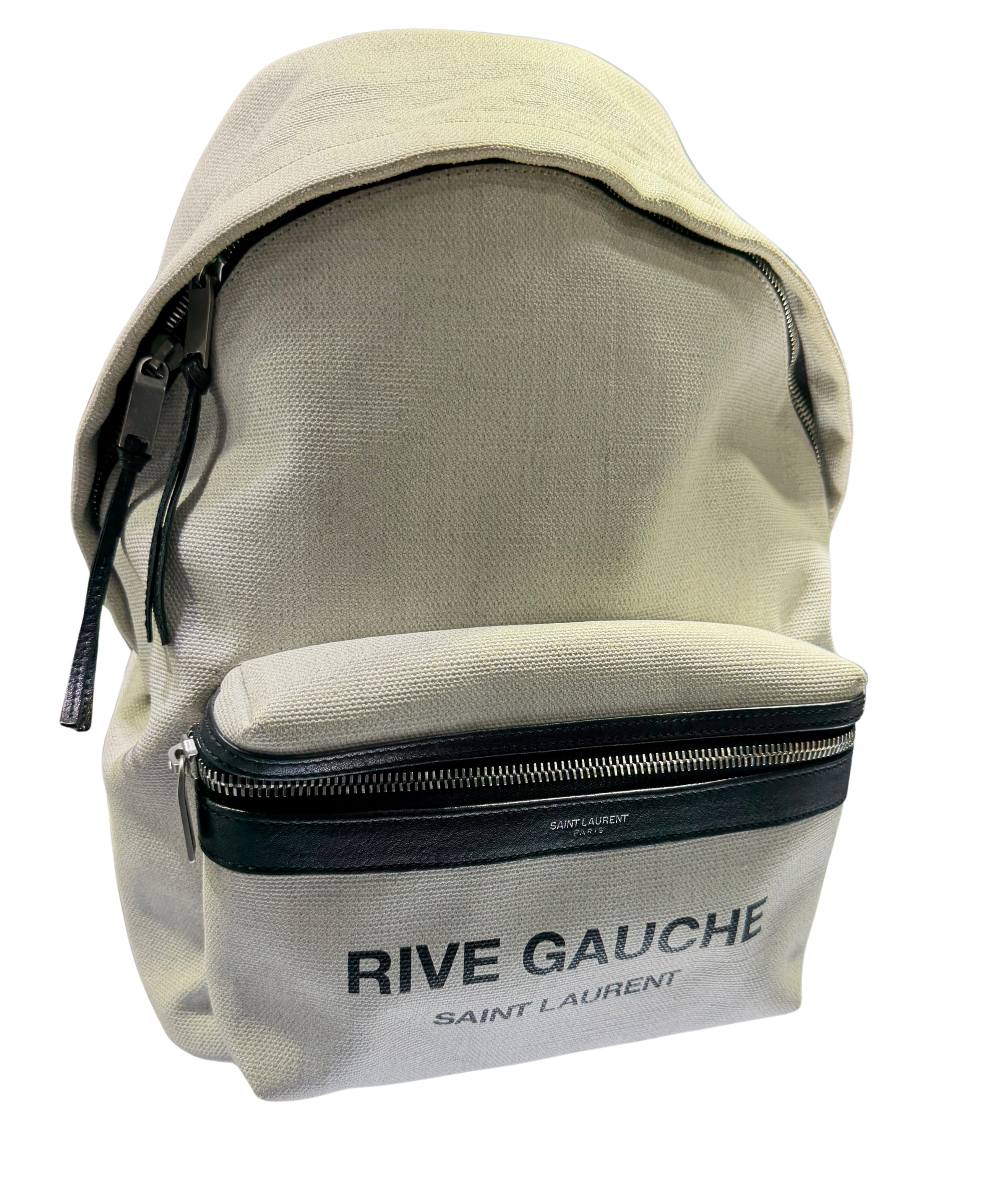 This Saint Laurent Rive Gauche City backpack is crafted in durable canvas with a clean, modern silhouette that blends luxury with everyday practicality. The exterior features the iconic Rive Gauche Saint Laurent branding on the front pocket, complemented by smooth black leather trim and silver-tone zipper hardware for a refined contrast.
