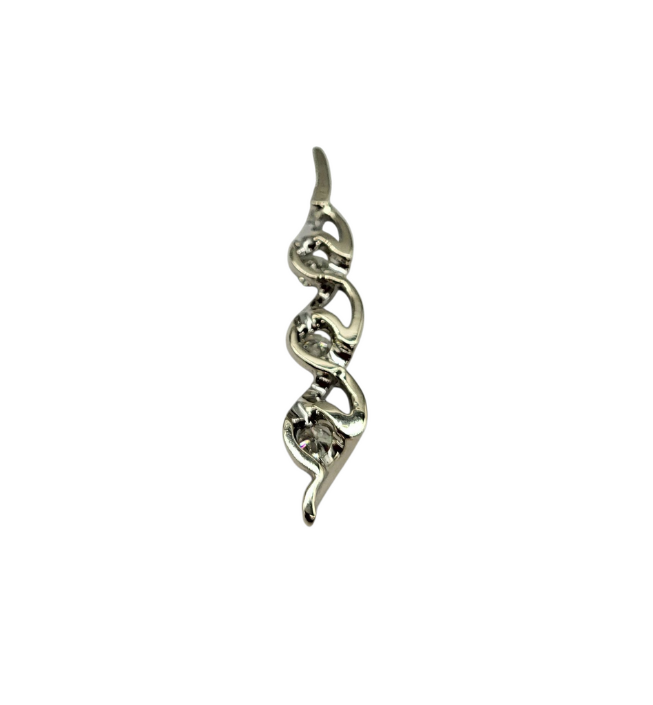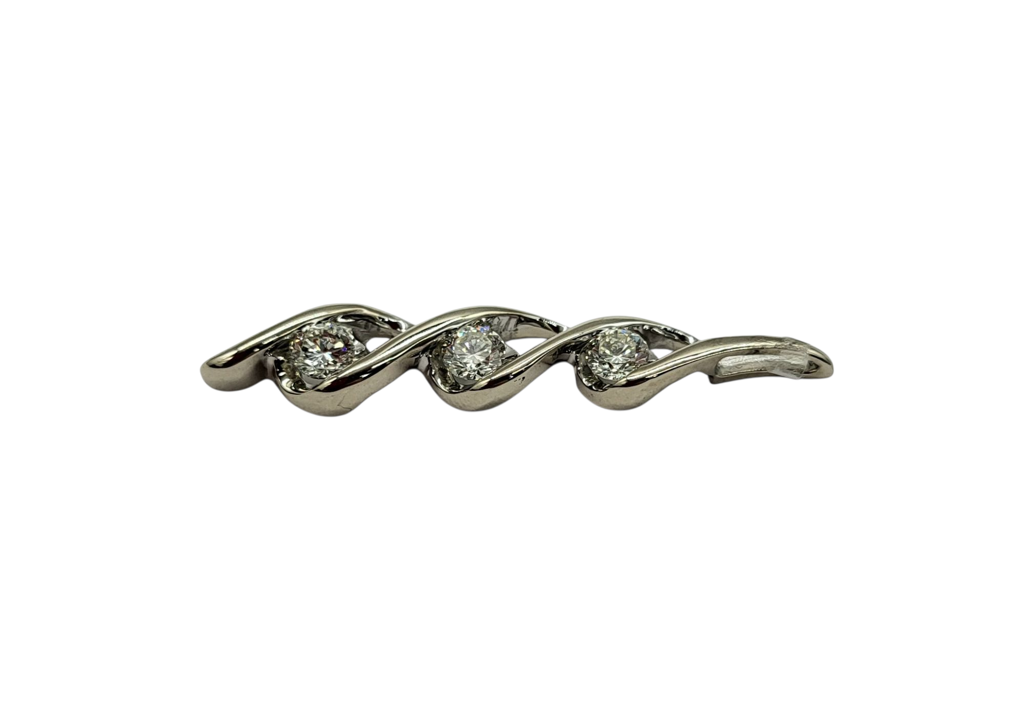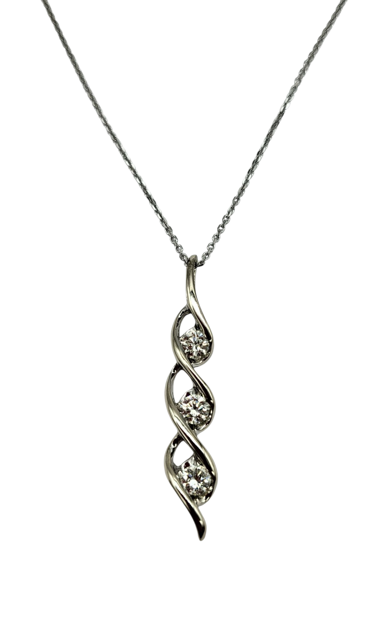 This exquisite 1/2 carat diamond pendant features three round diamonds set in a 14 karat white gold twist design. Add it to your jewelry collection for a touch of elegance and sophistication. (chain sold separately)