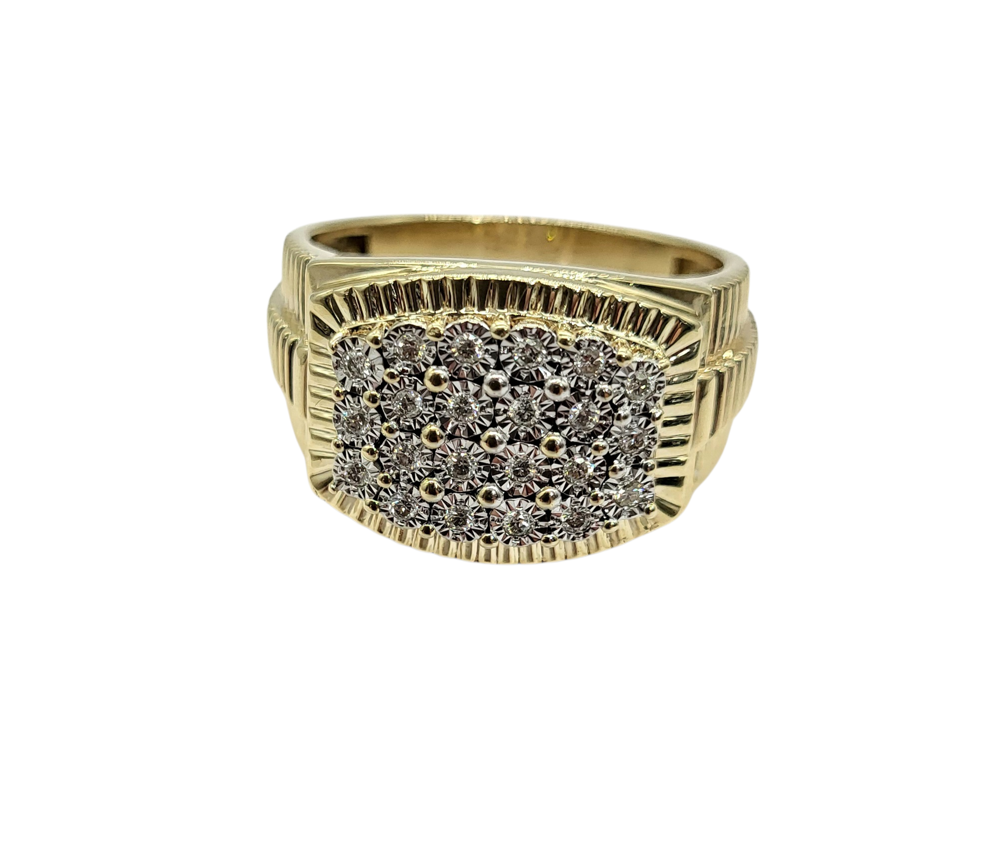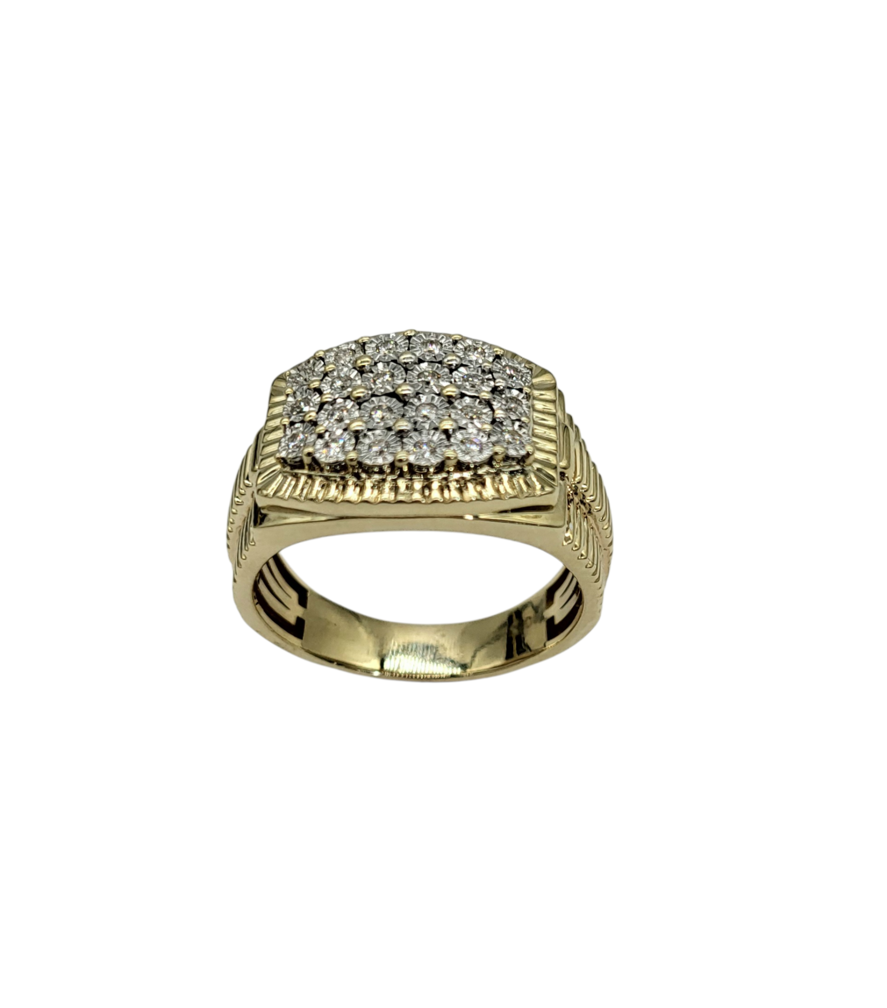 This stylish ring has a stunning 1/4 Carat Total Weight Diamond Illusion Ring. Crafted from 10 karat yellow gold, its ribbed band enhances the brilliance of the diamonds, creating a dazzling effect. Wear it to make a statement or to celebrate a special moment—this ring is more than an accessory; it’s a testament to your unique taste!