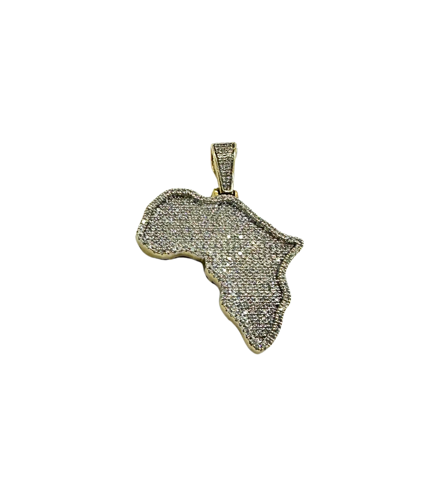 Celebrate heritage, strength, and timeless style with this striking 10k yellow and white gold Africa-shaped pendant. Expertly crafted and adorned with 1 carat total weight of glittering micro pave-set diamonds, this piece radiates brilliance and depth from every angle. The unique design captures the continent's silhouette in an elegant, powerful tribute, while the back features an intricate geometric pattern for added dimension and flair.