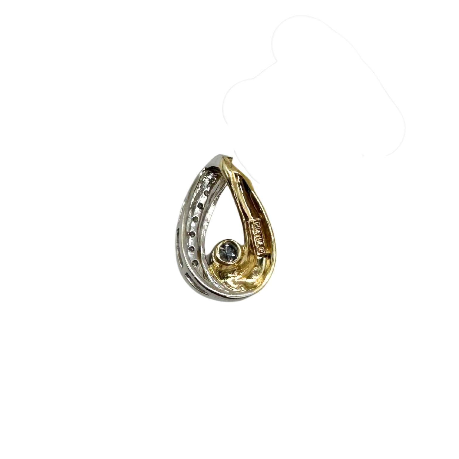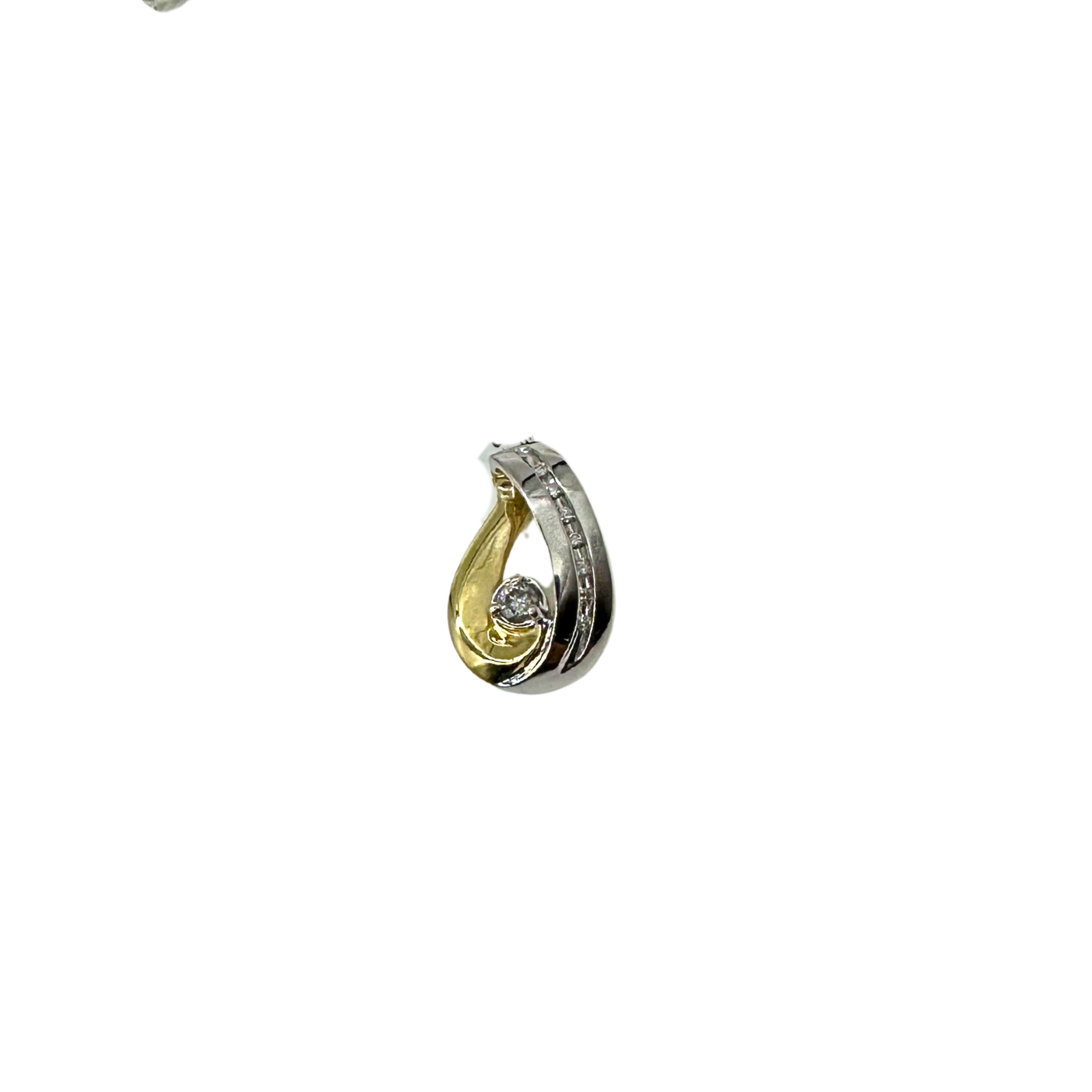 Crafted in a graceful swirl of 10k yellow and white gold, this stunning pendant showcases a teardrop design that cradles a sparkling 1/5 carat total weight diamond.