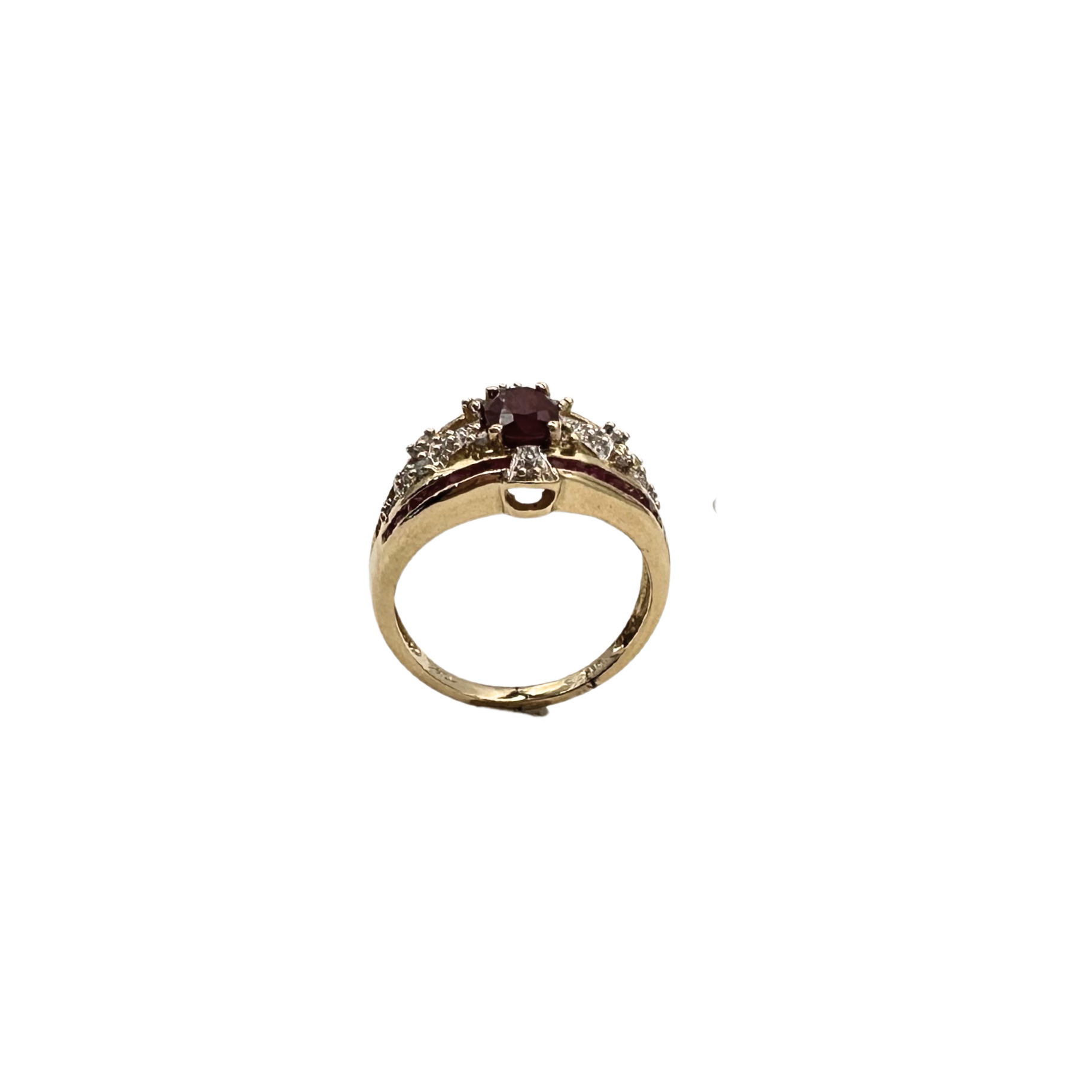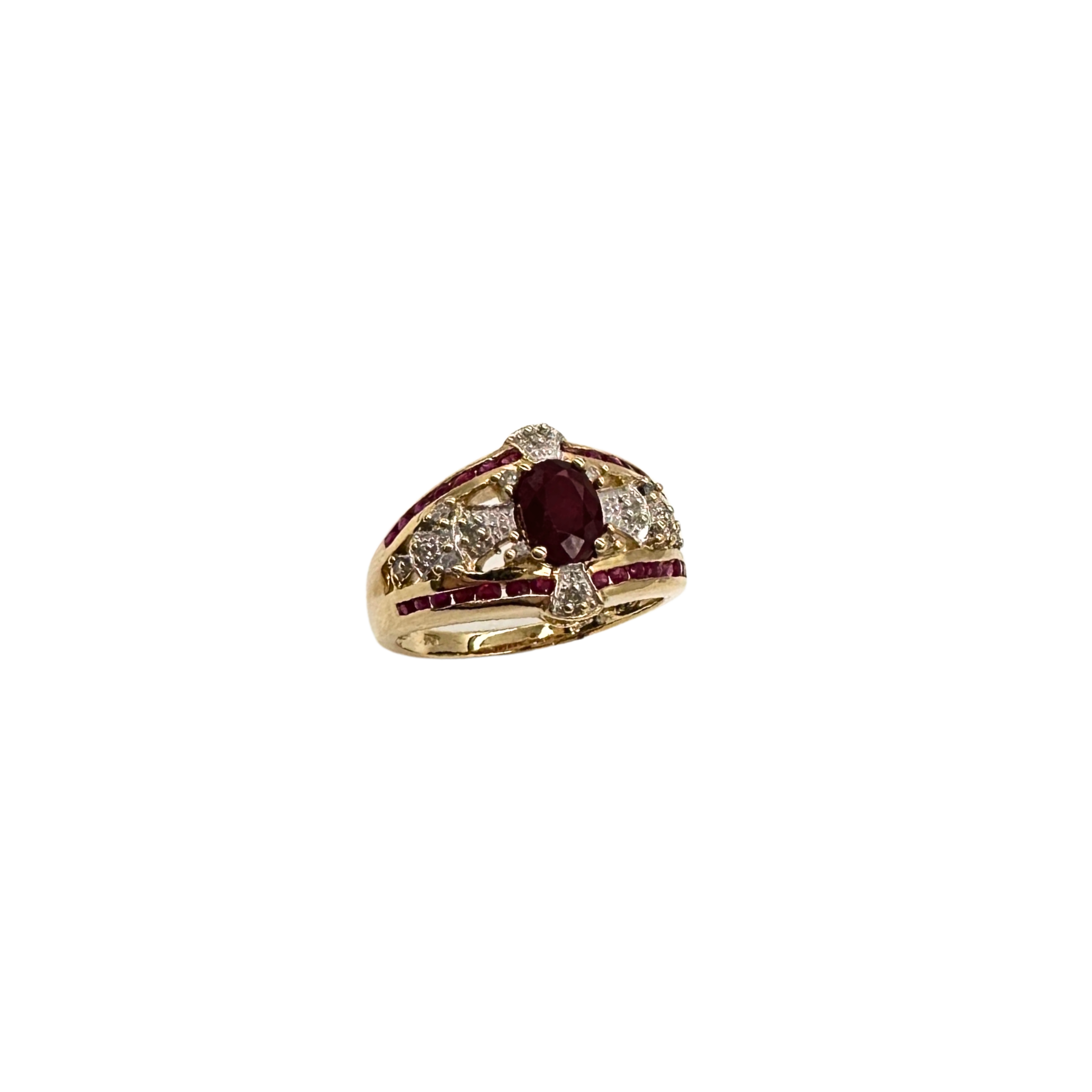 A bold and regal design, this 10k yellow and white gold ring features a striking oval-cut ruby at its center, surrounded by sparkling diamond accents that enhance its deep crimson hue. Channel-set ruby baguettes line each side, adding a luxurious touch of color and dimension. The cutout gallery detail brings elegance and lightness to the piece, creating a perfect balance between brilliance and craftsmanship.