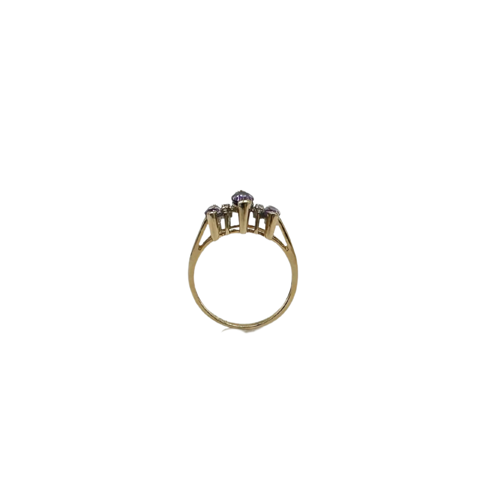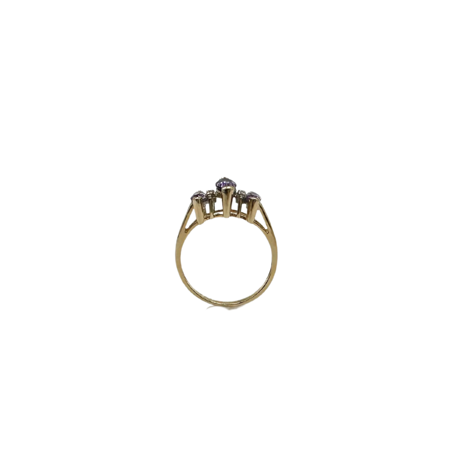 This elegant 10K yellow gold ring showcases a captivating marquise-cut amethyst at the center, flanked by sparkling diamond accents that add just the right touch of brilliance.