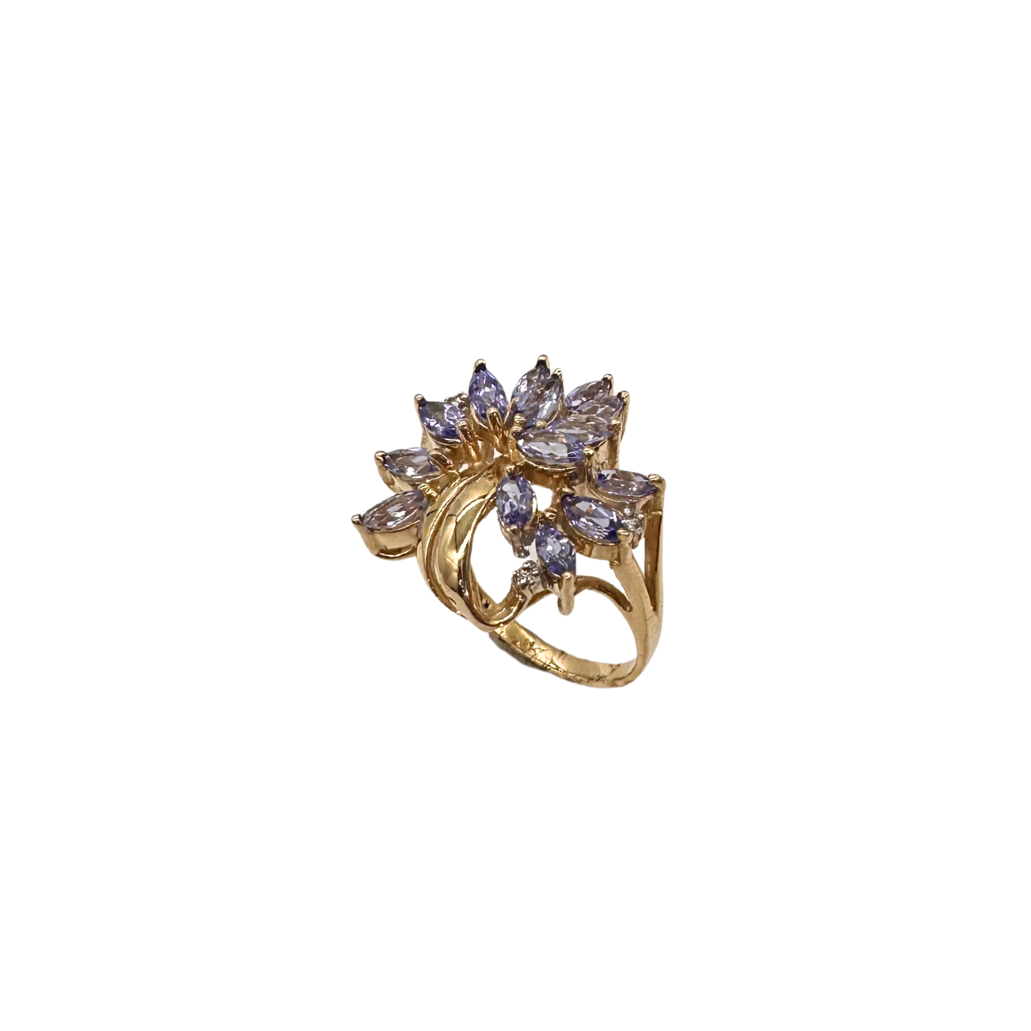 This exquisite 10k yellow gold ring features a stunning bouquet-inspired design adorned with marquise-cut tanzanite stones. The double ribbon setting elegantly wraps around the finger, creating a graceful and dimensional look that highlights each violet-blue gemstone. The intricate arrangement gives the appearance of a blooming floral cluster, adding a touch of timeless sophistication and romantic charm.