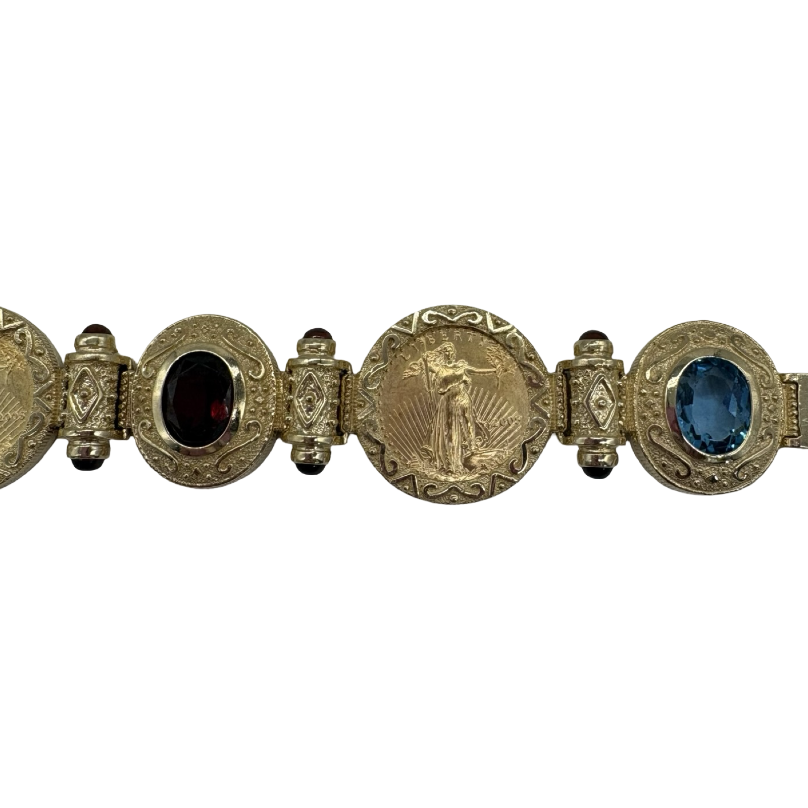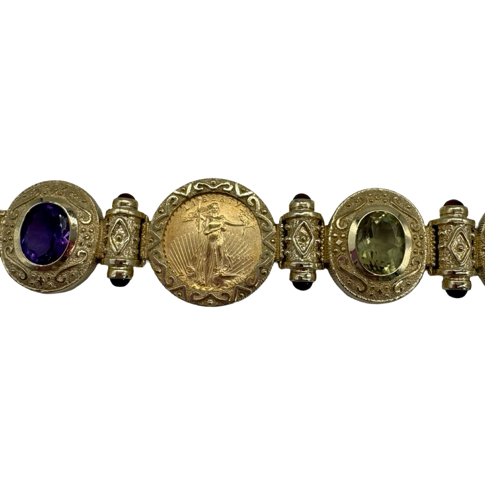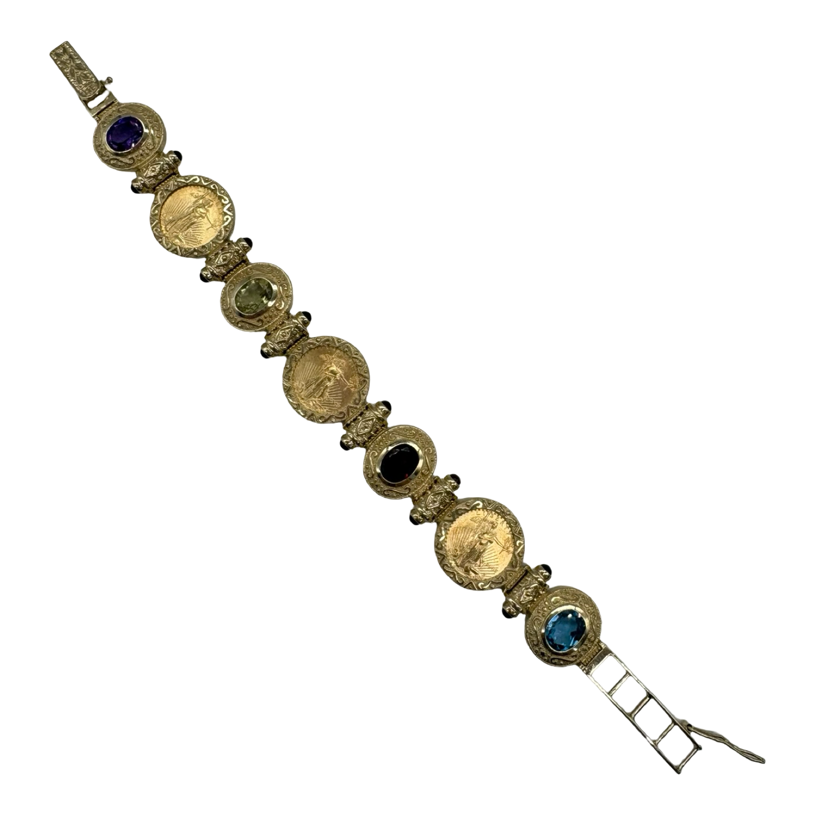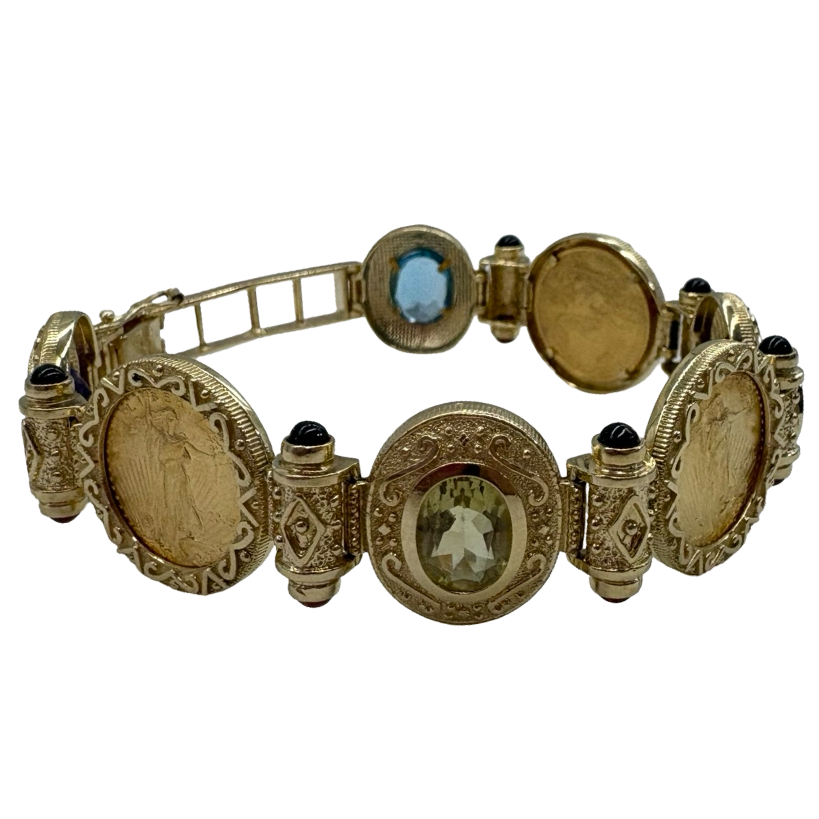 14K Yellow Gold Bezel Gold Coin Bracelet with Multi Color Stones