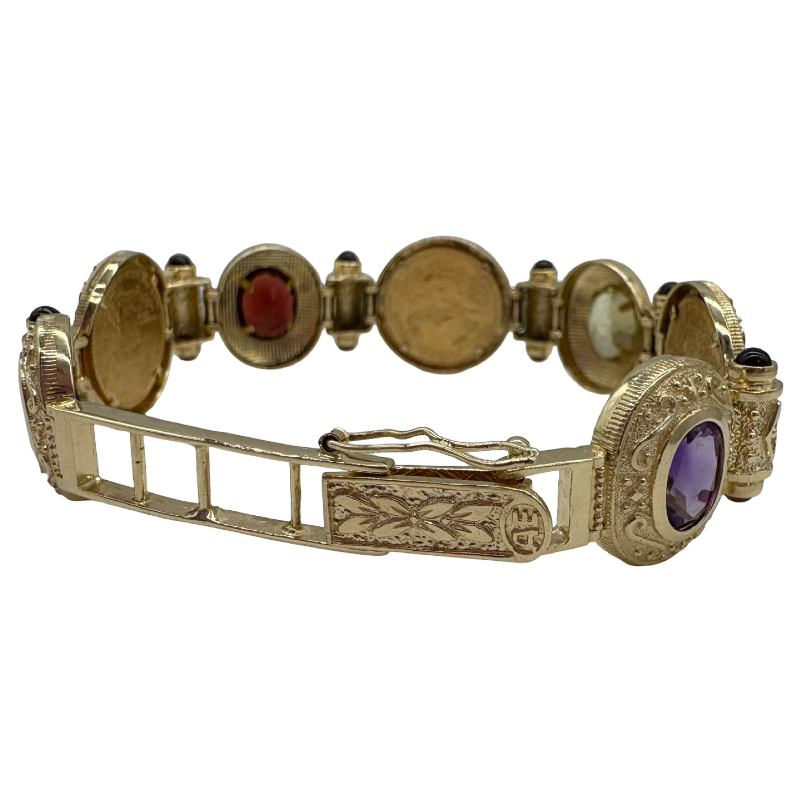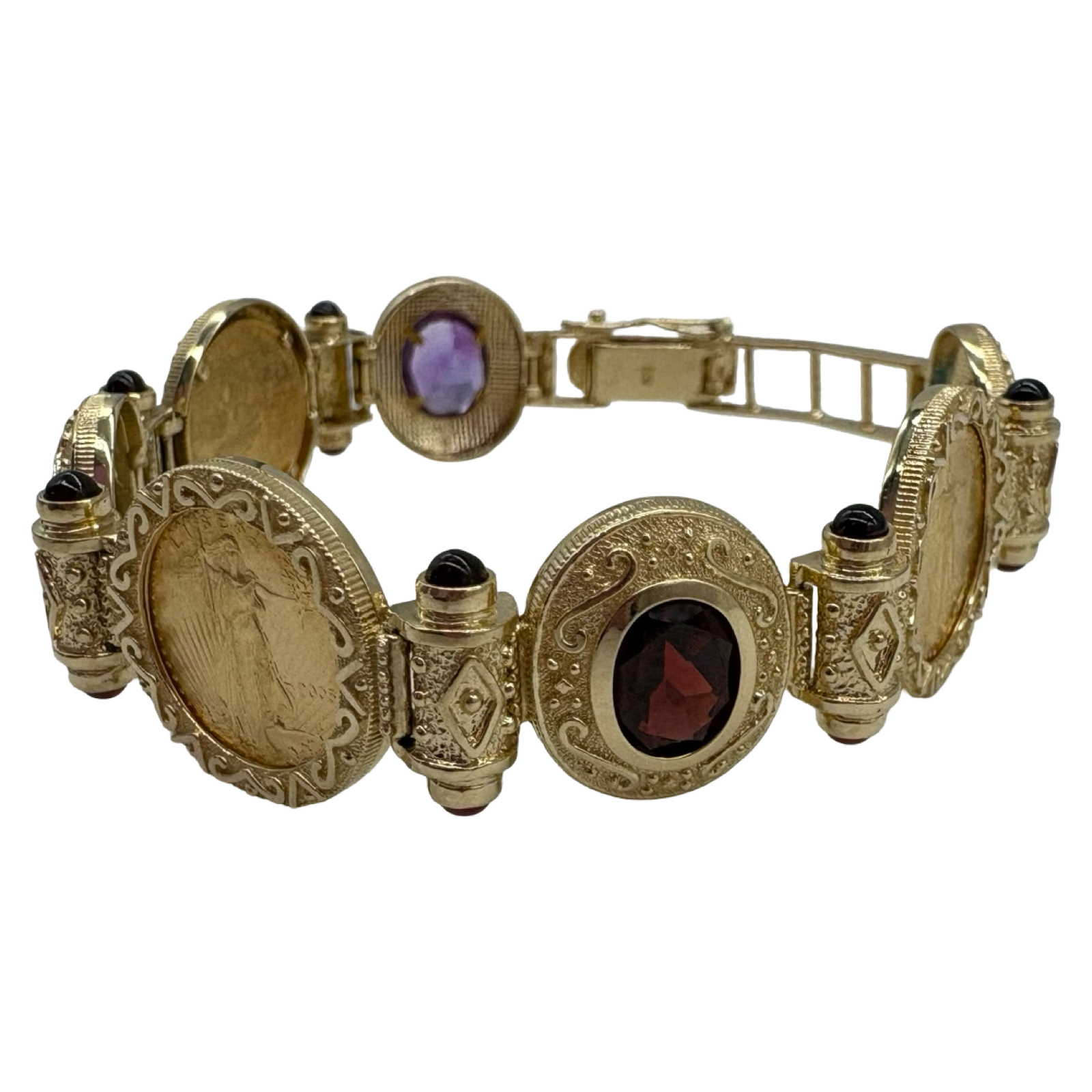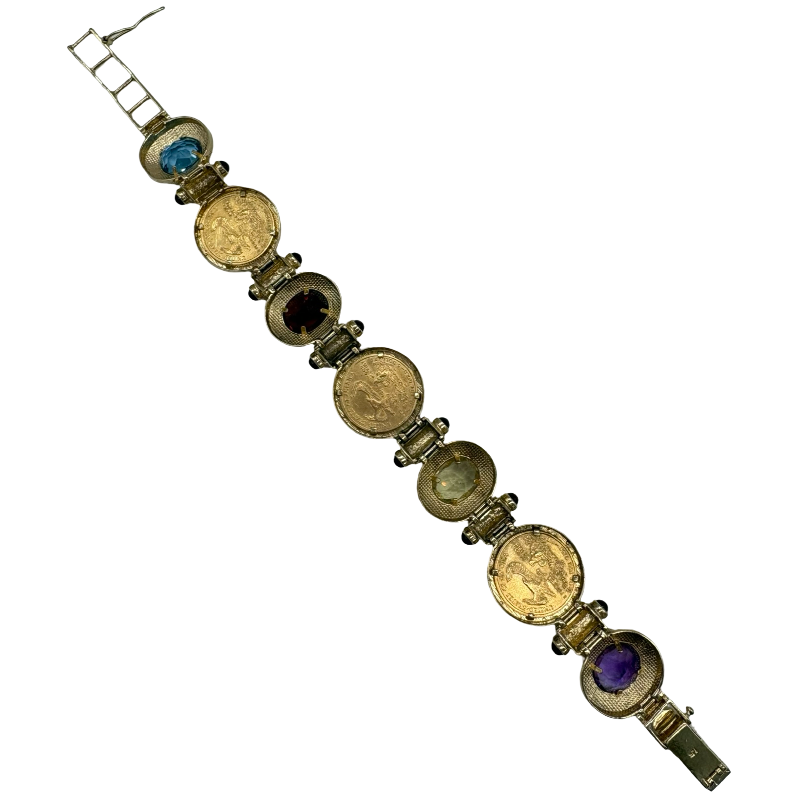 14K Yellow Gold Bezel Gold Coin Bracelet with Multi Color Stones