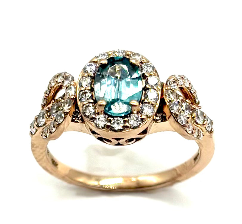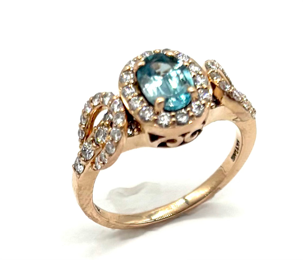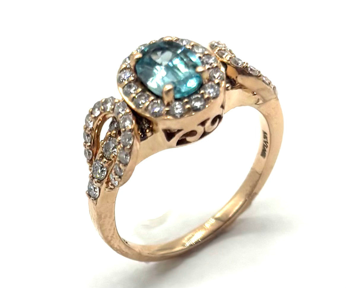 Add a touch of luxury and elegance to your collection with this stunning pre-owned Le Vian ring. Crafted in 14K rose gold, this exquisite piece showcases a vibrant oval-cut blue topaz center stone, beautifully accented by sparkling natural round diamonds for timeless brilliance.