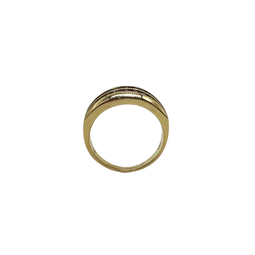 Crafted in a unique blend of 14k white and yellow gold, the band’s polished edges contrast beautifully with the rows of shimmering diamonds, giving it a modern yet timeless appeal. Weighing 7.3 grams and sized at 10, this ring is built to impress—ideal for someone who appreciates strength and sophistication in their jewelry.