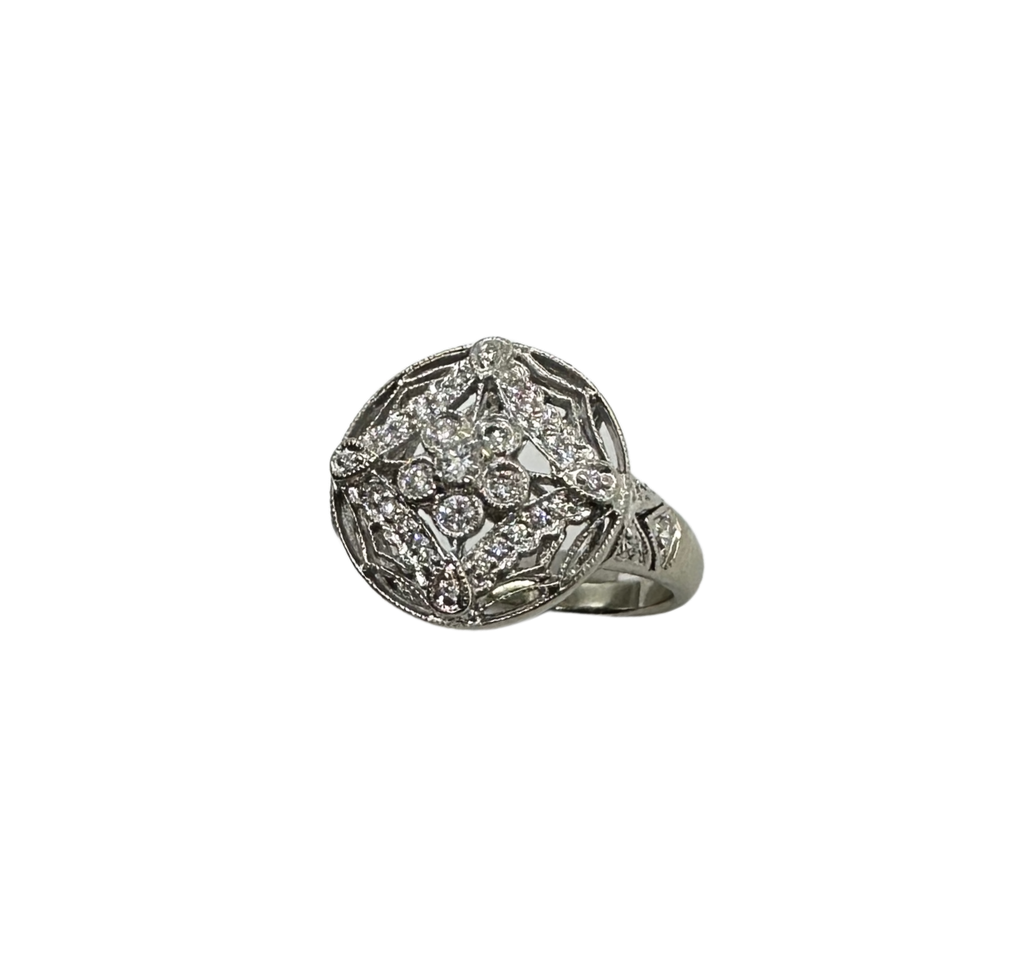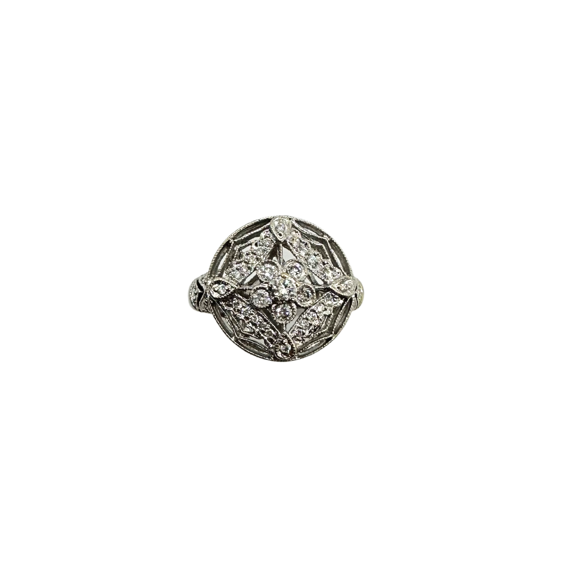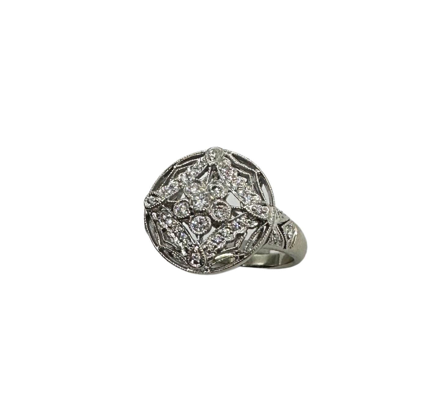 Step back in time with this captivating 14k white gold ring, featuring a vintage-inspired Art Deco design with ornate milgrain detailing. At the center of this heirloom-worthy piece lies a cluster of sparkling round diamonds totaling 1/2 carat, carefully arranged in a bold geometric pattern that channels the sophistication of the 1920s. The openwork filigree adds depth and elegance from every angle, making it a showstopper whether worn alone or layered.