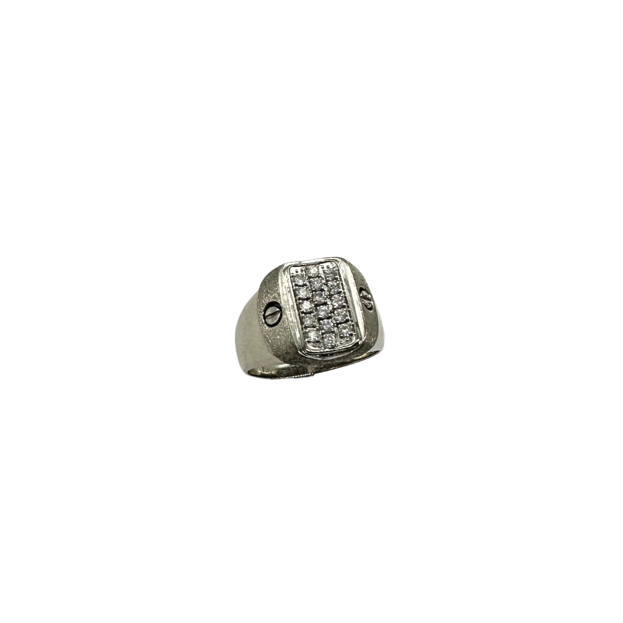 Bold, modern, and masculine — this standout men’s ring blends rugged industrial charm with refined brilliance. Crafted in 14k white gold, it features a three-row pave setting of sparkling round-cut diamonds totaling approximately 1/2 carat. Two screwhead accents flank the diamond panel, lending a sleek mechanical vibe to the squared face of the ring.