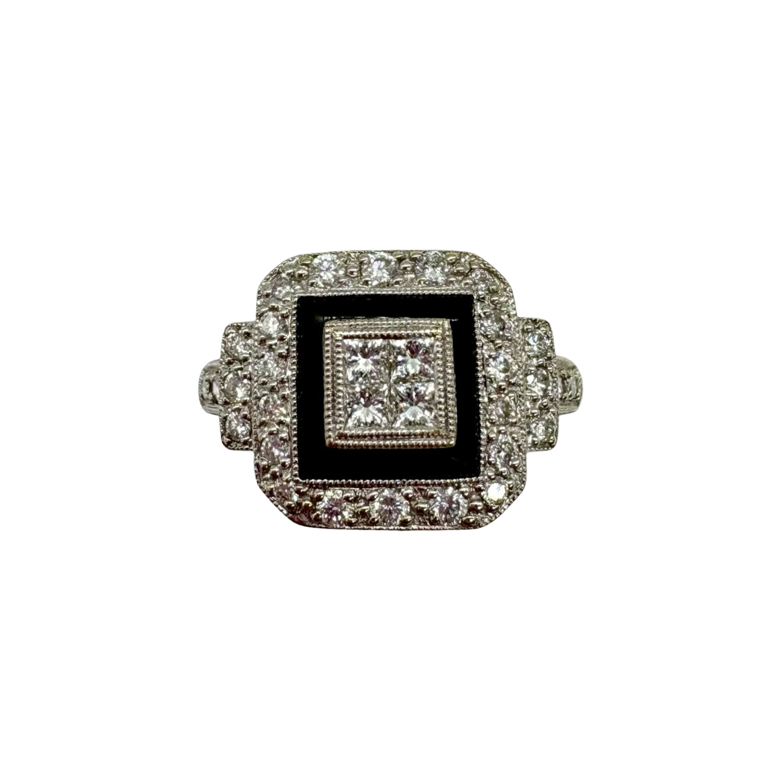 14K White Gold 1CTW Diamond Black Onyx Quad Halo Ring