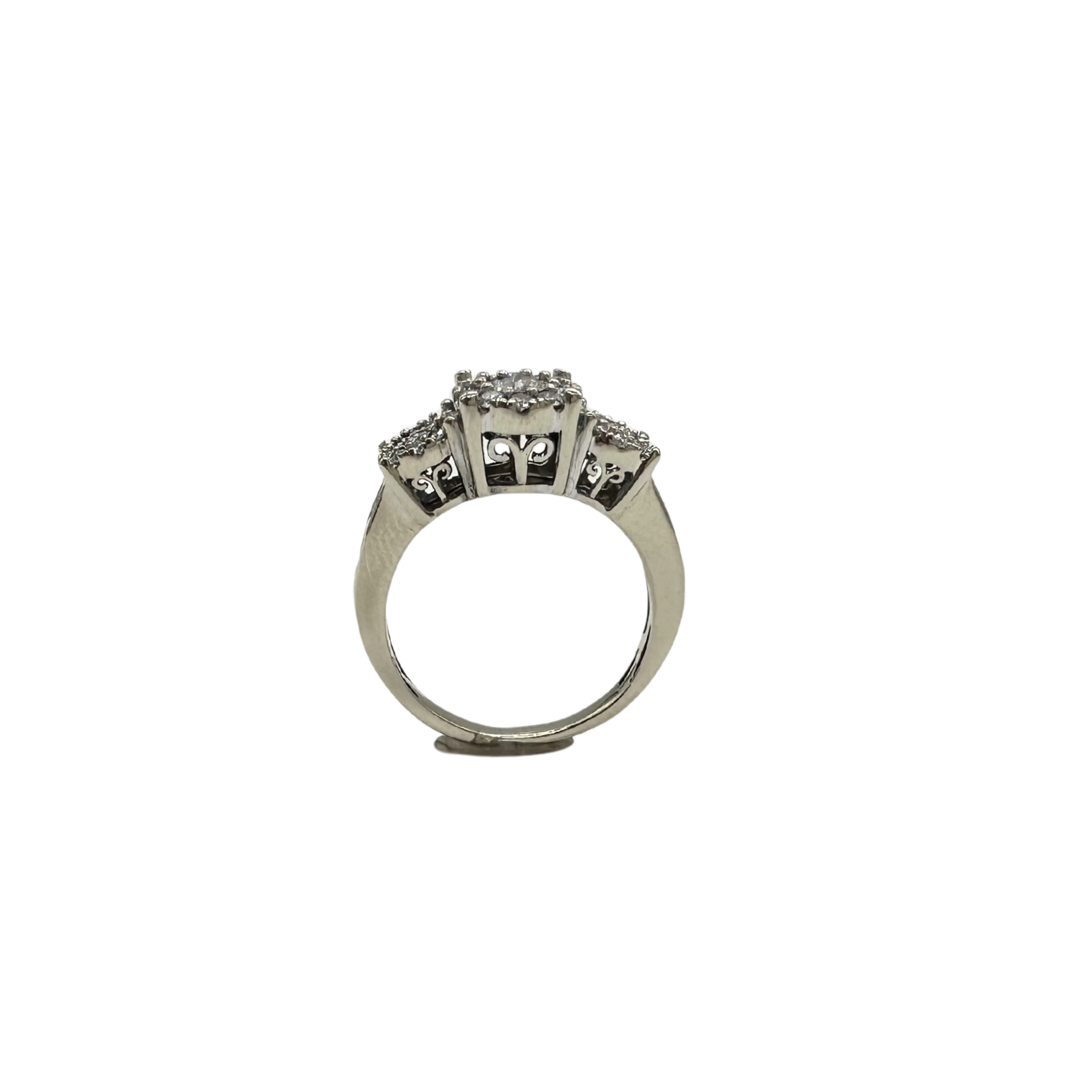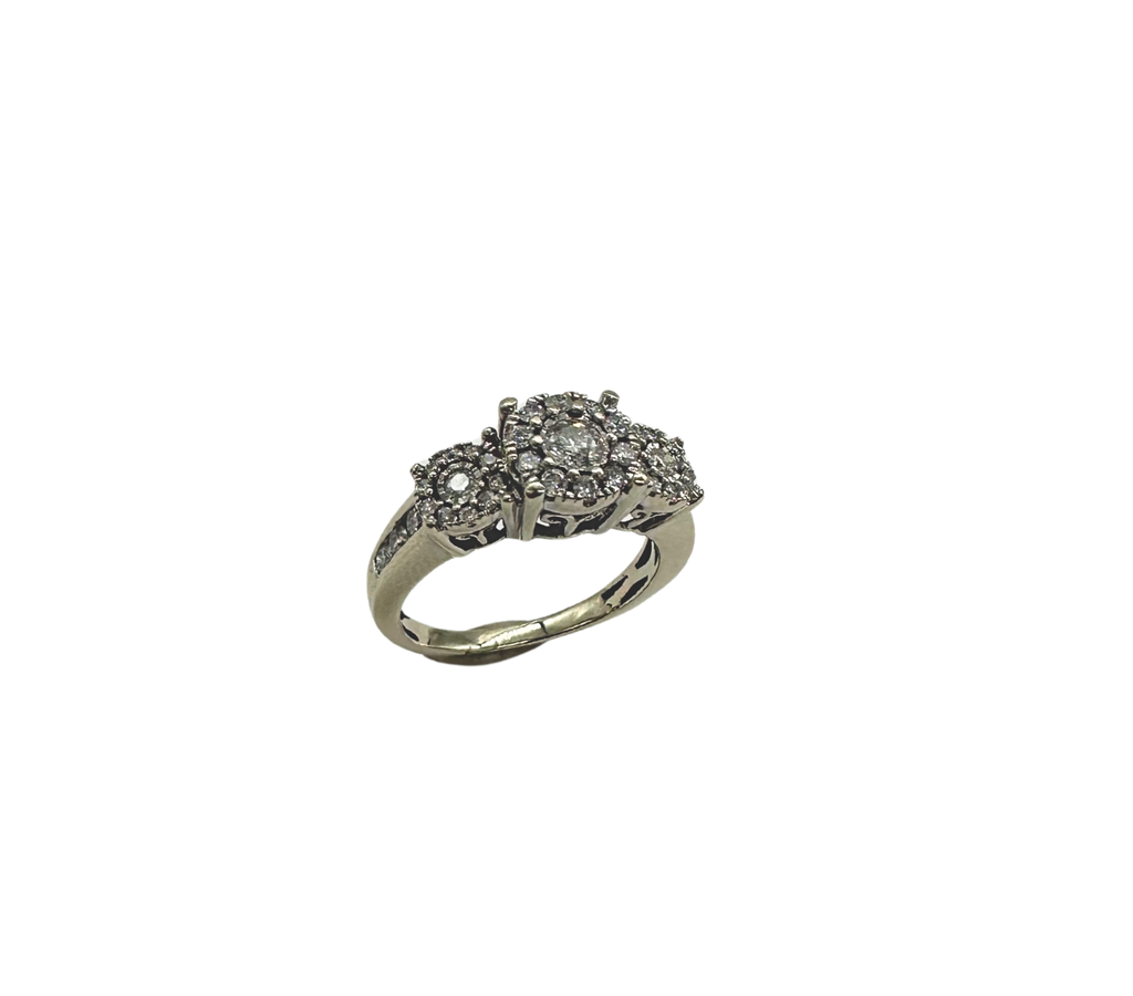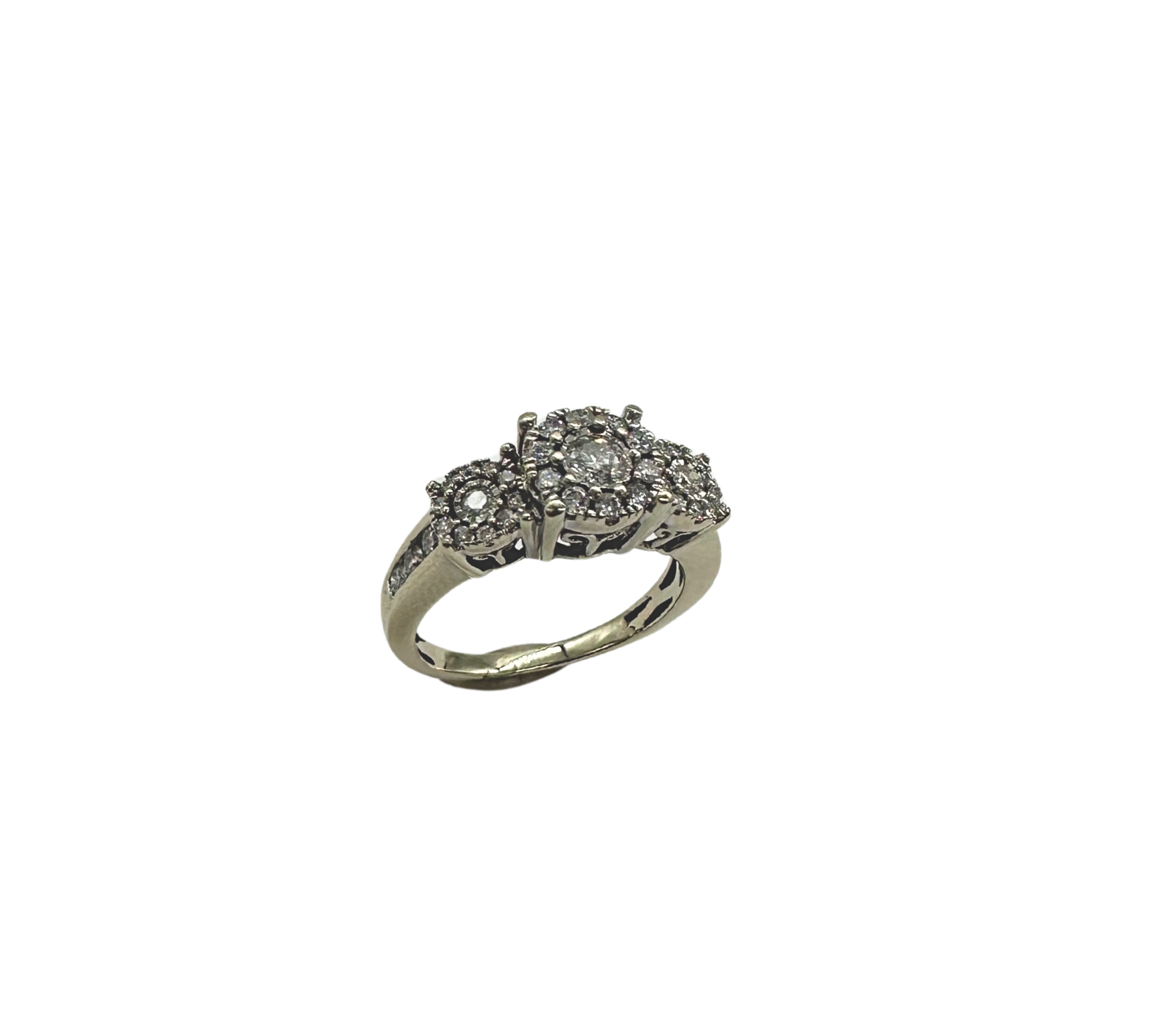 Crafted in 14k white gold, this elegant ring showcases a 3/4 carat total weight diamond illusion cluster design. The central diamond cluster is accented by additional stones on each side, giving the piece a brilliant three-stone effect with enhanced sparkle.