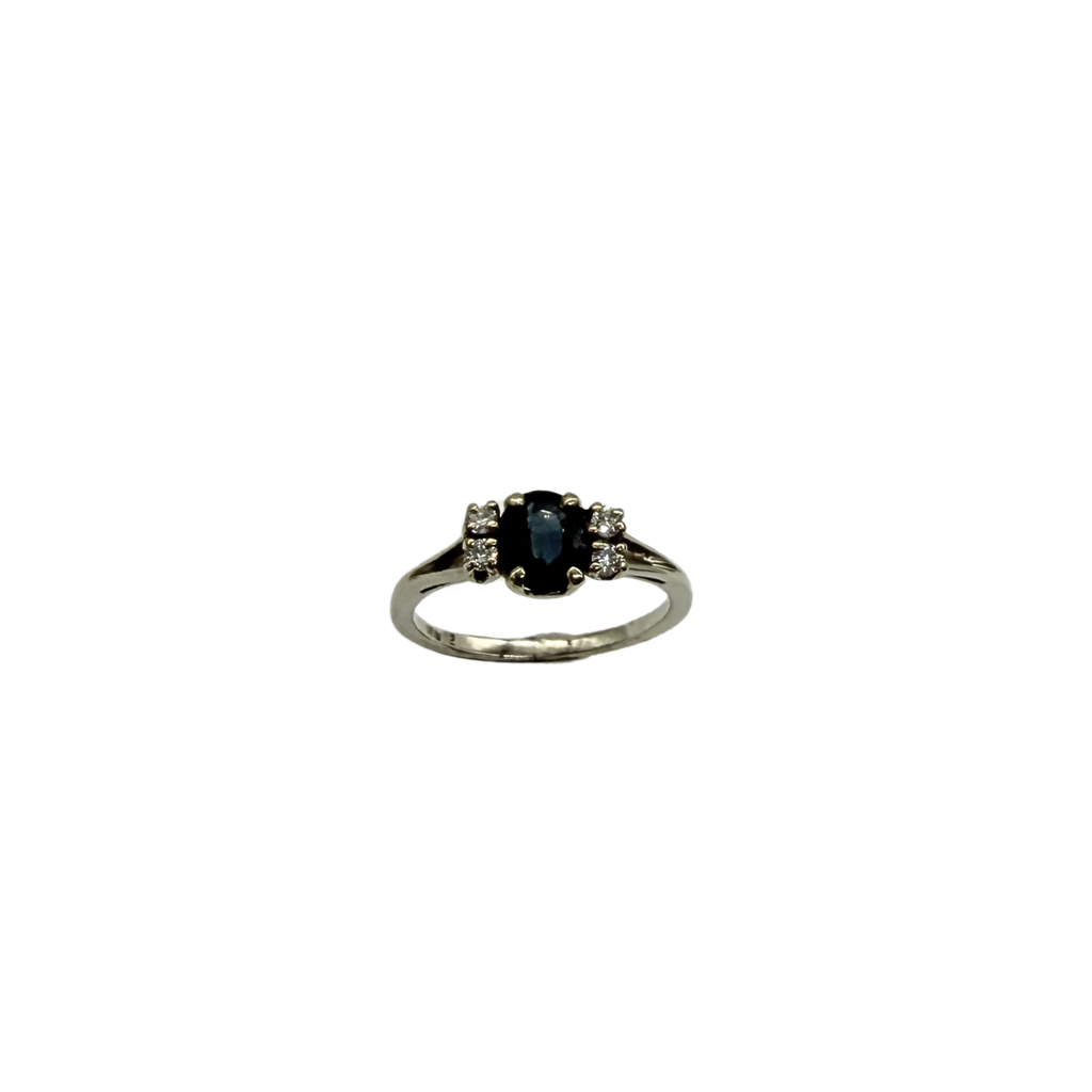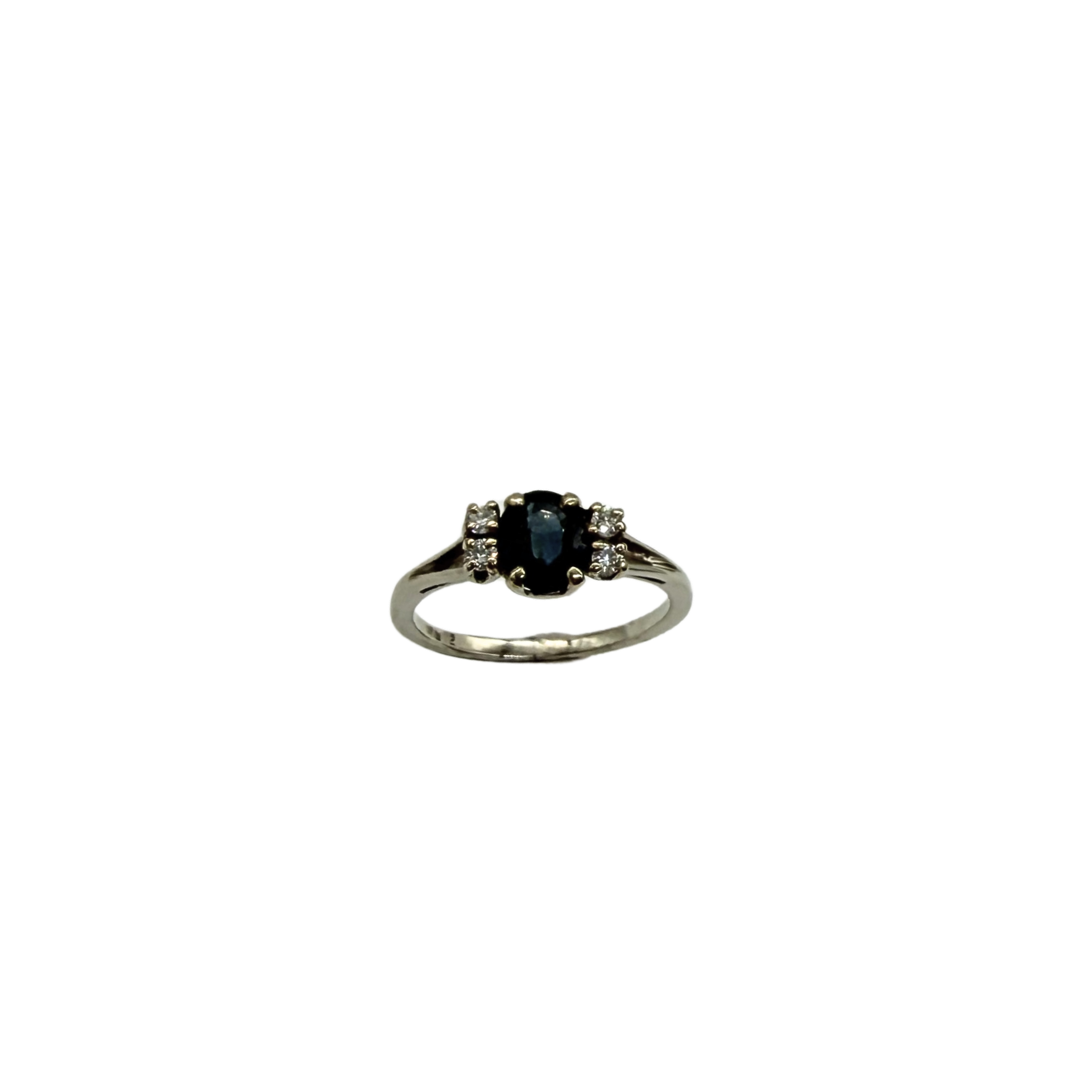 This elegant 14k white gold ring features a deep blue sapphire at its center, accented on each side by sparkling round diamonds totaling 1/10 ctw.