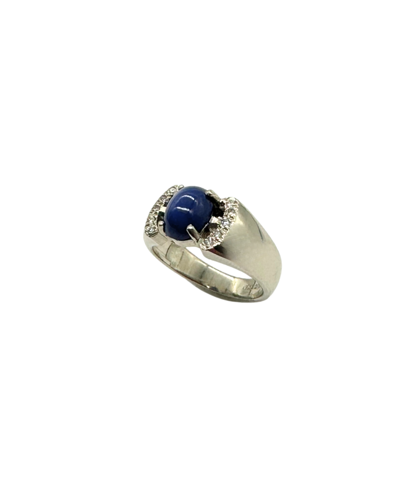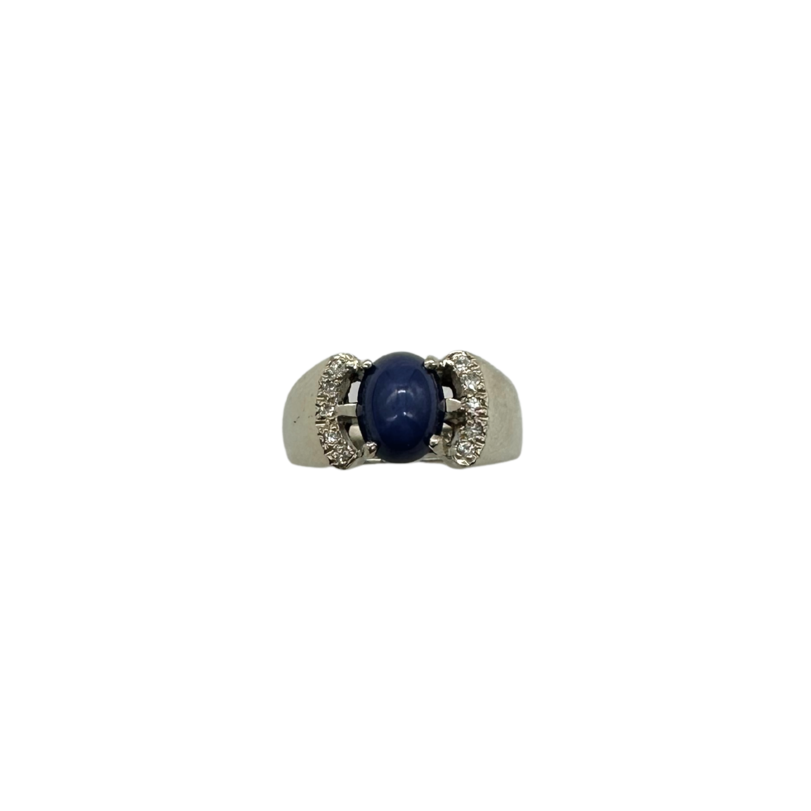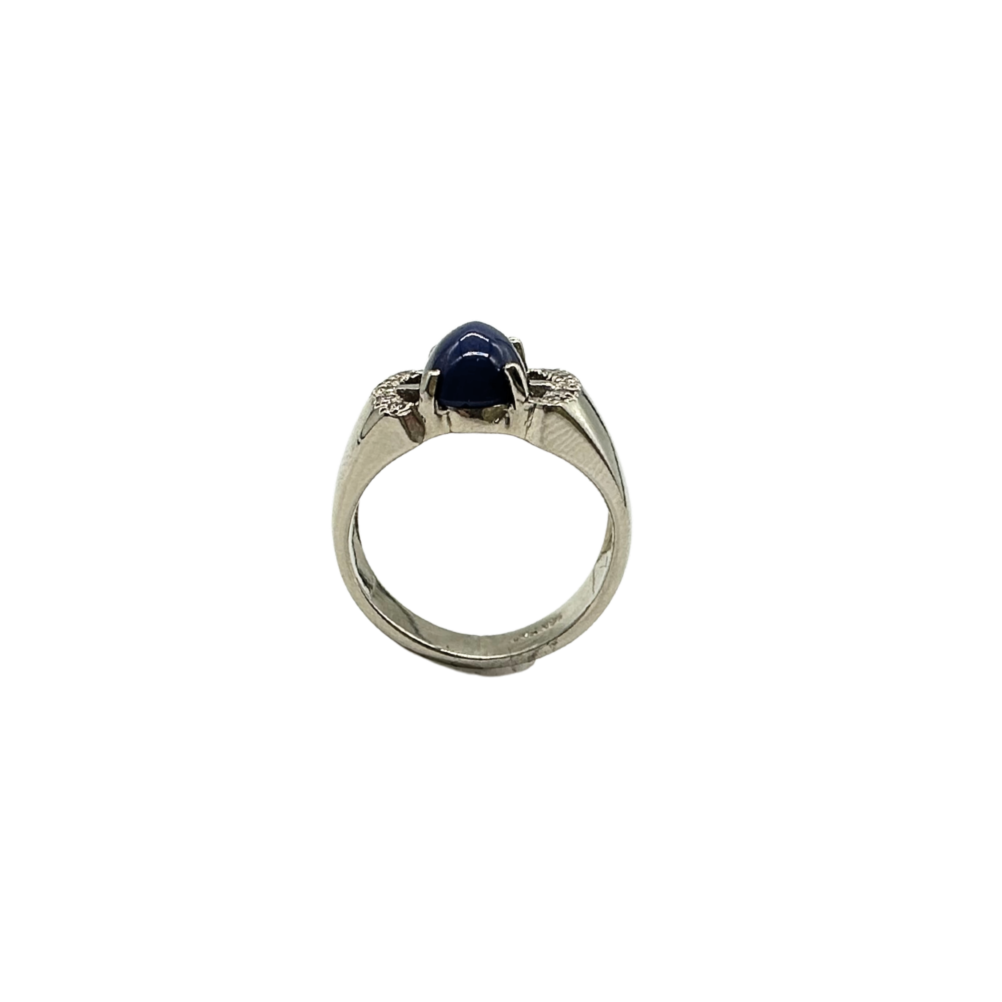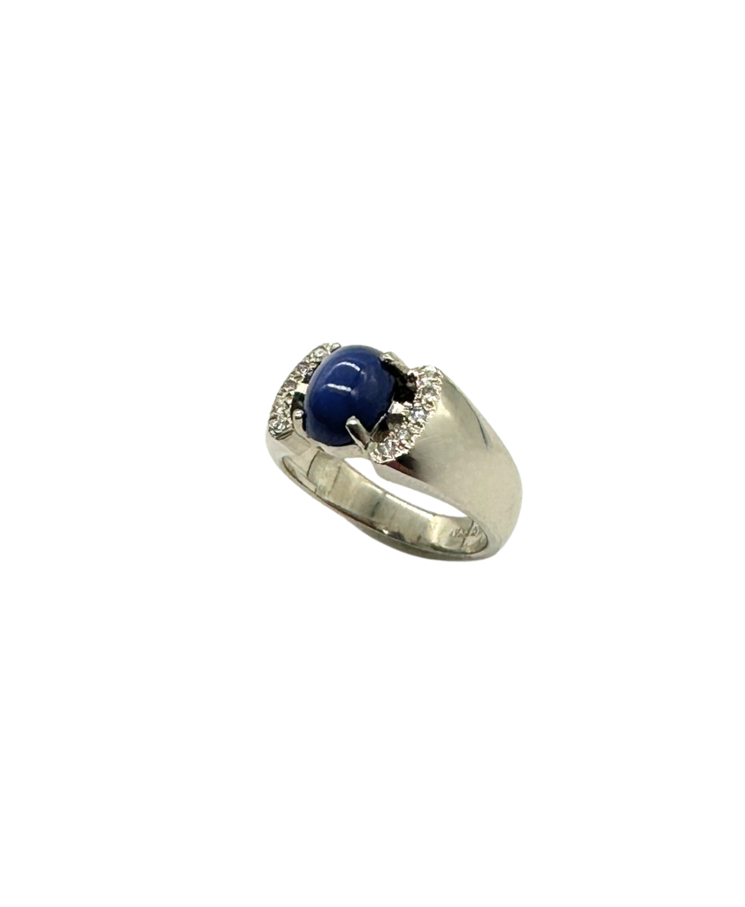 This enchanting ring features a mesmerizing deep blue star sapphire nestled in sleek 14k white gold. Sparkling diamond accents frame the cabochon centerpiece, adding just the right touch of brilliance to its celestial vibe.
