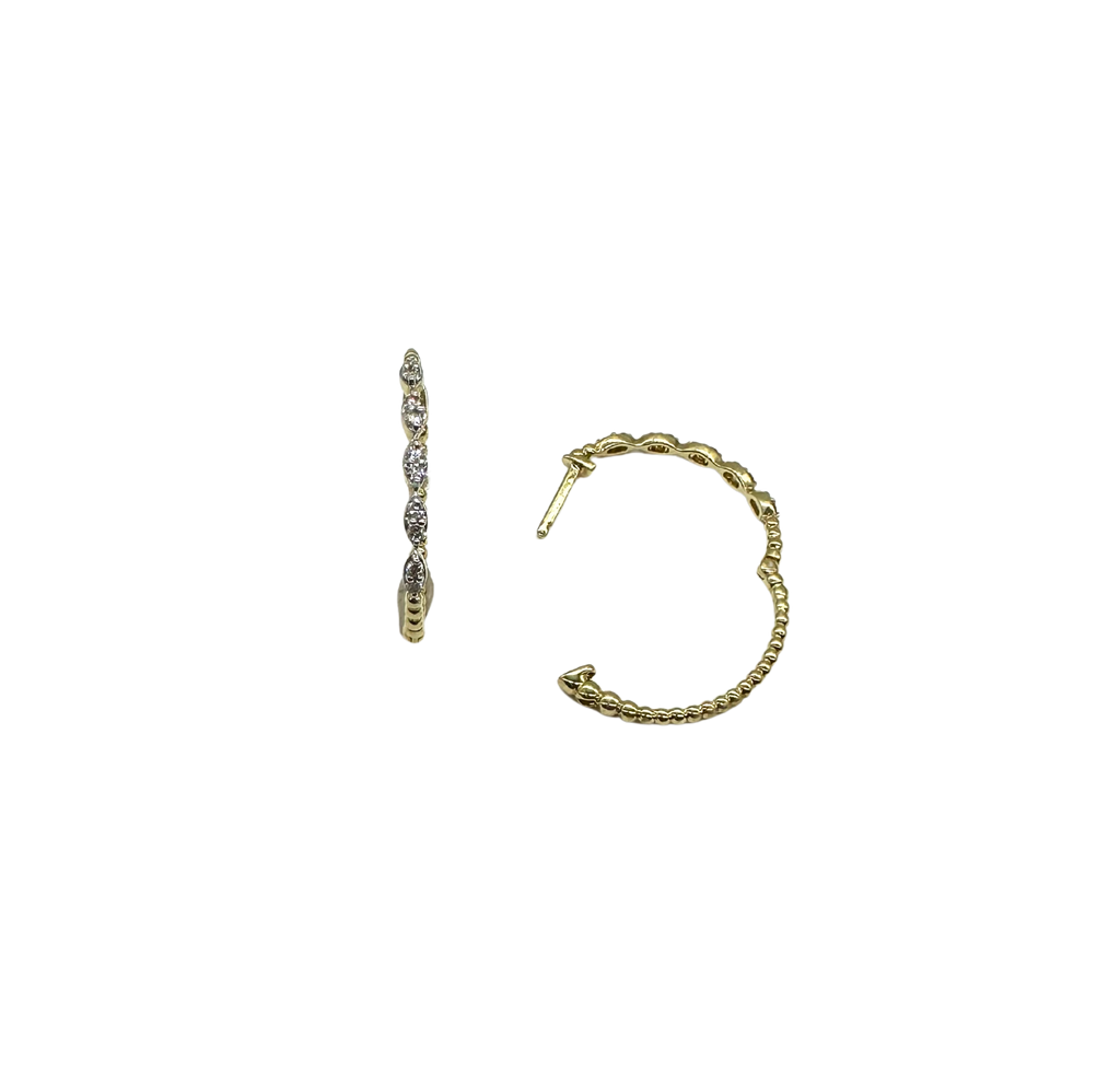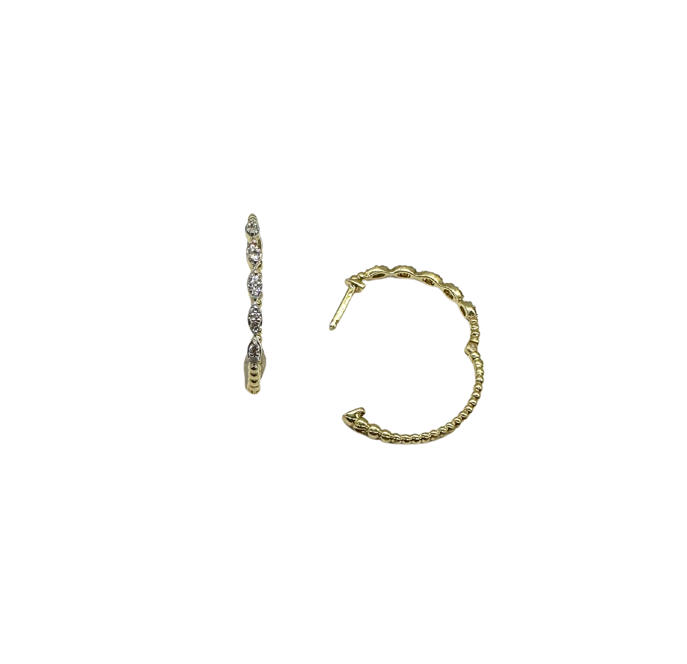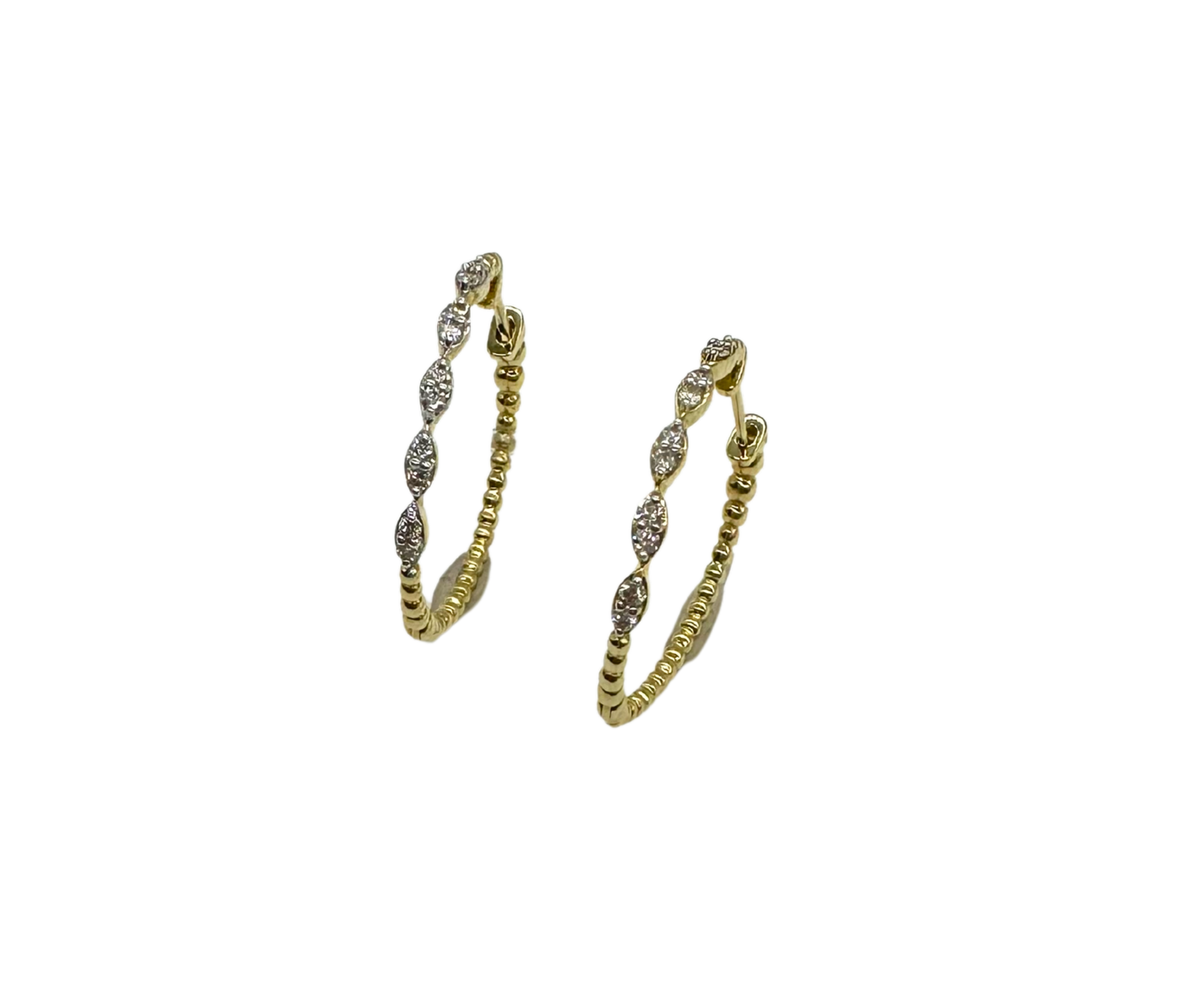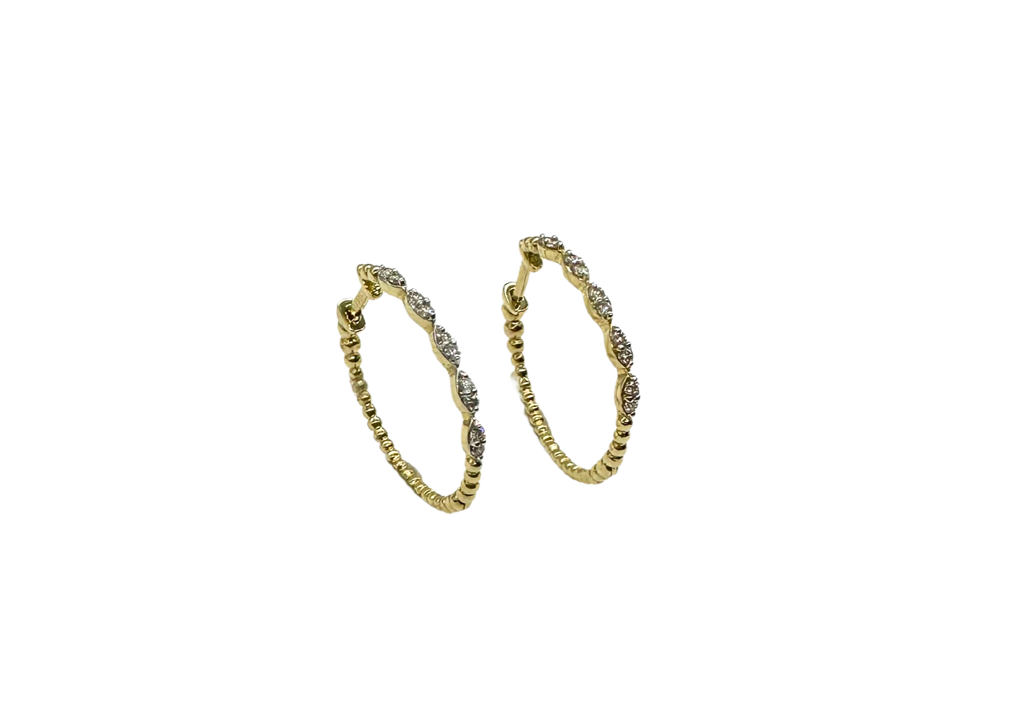 Add a touch of golden charm and diamond shimmer to your everyday look with these exquisite 14k yellow gold hoop earrings. Each earring features a beautifully scalloped edge, lined with marquise-shaped diamond clusters totaling 1/4 carat. The alternating texture of polished gold and diamond accents creates a stunning contrast, offering timeless elegance with just the right amount of sparkle.