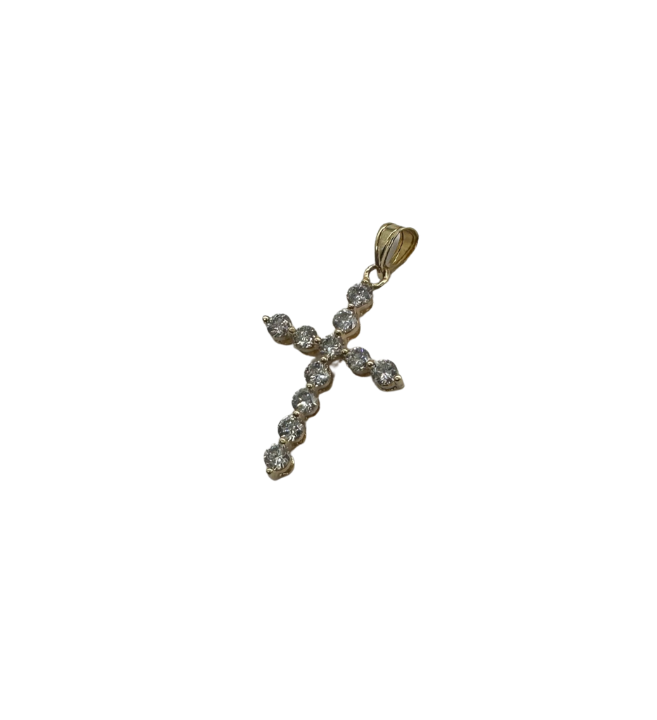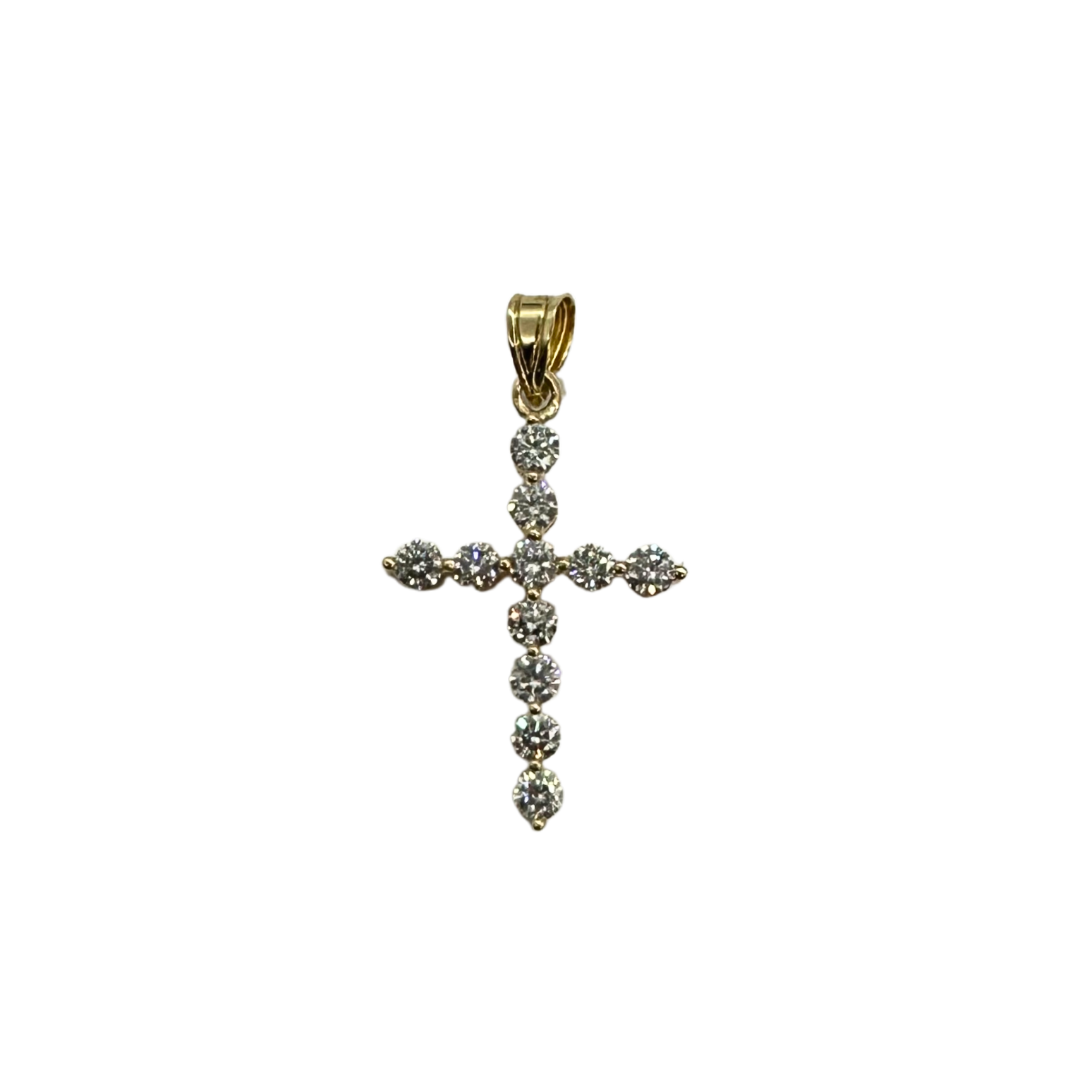 This radiant 14k yellow gold cross pendant captures timeless elegance with a modern edge. Set with 11 brilliant round-cut diamonds totaling 1.5 carats, each stone is prong-set for maximum sparkle.