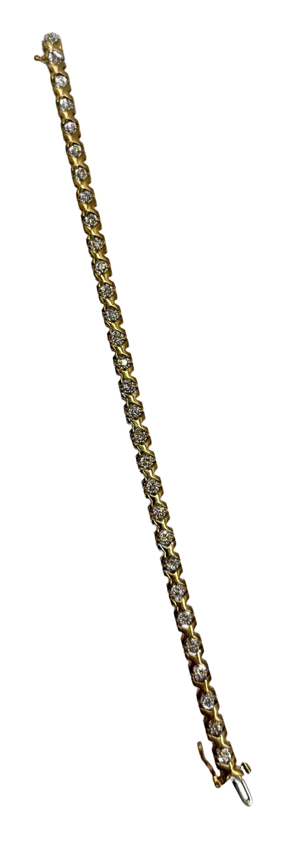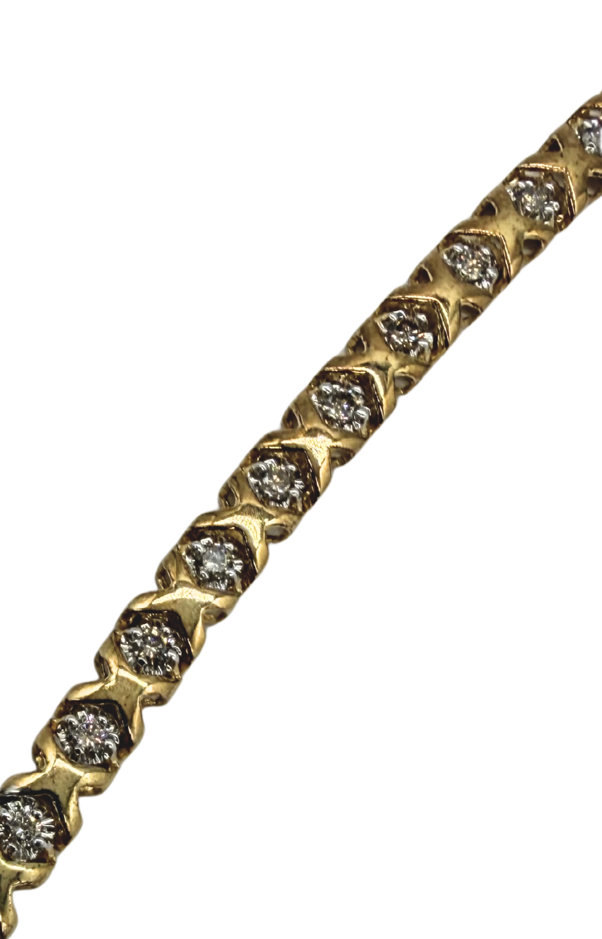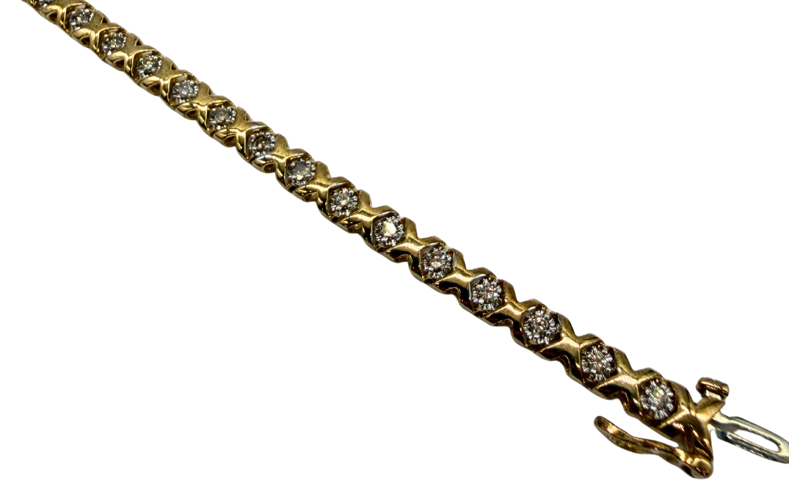 This elegant tennis bracelet features a continuous row of sparkling round diamonds totaling approximately 1 carat in weight, each securely set within beautifully sculpted yellow gold links. The unique textured gold design between each diamond adds depth and visual interest, creating a distinctive look that stands apart from traditional tennis bracelets. The diamonds provide brilliant shimmer while the warm yellow gold enhances their natural brilliance.