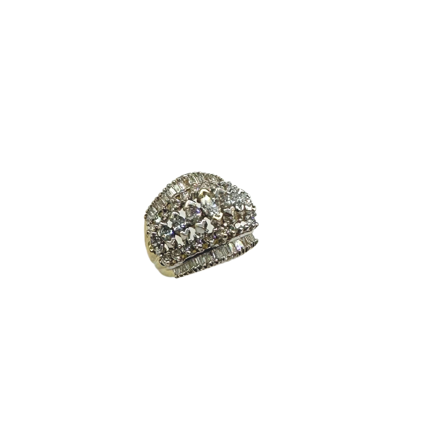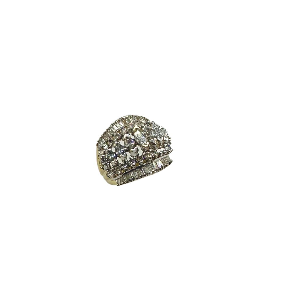 This dazzling statement ring features an intricate 5-row design set with a stunning combination of marquise, round, and baguette cut diamonds. Crafted in 14k yellow gold and weighing 10.8 grams, the piece boasts a total diamond weight of 2.5 carats.