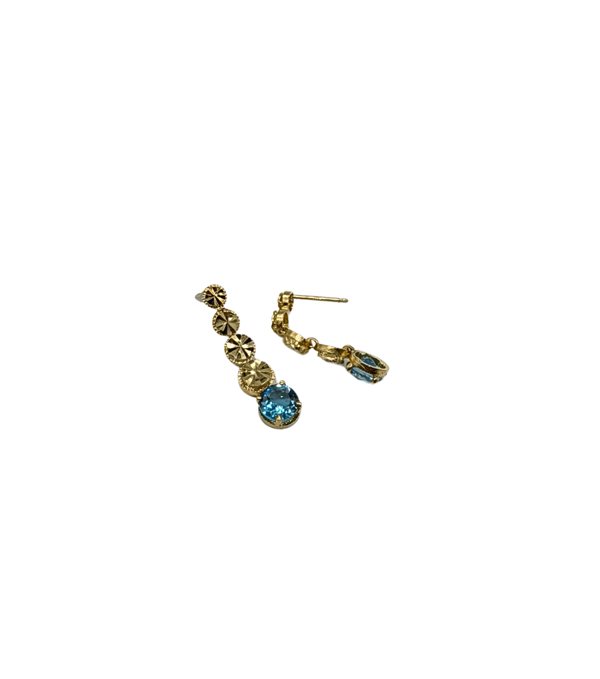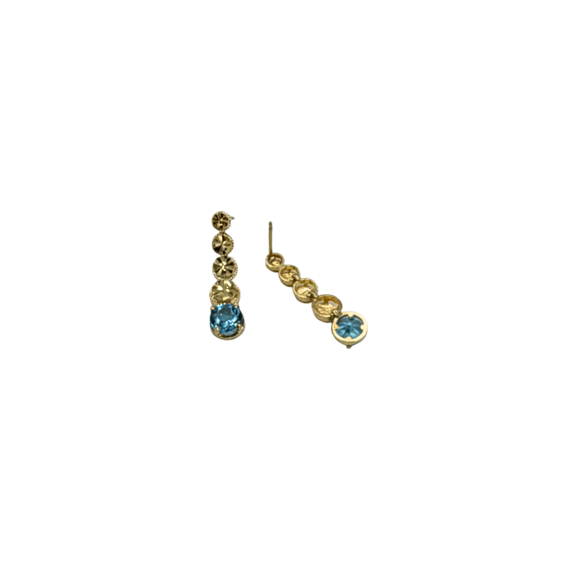 These elegant drop earrings are crafted in solid 14k yellow gold and feature vibrant blue topaz stones that add just the right pop of color. Each earring showcases a classic stud-style drop design, with textured gold accents that give them a subtle vintage-inspired look while still feeling timeless and refined.