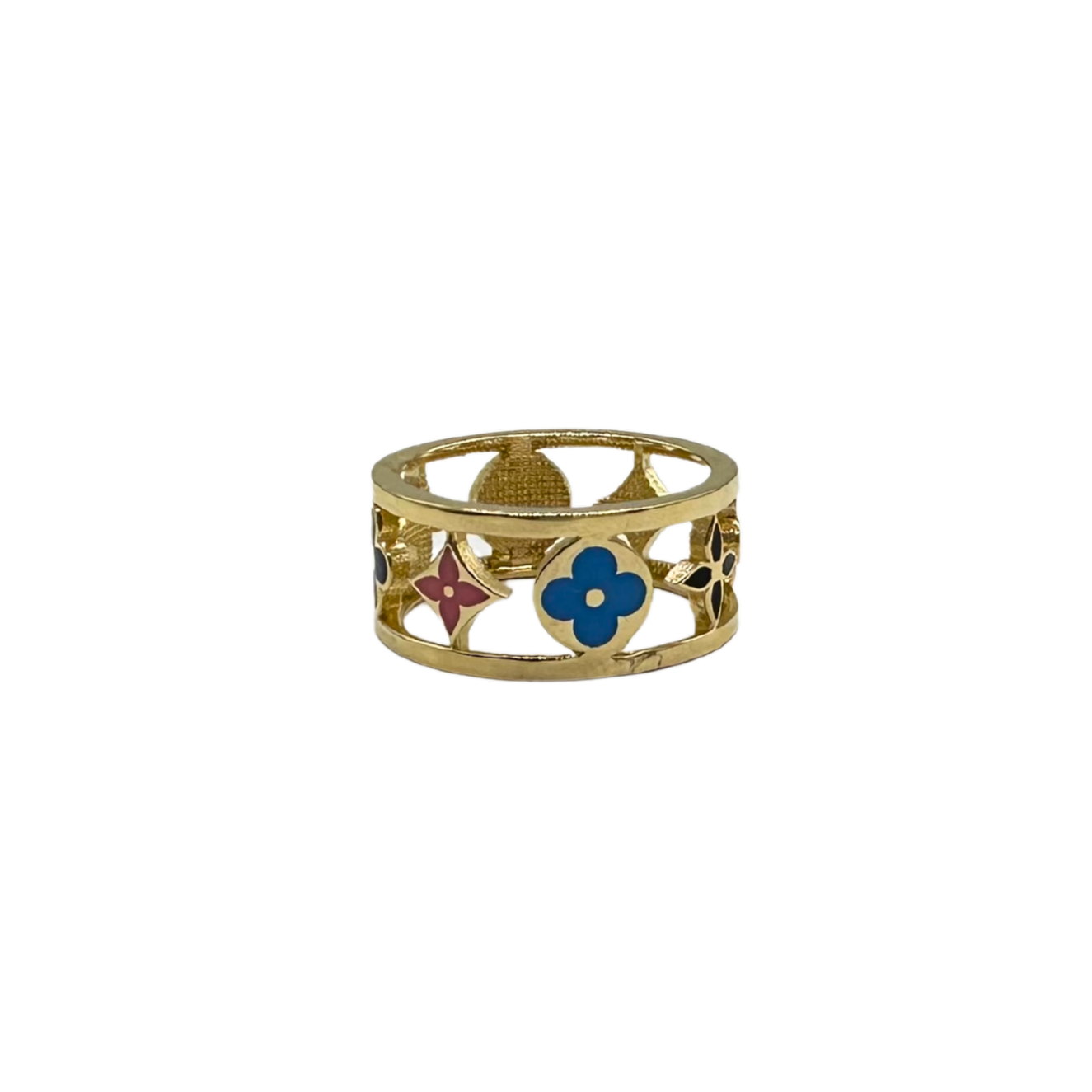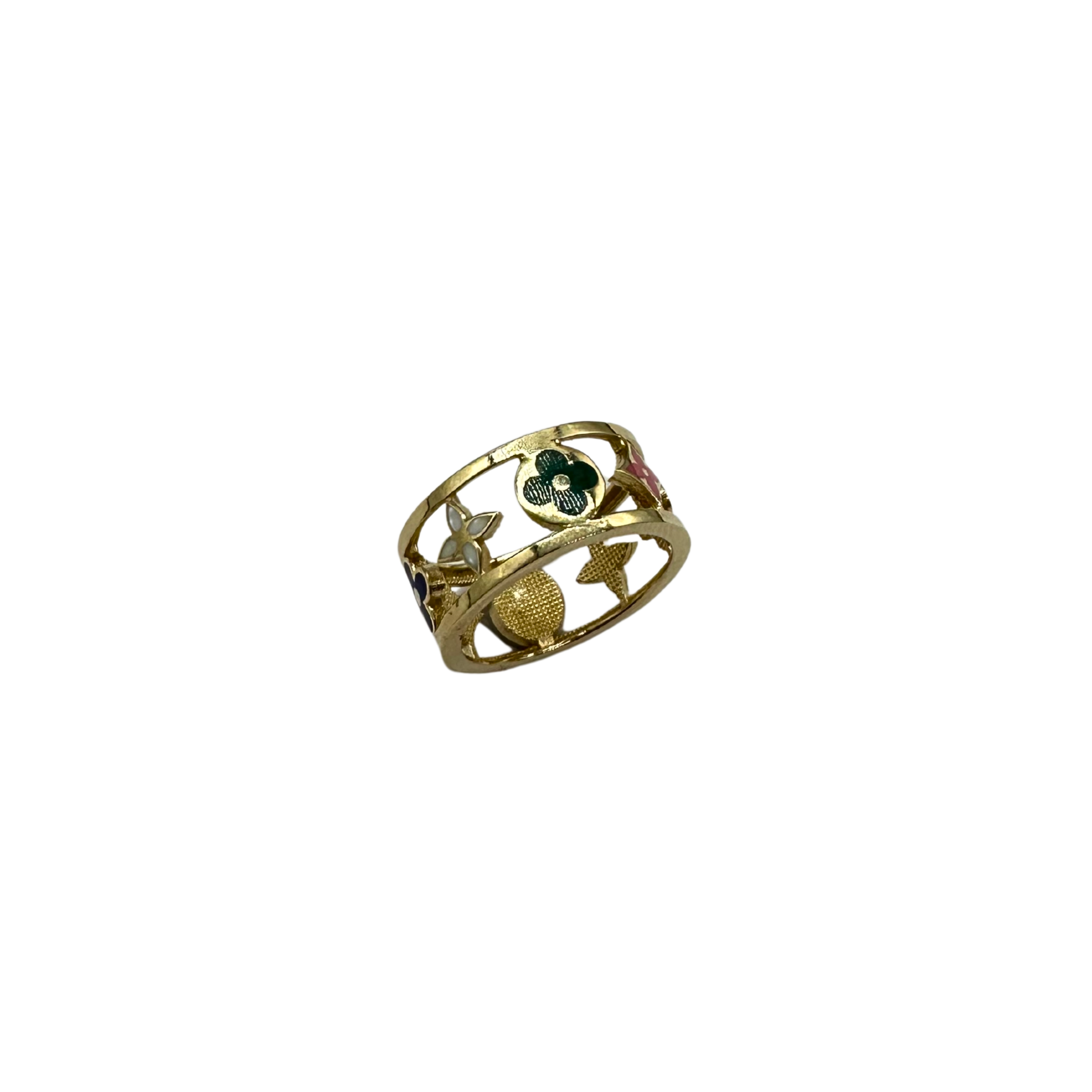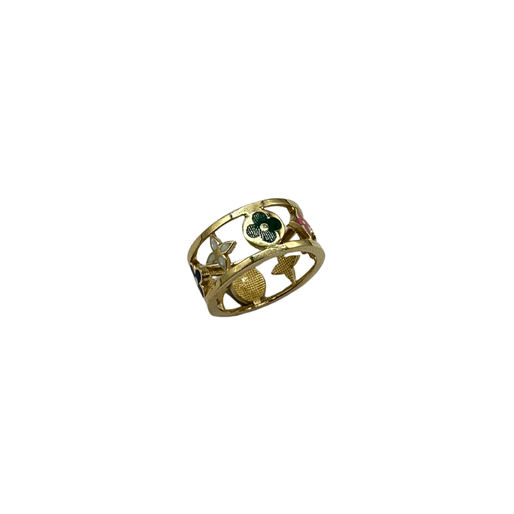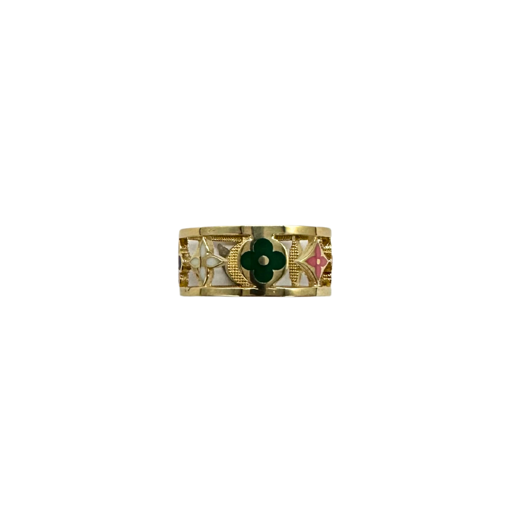 Crafted in 14k yellow gold, this wide band features a vibrant array of monogram-inspired cutout motifs filled with colorful enamel accents. The design blends playful color with fine gold craftsmanship, making it a unique and eye-catching piece.