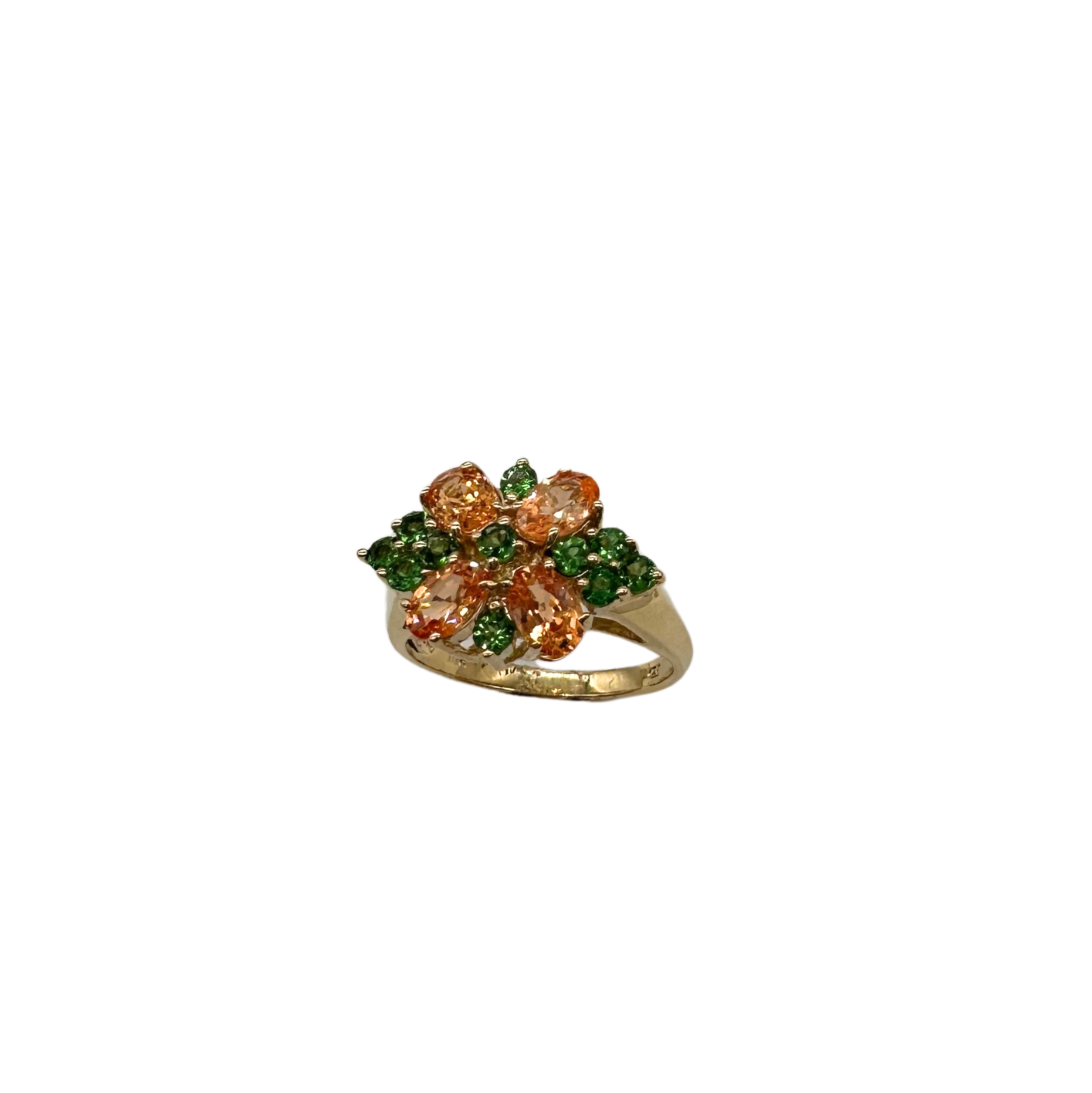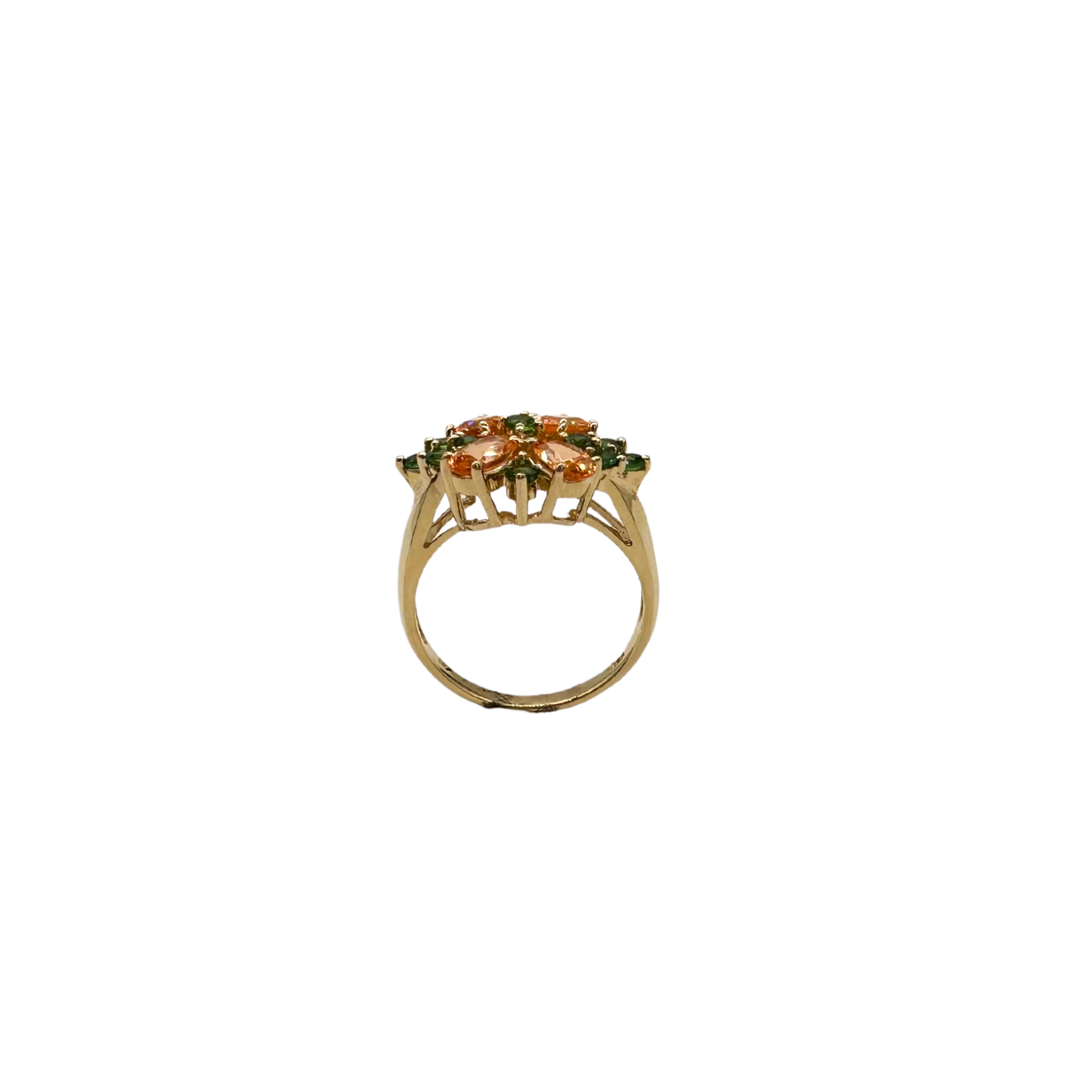 Vibrant and full of life, this 14k yellow gold ring showcases a floral motif crafted from rich oval-cut citrines and vivid green emeralds. The warm golden hue of the citrine petals contrasts beautifully with the deep green accents, creating a striking design that radiates natural elegance. Perfect for adding a burst of color to any collection.