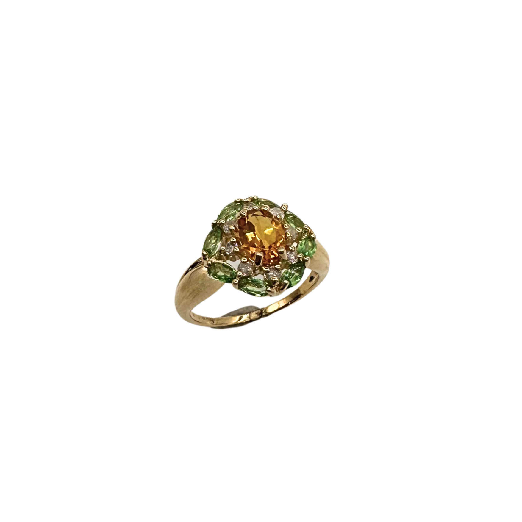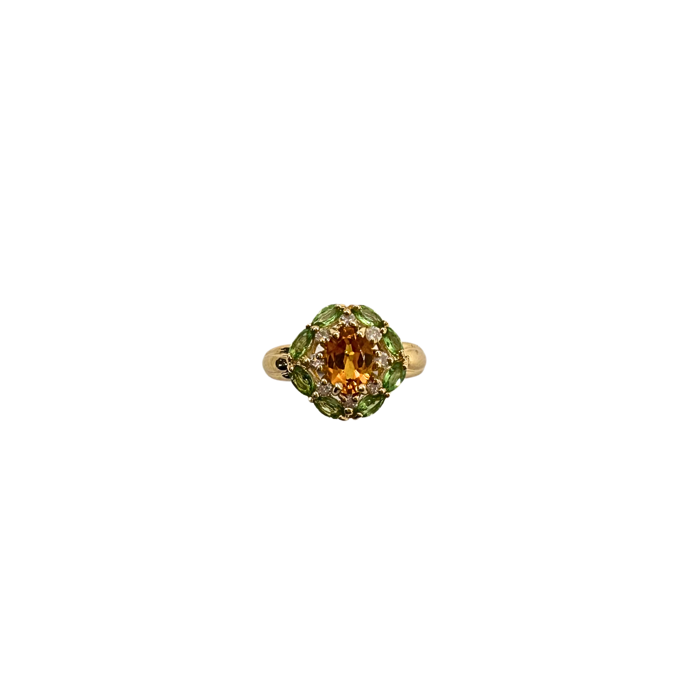 This radiant 14k yellow gold ring features a warm, golden-orange oval citrine at its center, glowing with fiery brilliance. Surrounding it is a halo of vivid green quartz stones, creating a beautiful contrast that evokes the colors of autumn. Sparkling diamond accents are delicately placed between the stones, adding a touch of elegance and light-catching brilliance. A bold yet feminine piece perfect for adding color and charm to any outfit.