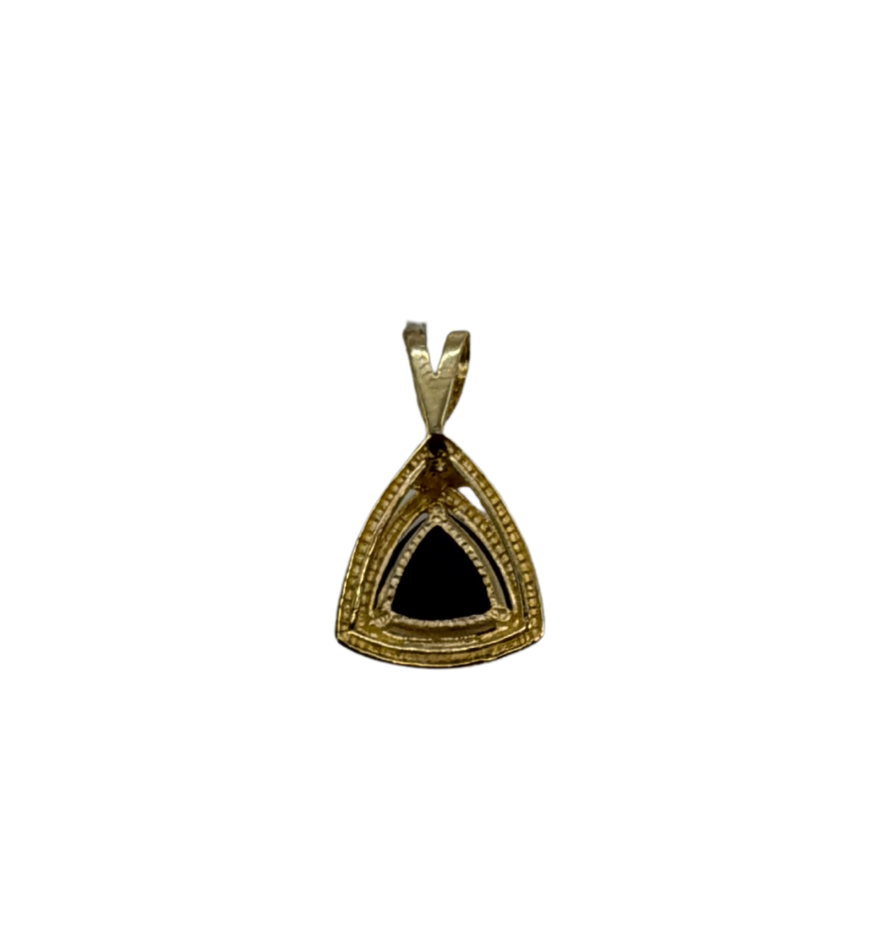 This elegant pendant features a bold trillion-cut black onyx set in rich 14k yellow gold, offering a striking contrast and timeless appeal. The onyx is securely framed in a classic prong setting, allowing its deep, glossy black surface to take center stage. A delicate diamond accent at the bail adds just the right touch of sparkle, giving this piece a refined finish without overpowering the design.