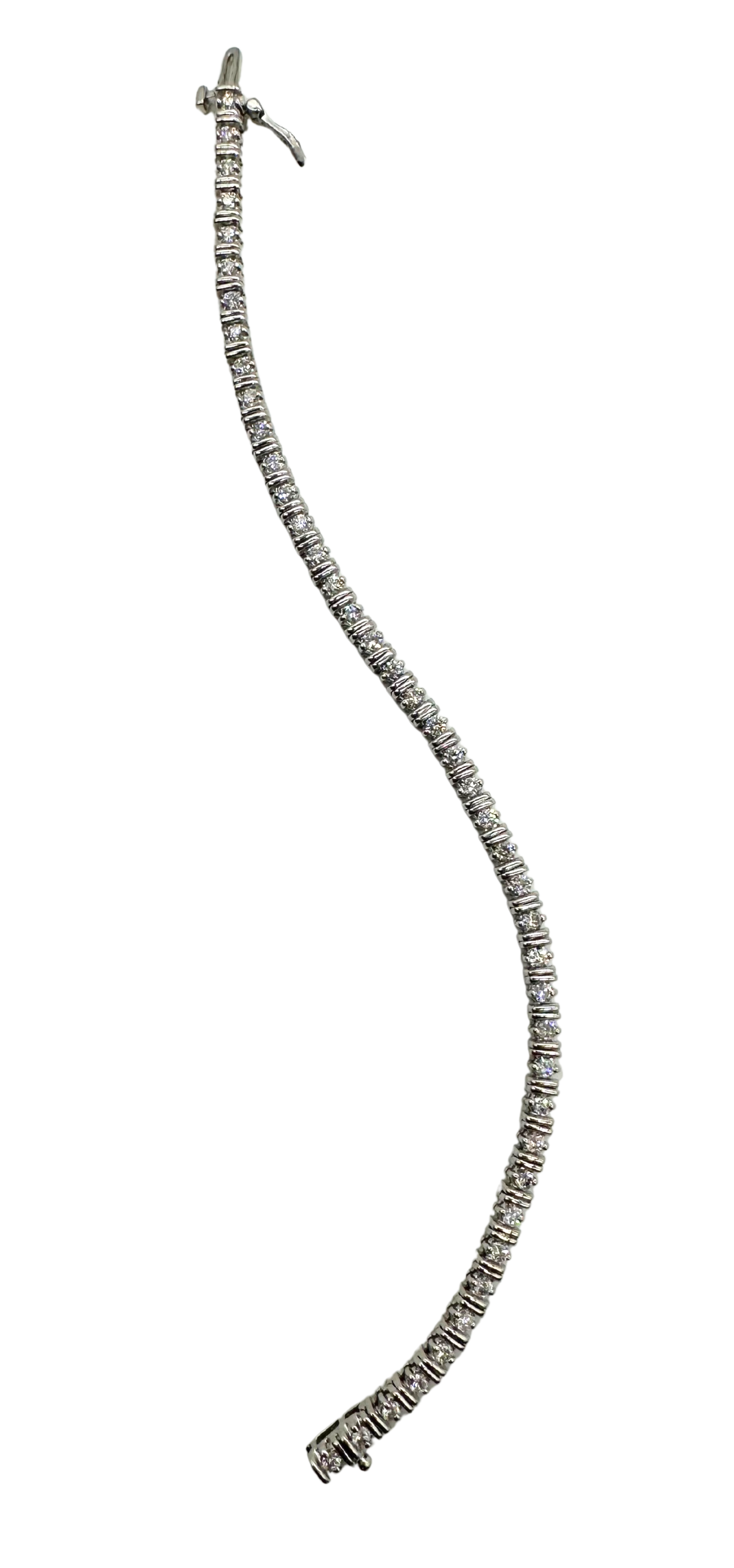 Indulge in timeless sophistication with this luxurious 18k white gold tennis bracelet, designed with a unique double-bar setting that beautifully showcases approximately 2 carats total weight of dazzling round brilliant diamonds.