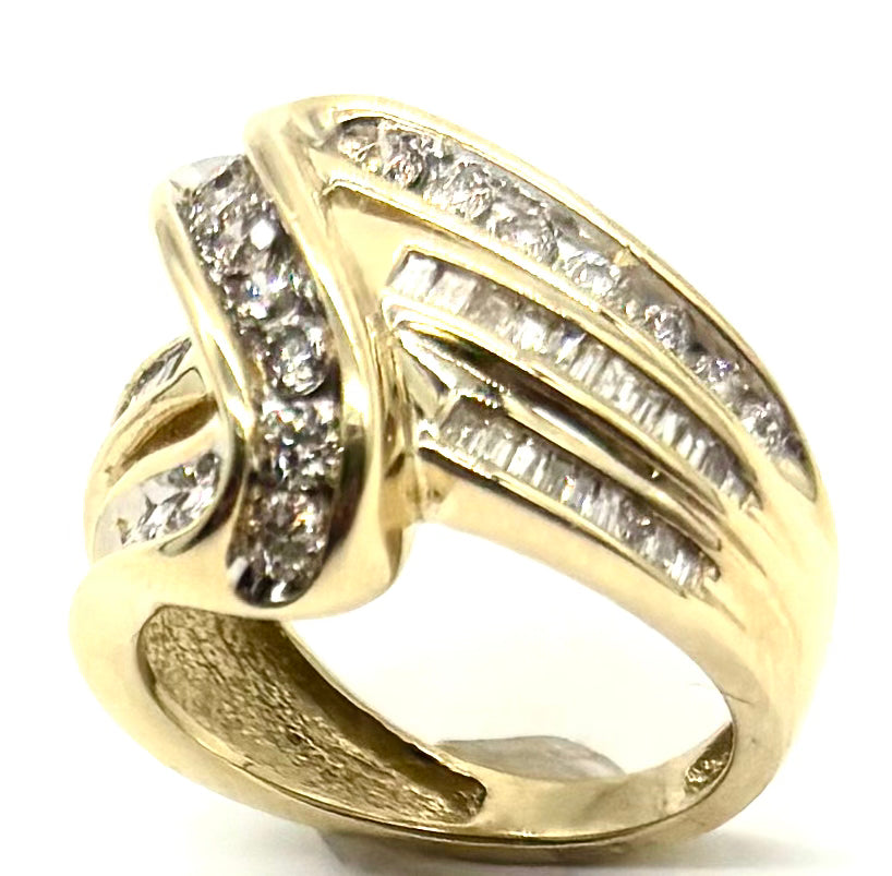 1CTW Diamond 3 Row Crossover Ring- 10K Yellow Gold