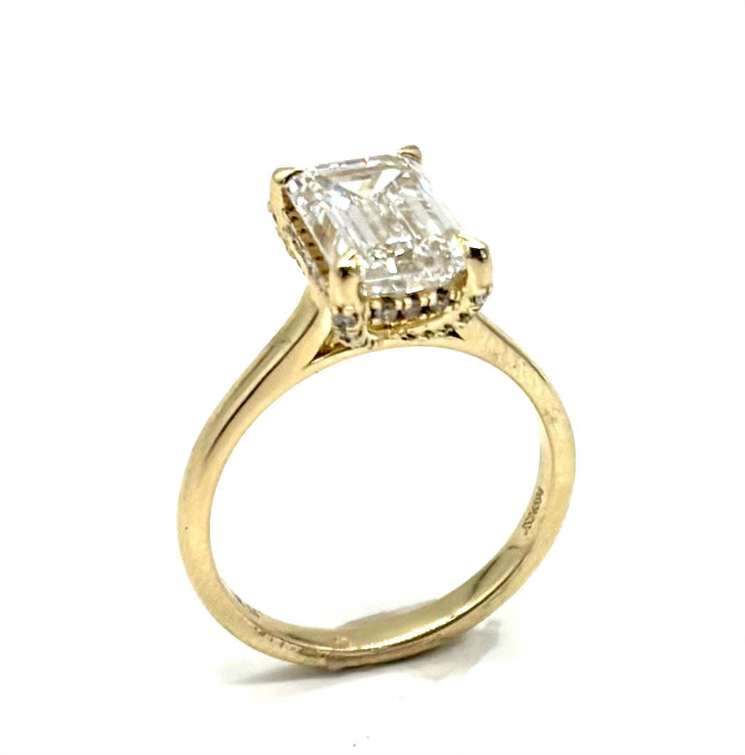 Make a bold and elegant statement with this stunning emerald-cut lab grown diamond ring. Crafted in rich 14K yellow gold, this timeless design features a breathtaking 3.00 carat emerald-cut center stone, celebrated for its clean lines and sophisticated sparkle. A delicate hidden halo of lab grown diamond accents adds subtle brilliance from every angle, enhancing the ring’s overall radiance without distracting from the center stone.
