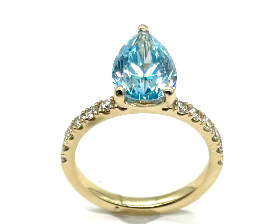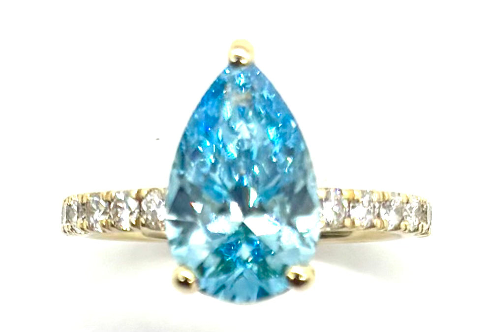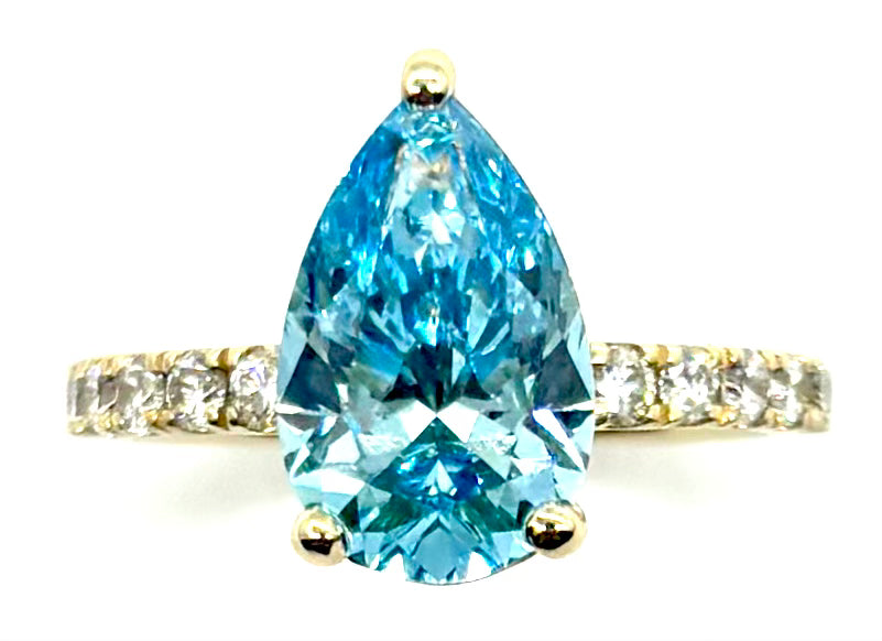 3.67 CTW Lab Diamond Pear Shaped Blue Diamond Ring – 14K Yellow Gold – Size 7