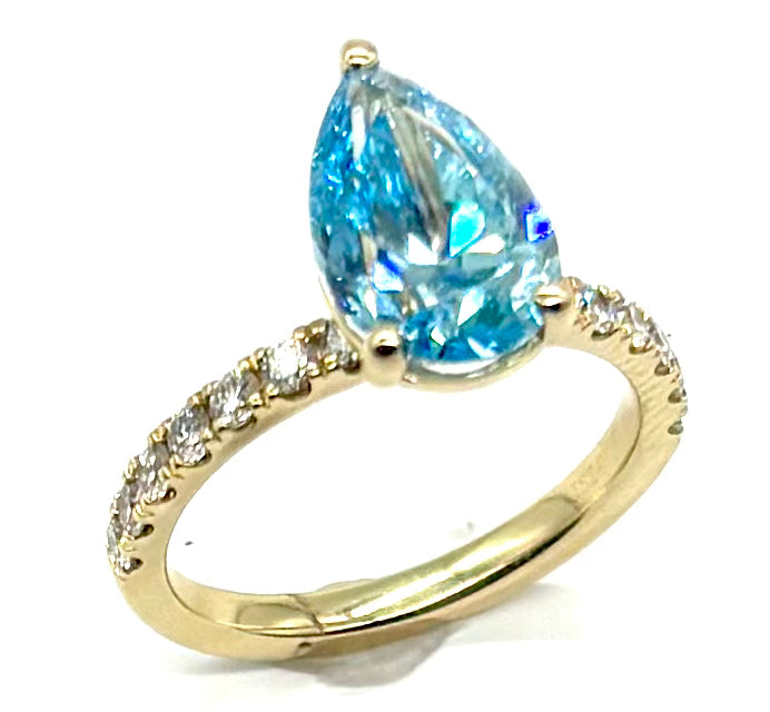3.67 CTW Lab Diamond Pear Shaped Blue Diamond Ring-14K Yellow Gold